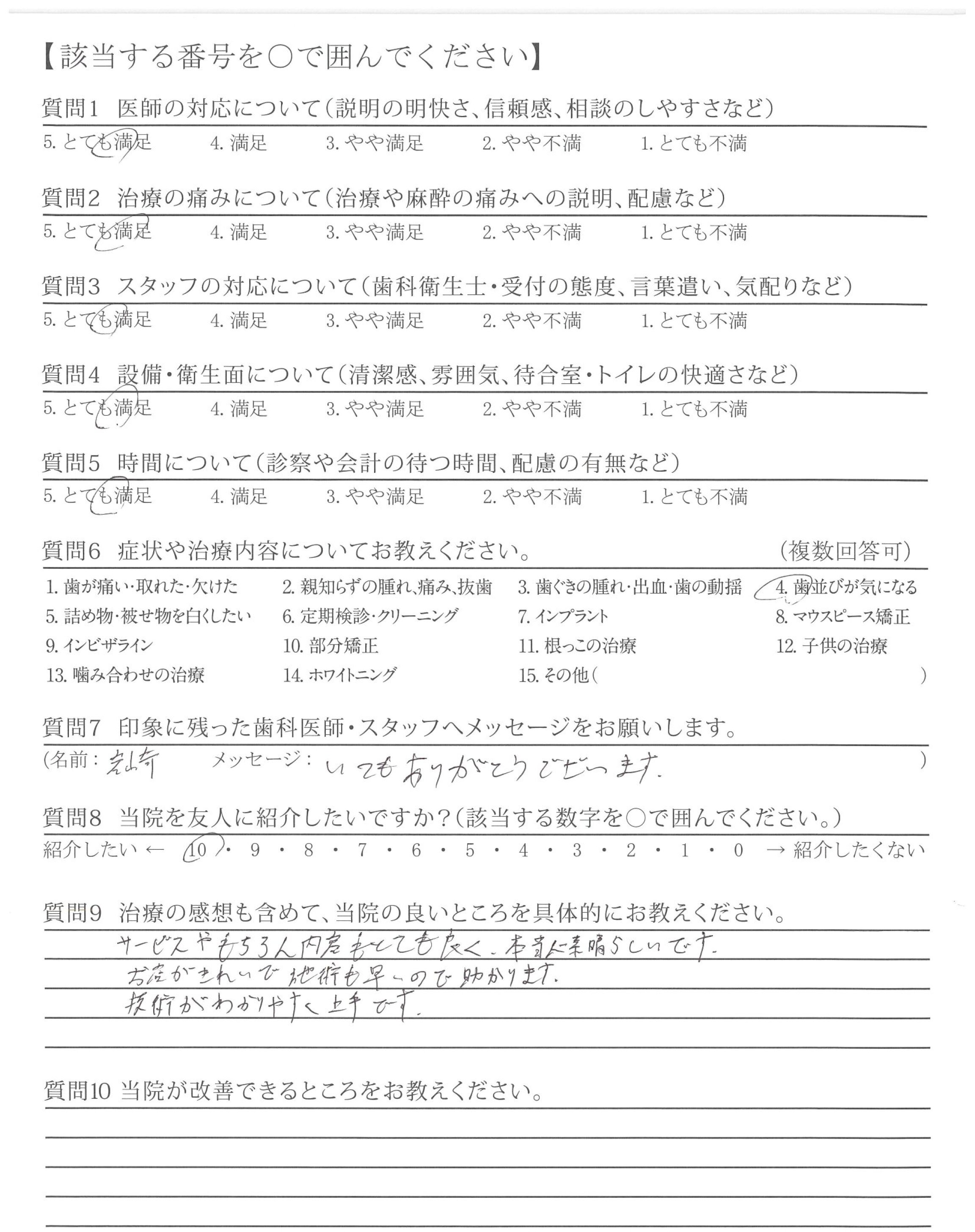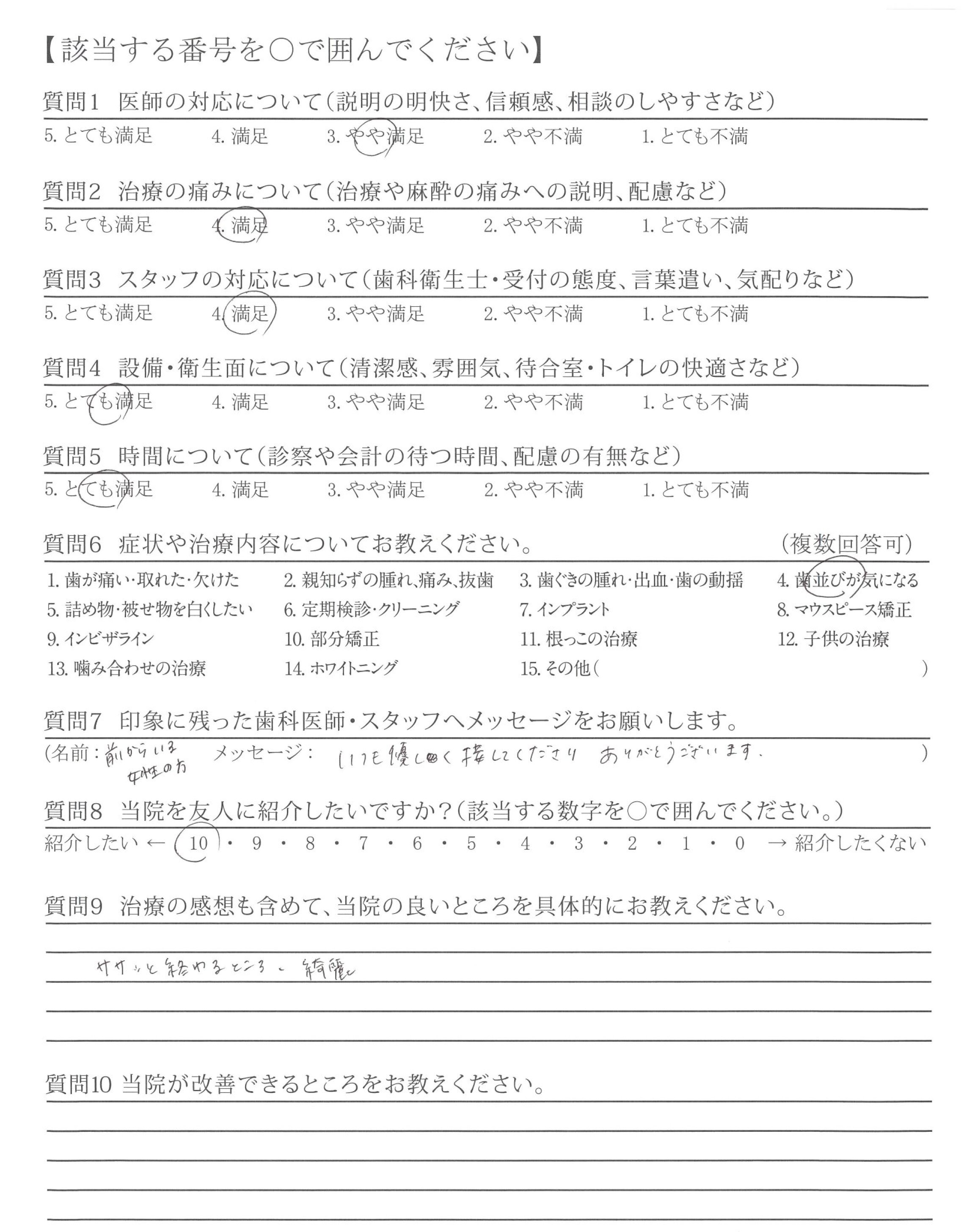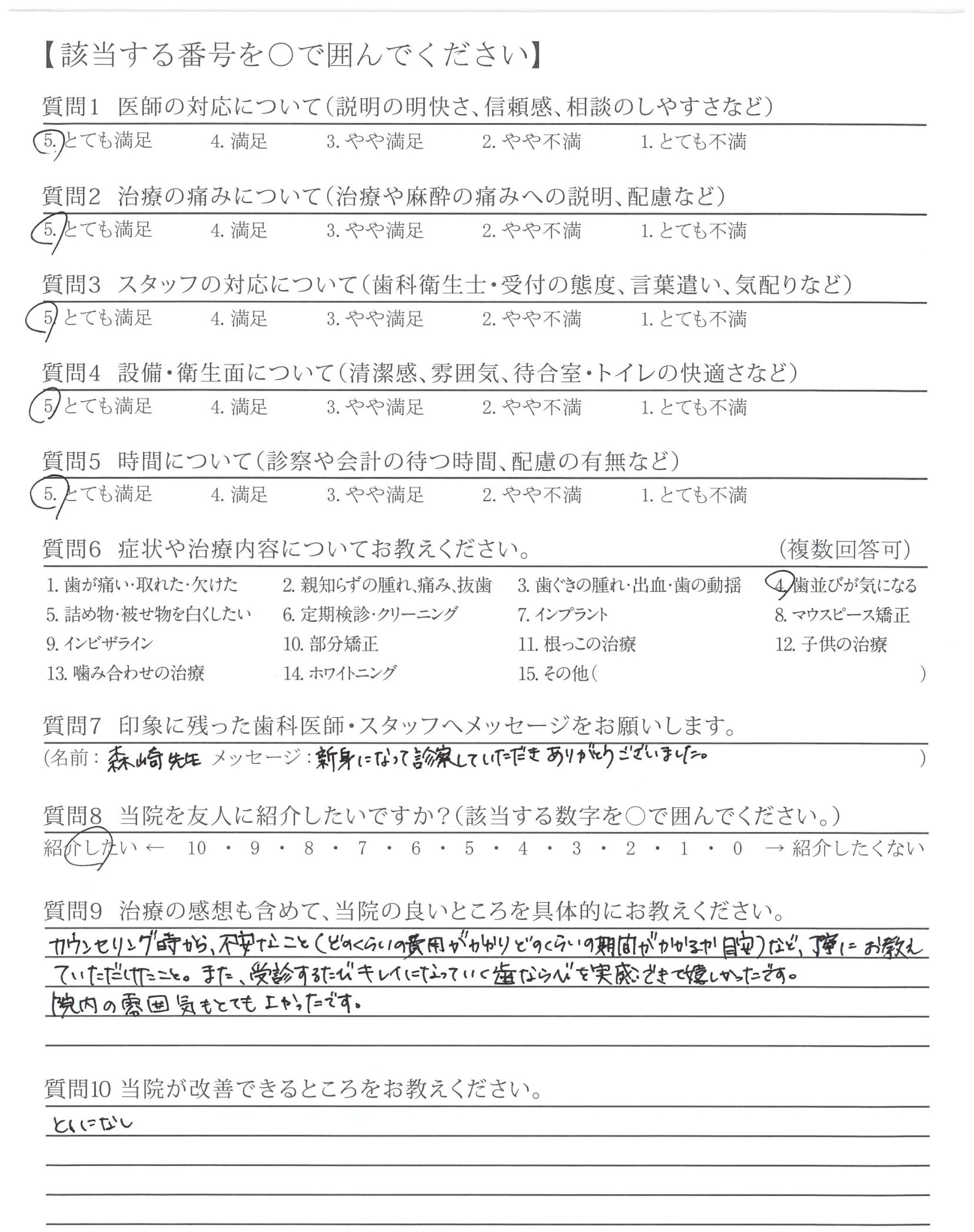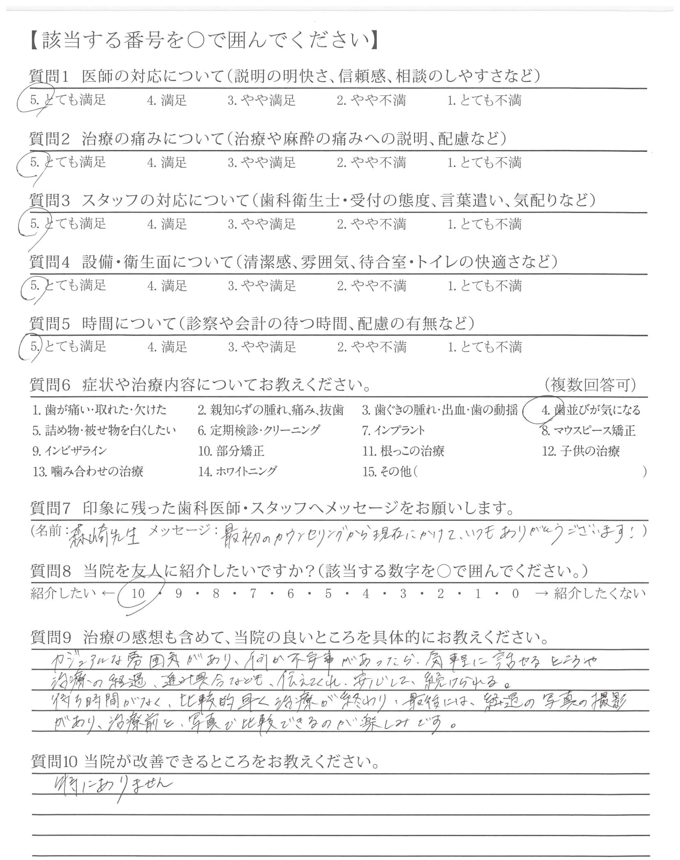 カウンセリング時から、不安なこと(どのくらいの費用がかかりどのくらいの期間がかかるか目安)など、丁寧にお教えていただけたこと。また、受診するたびキレイになっていく歯ならびを実感できて嬉しかったです。