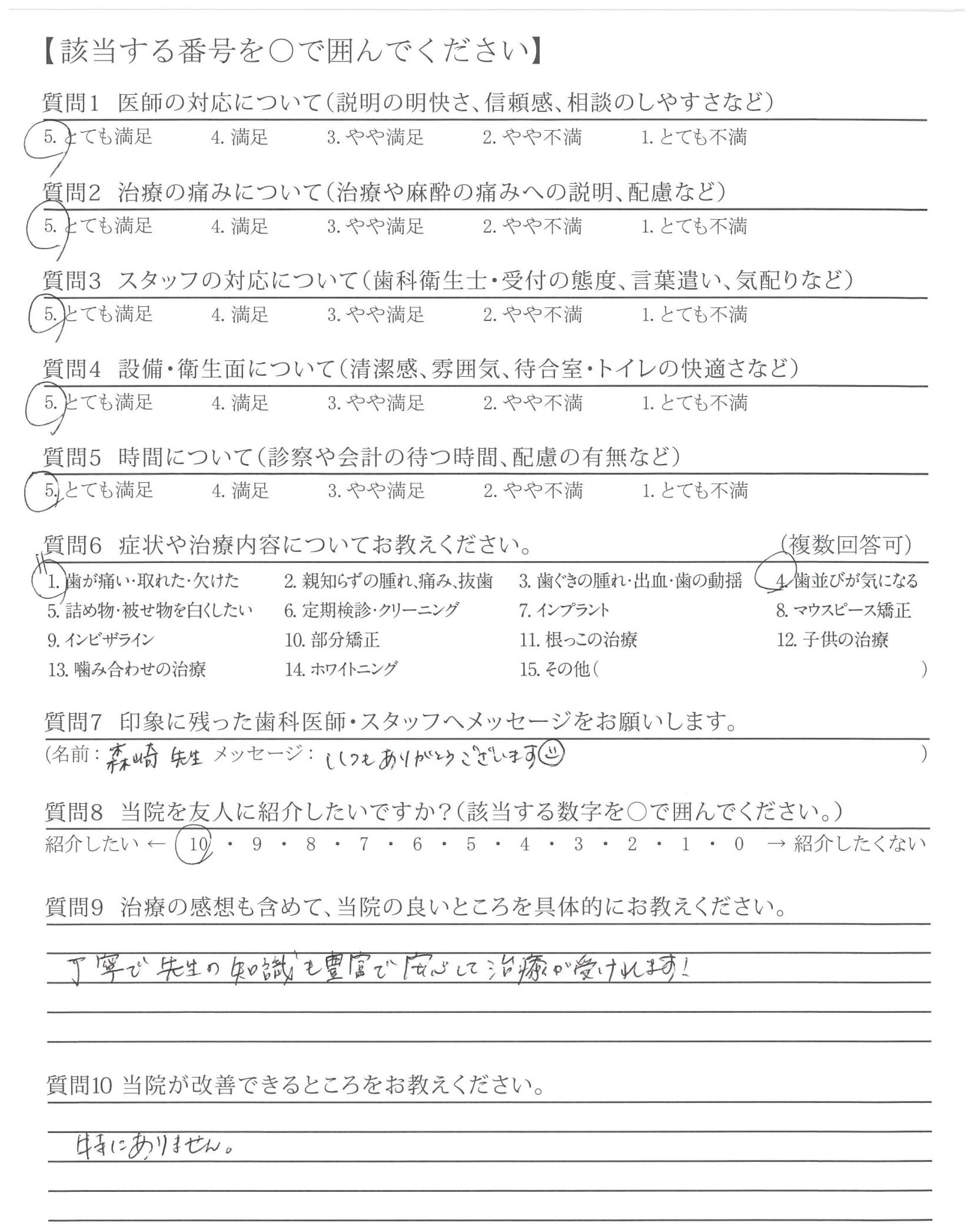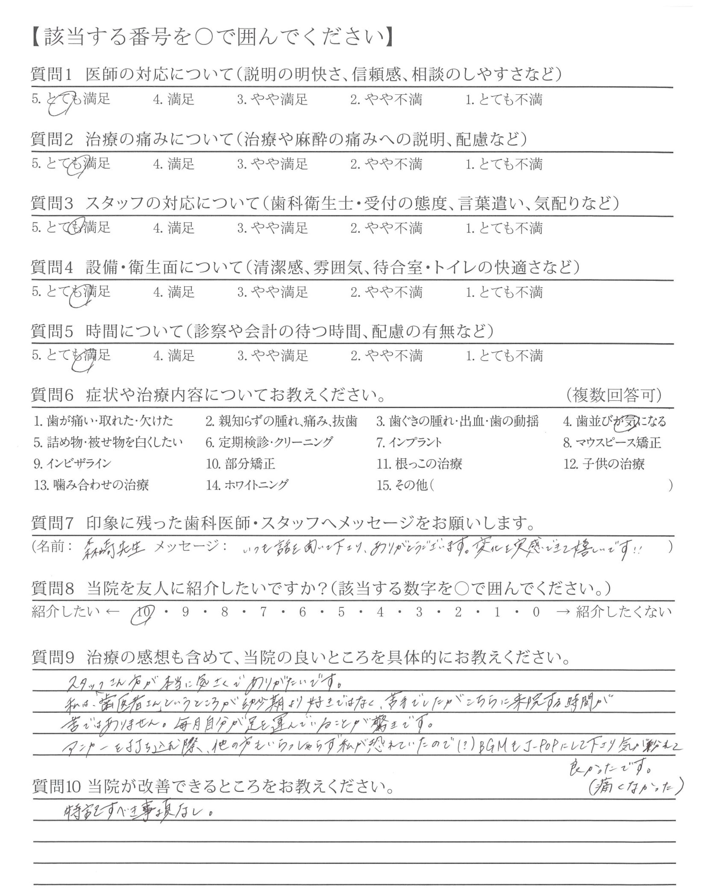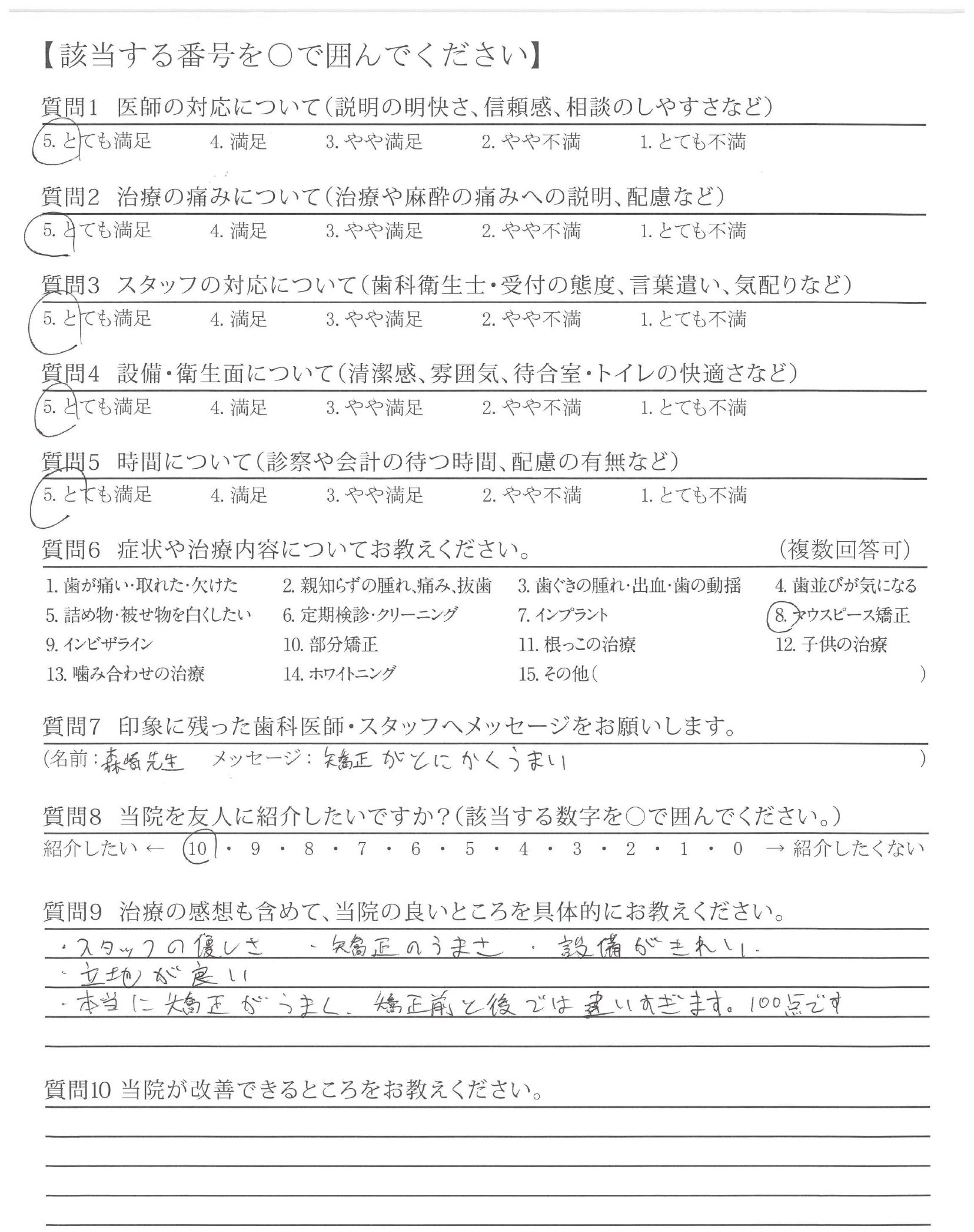 カウンセリング時から、不安なこと(どのくらいの費用がかかりどのくらいの期間がかかるか目安)など、丁寧にお教えていただけたこと。また、受診するたびキレイになっていく歯ならびを実感できて嬉しかったです。