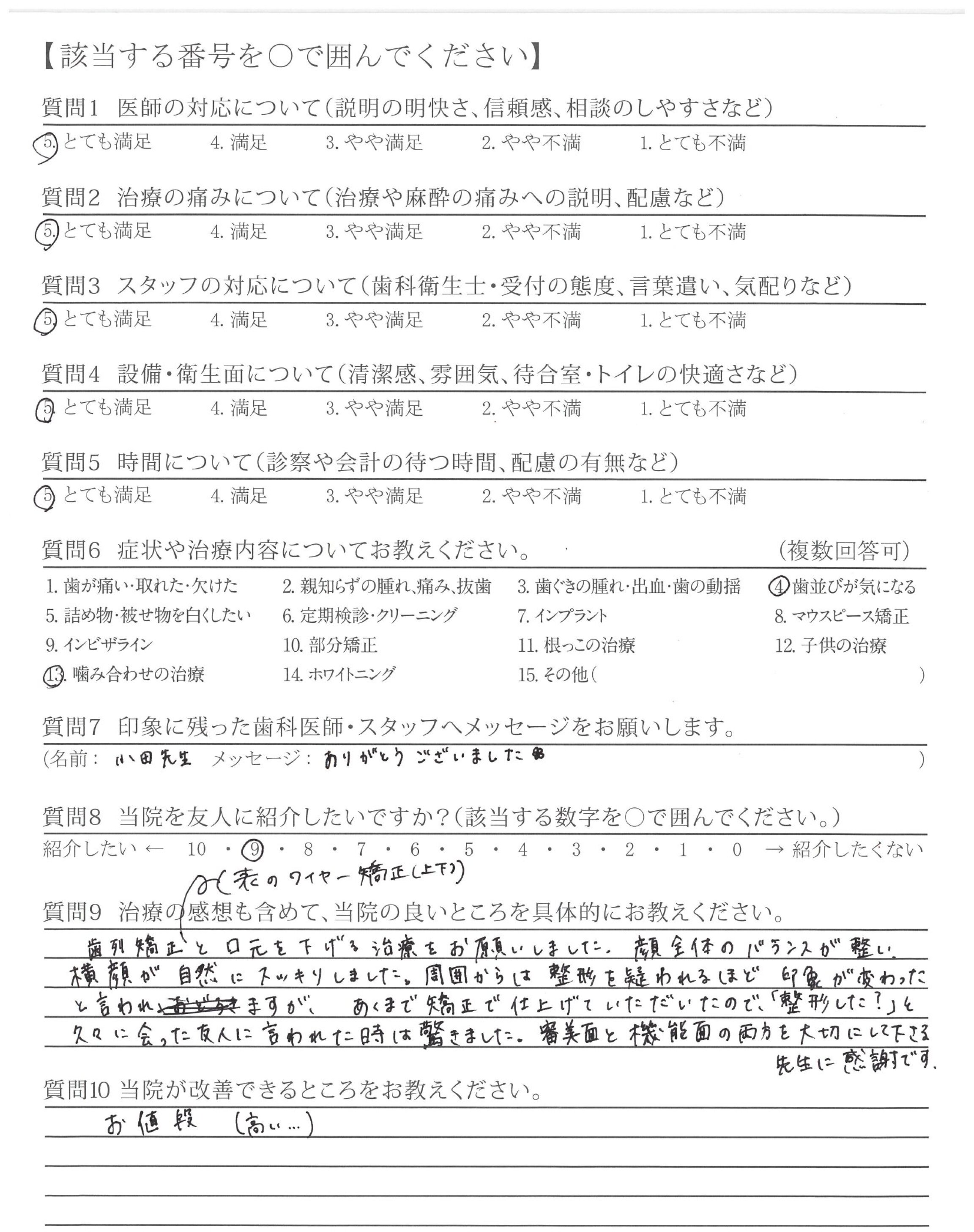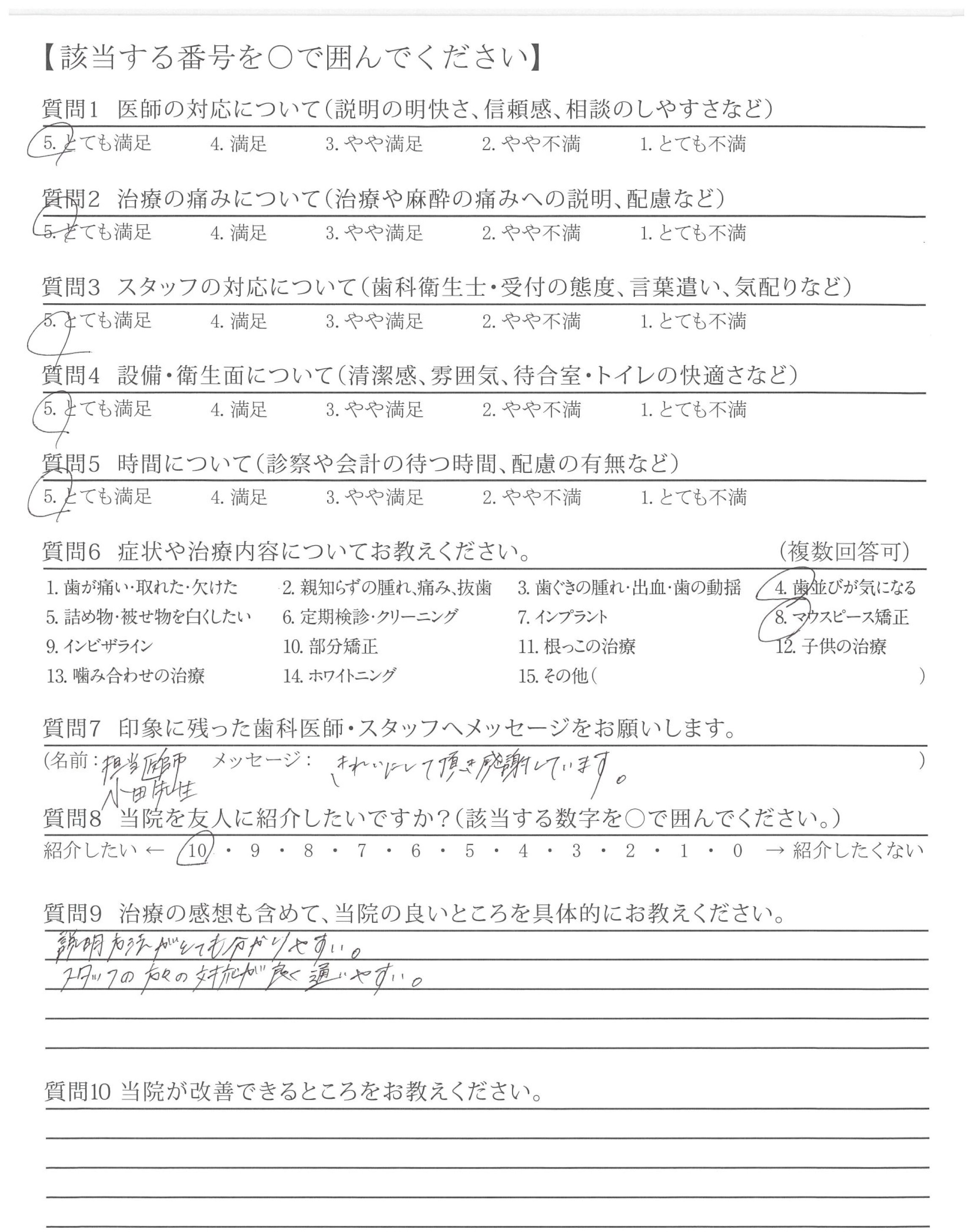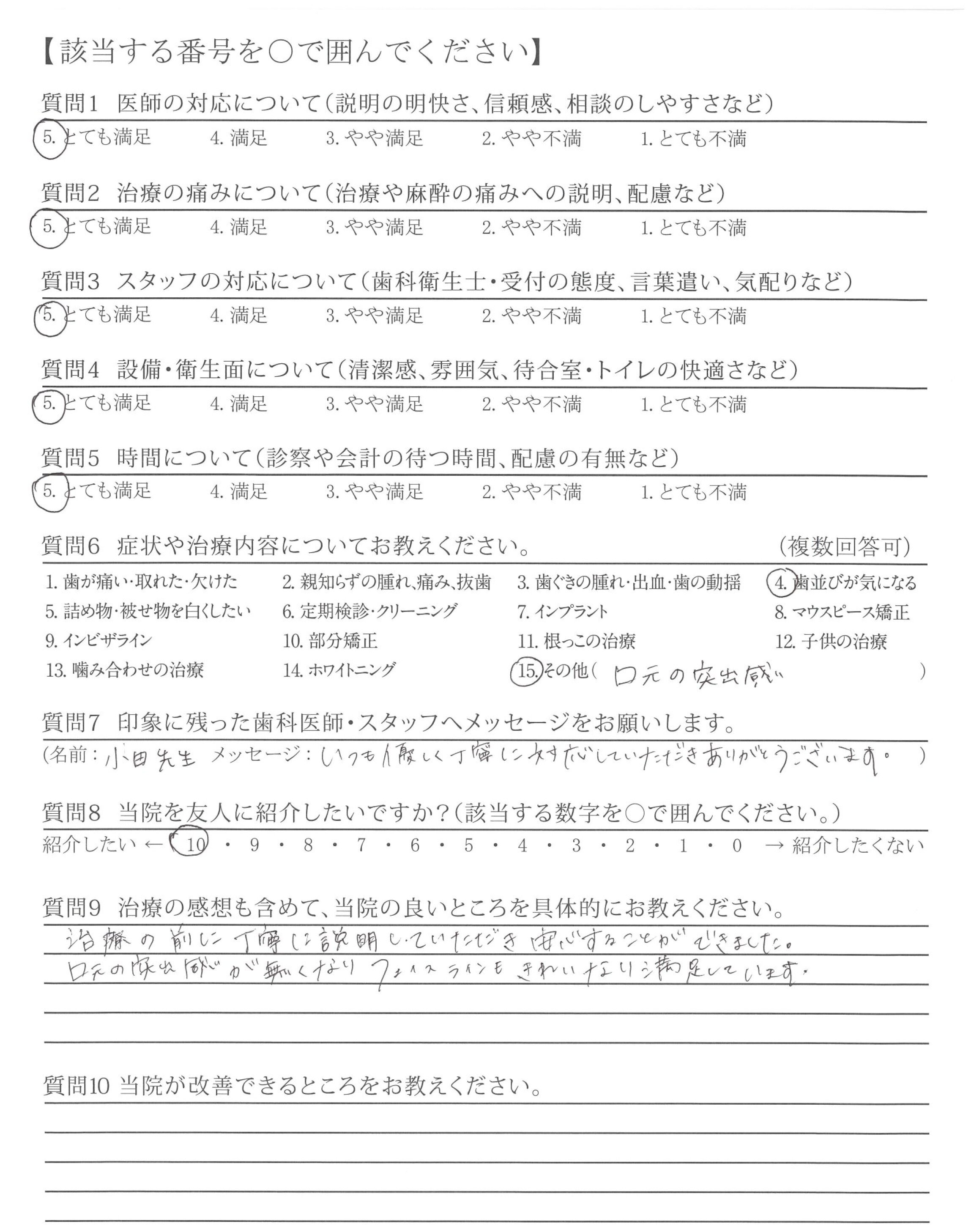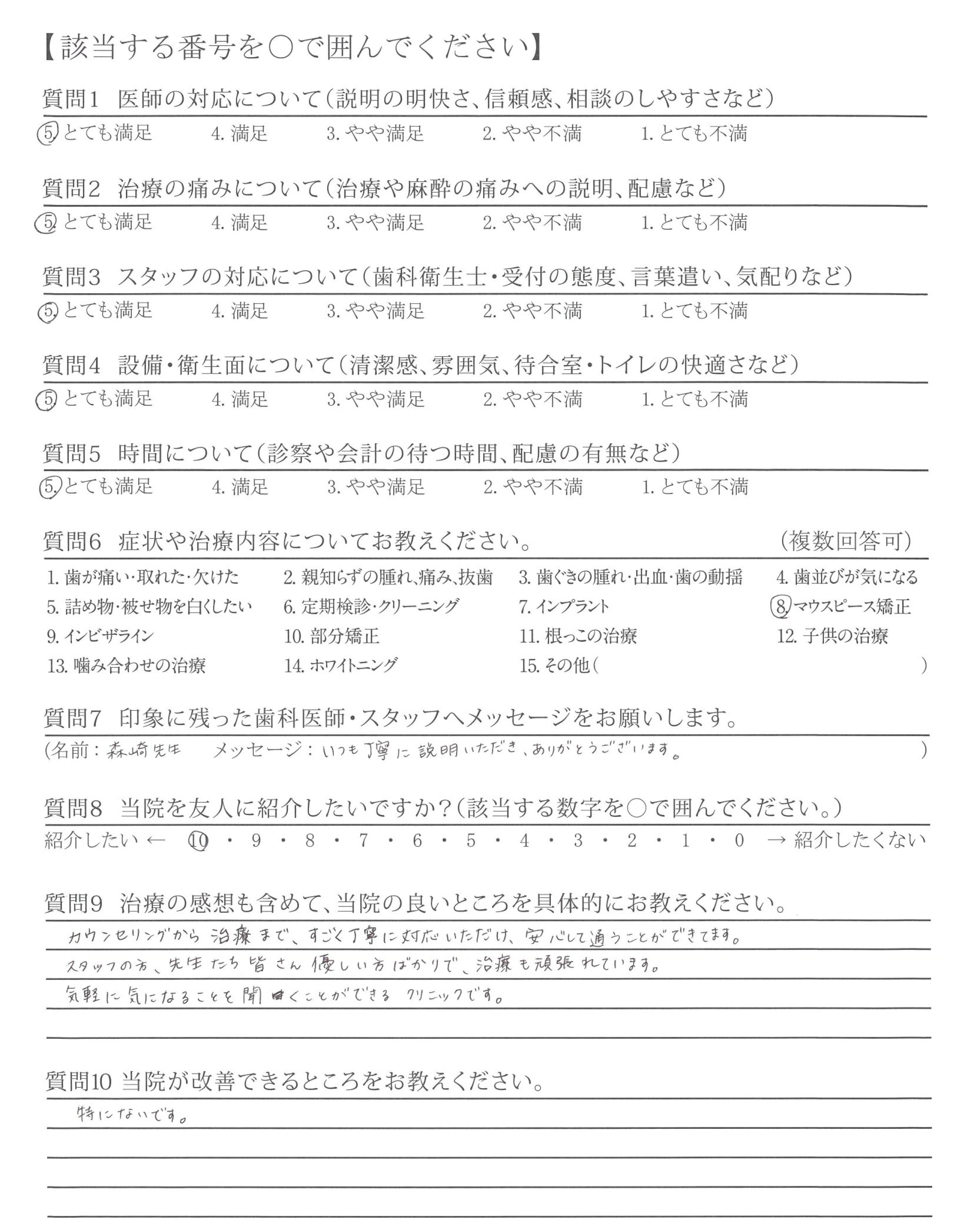 カウンセリング時から、不安なこと(どのくらいの費用がかかりどのくらいの期間がかかるか目安)など、丁寧にお教えていただけたこと。また、受診するたびキレイになっていく歯ならびを実感できて嬉しかったです。