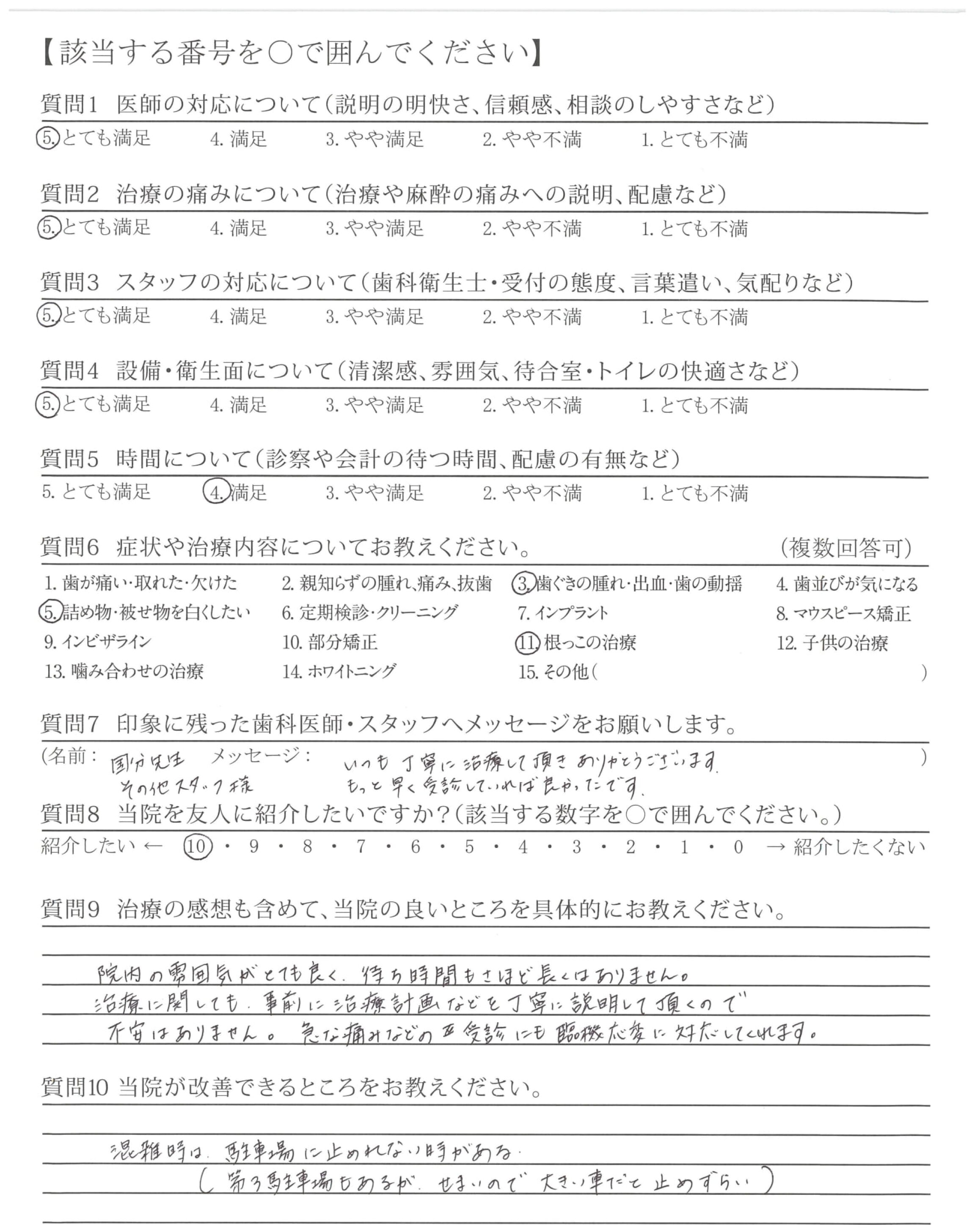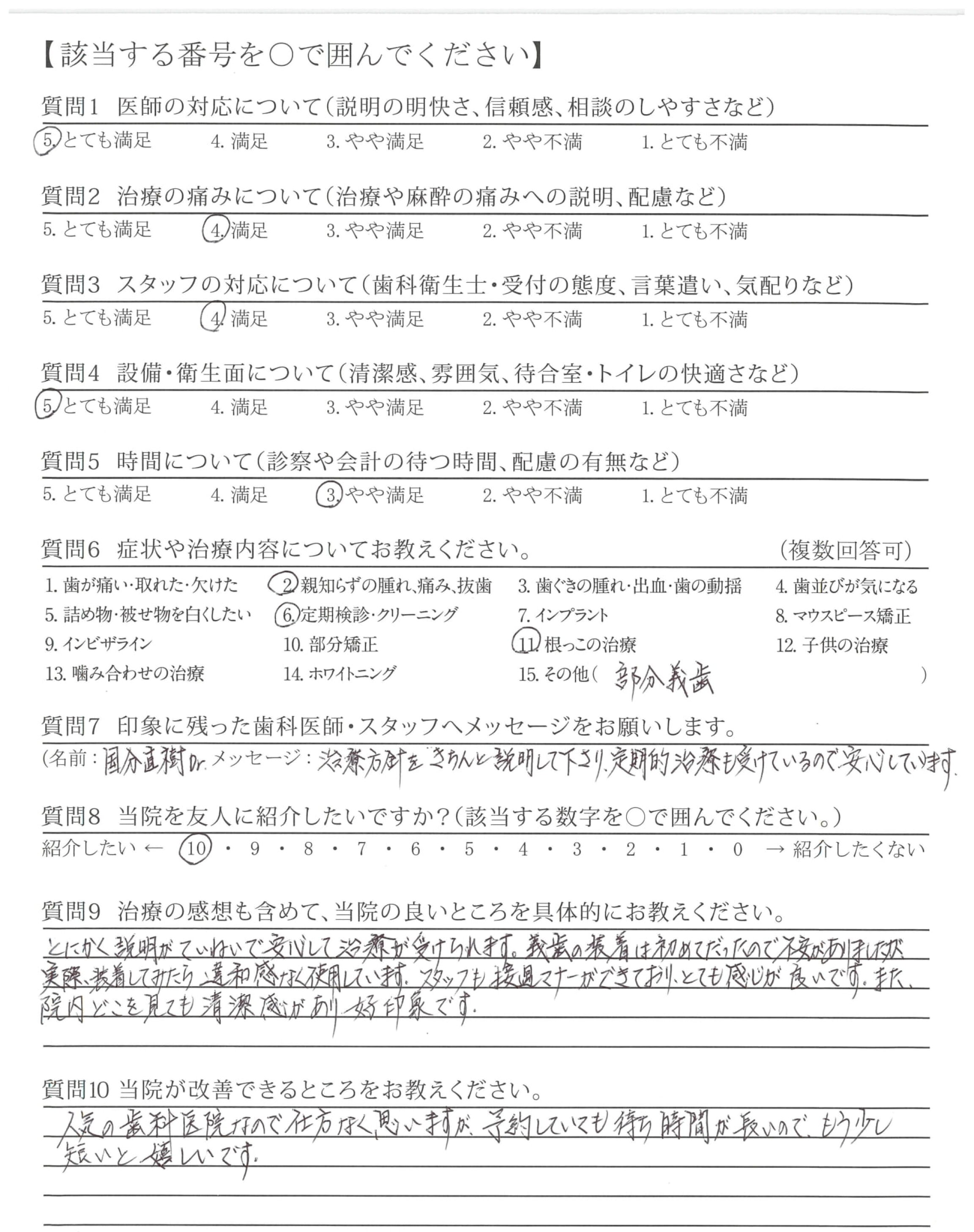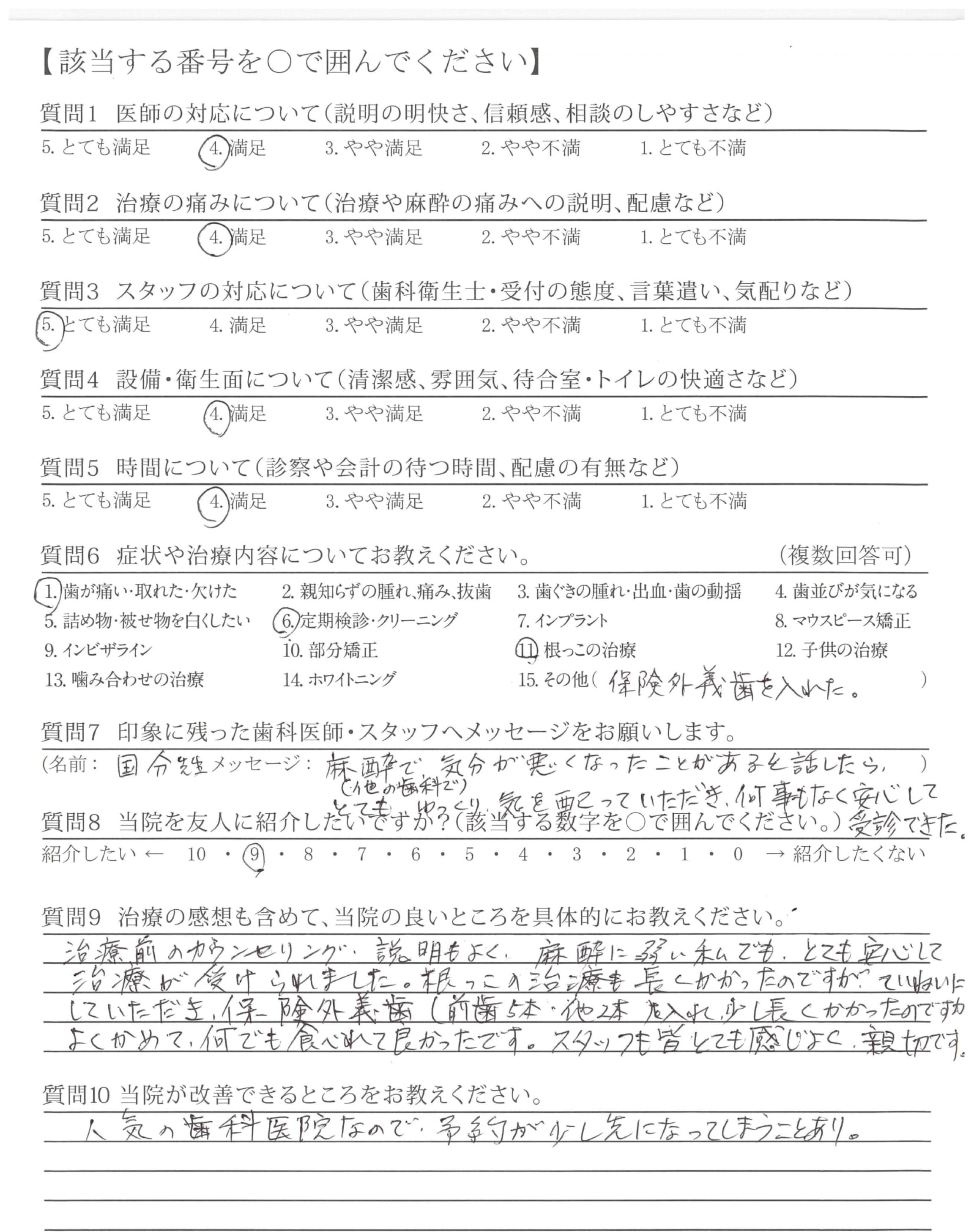 根っこの治療も長くかかったのですが、ていねいにしていただき、保険外義歯(前歯5本・他2本)を入れ少し長くかかったのですがよくかめて、何でも食べられて良かったです。