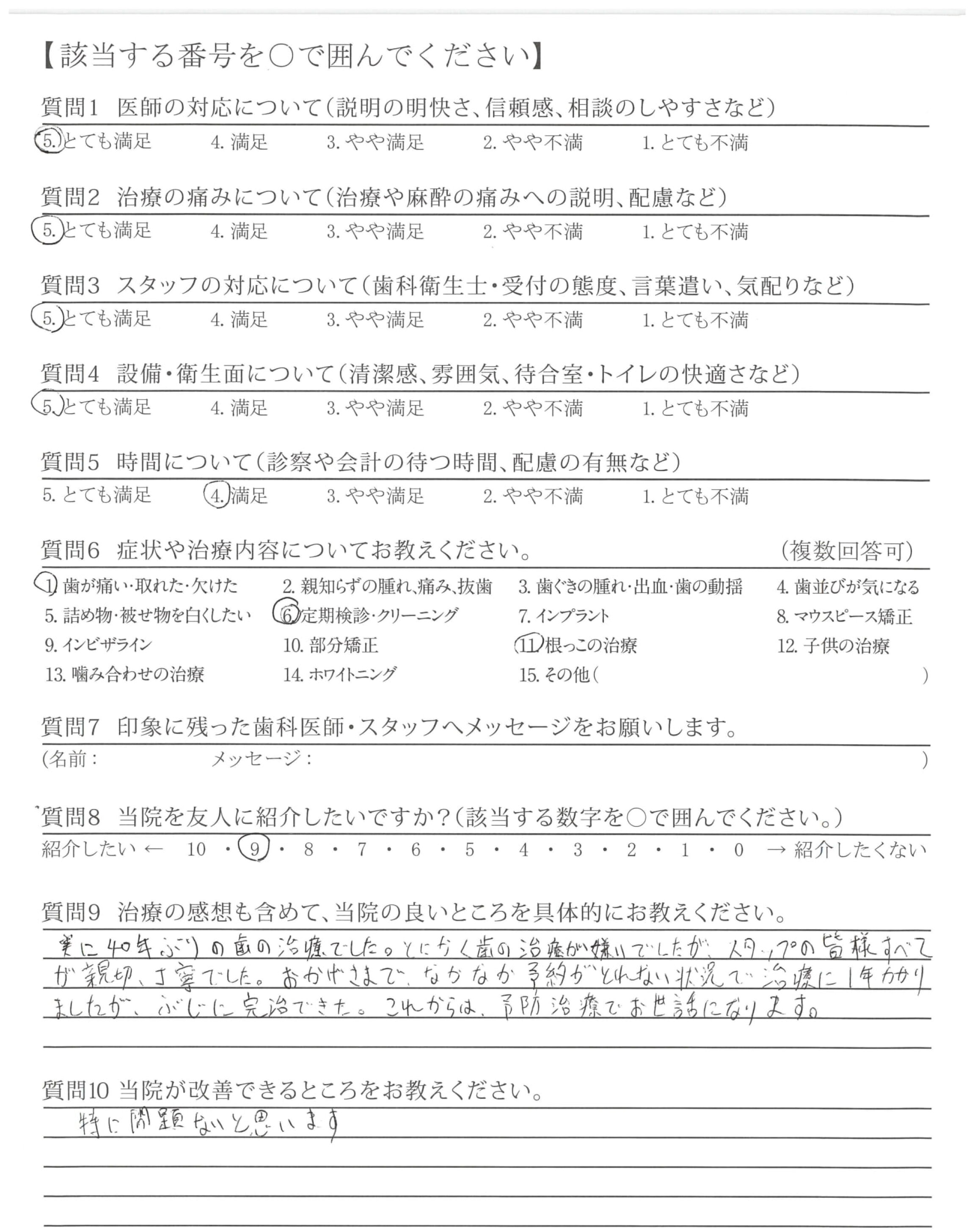 実に40年ぶりの歯の治療でした。とにかく歯の治療が嫌いでしたが、スタップの皆様すべてが親切、丁寧でした。おかげさまで、なかなか予約がとれない状況で治療に1年かかりましたが、ぶじに完治できた。