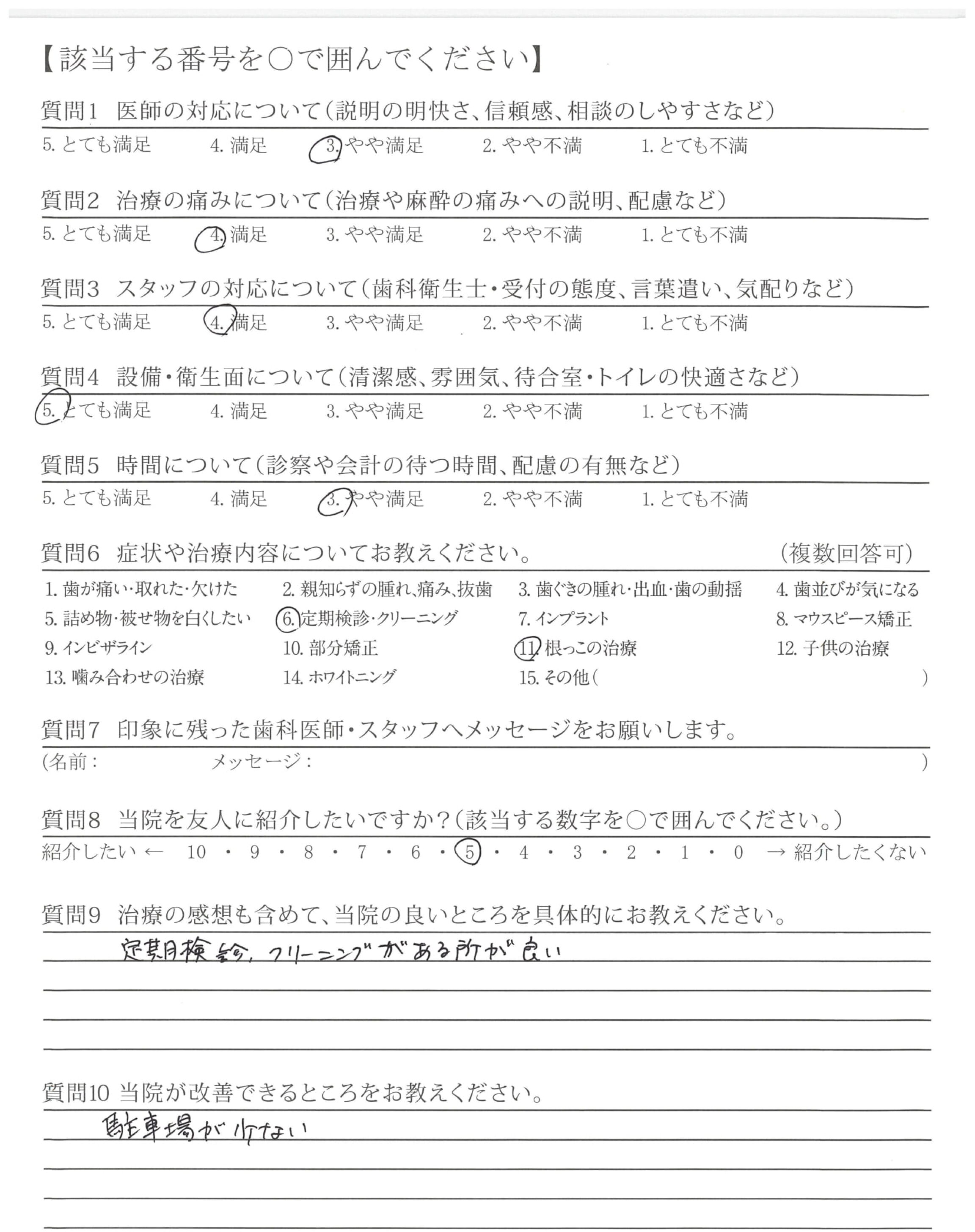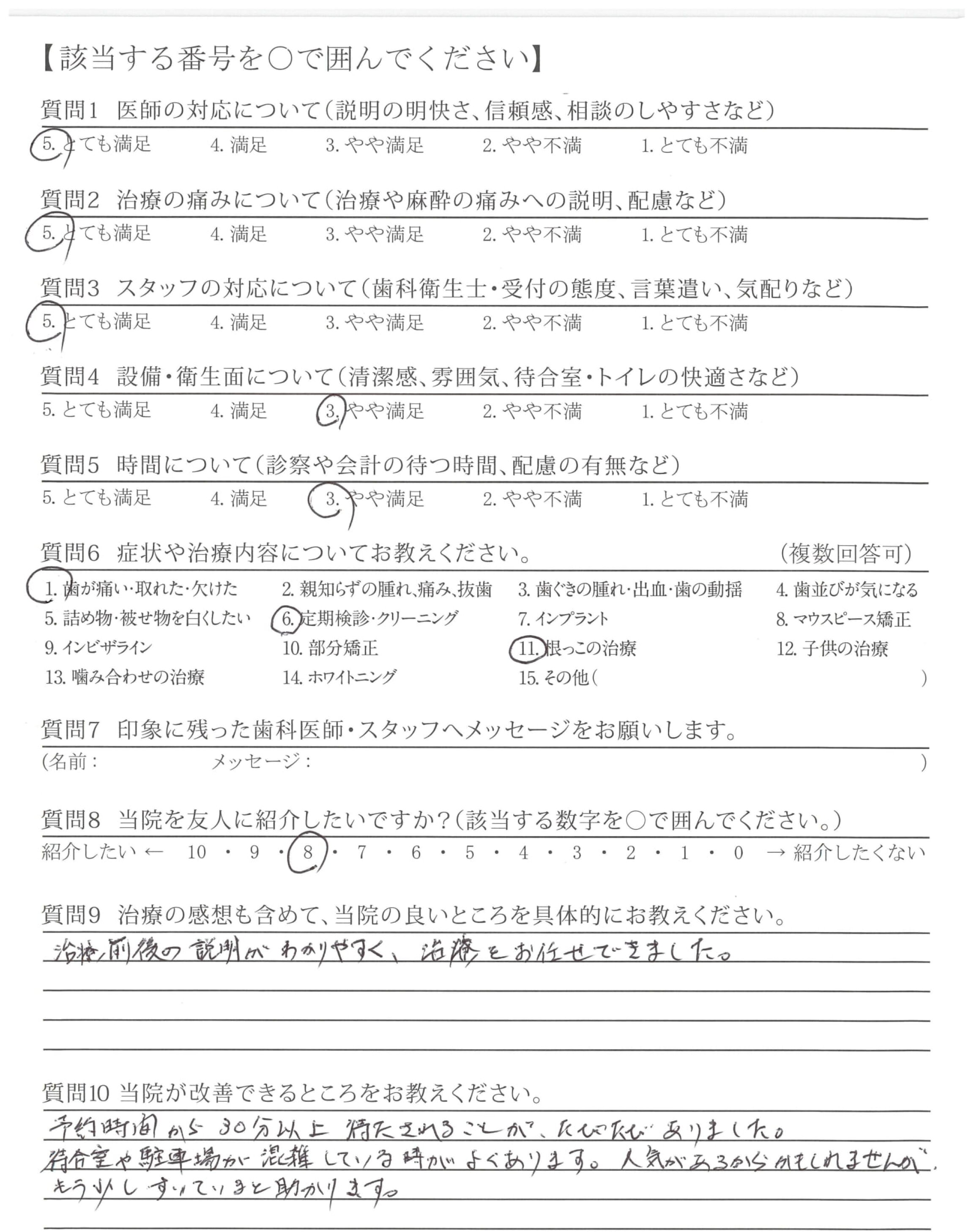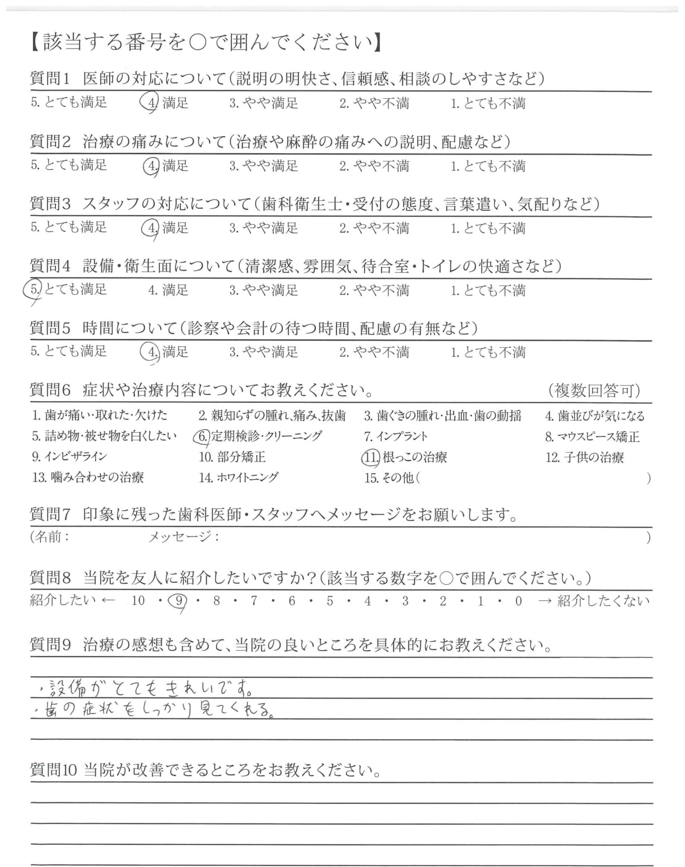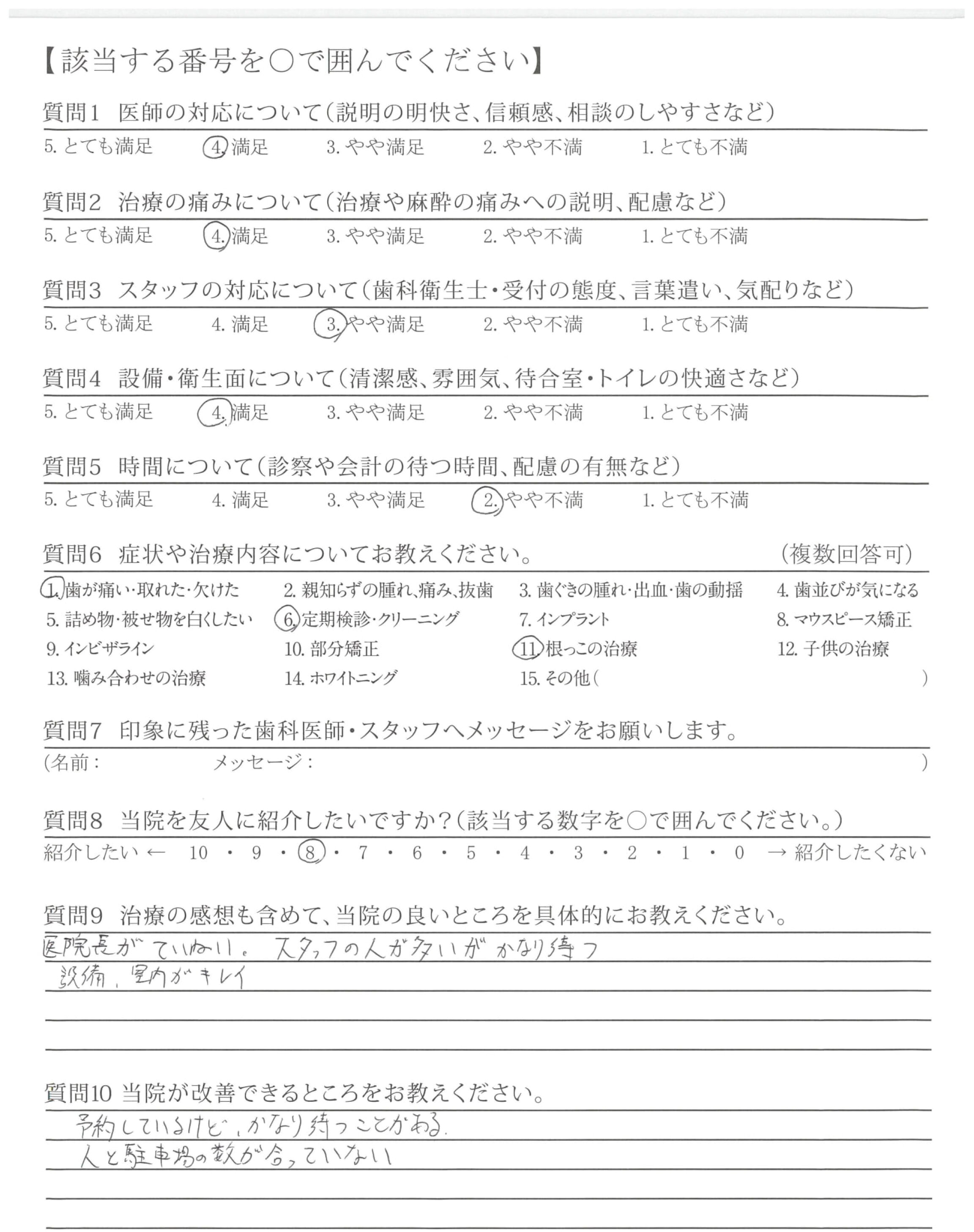 ・待ち時間の長さや予約の取りづらさなど細かくみればありますが、治療や職員さんの接遇に満足し通わせていただいているので、今のところ改善点はありません。