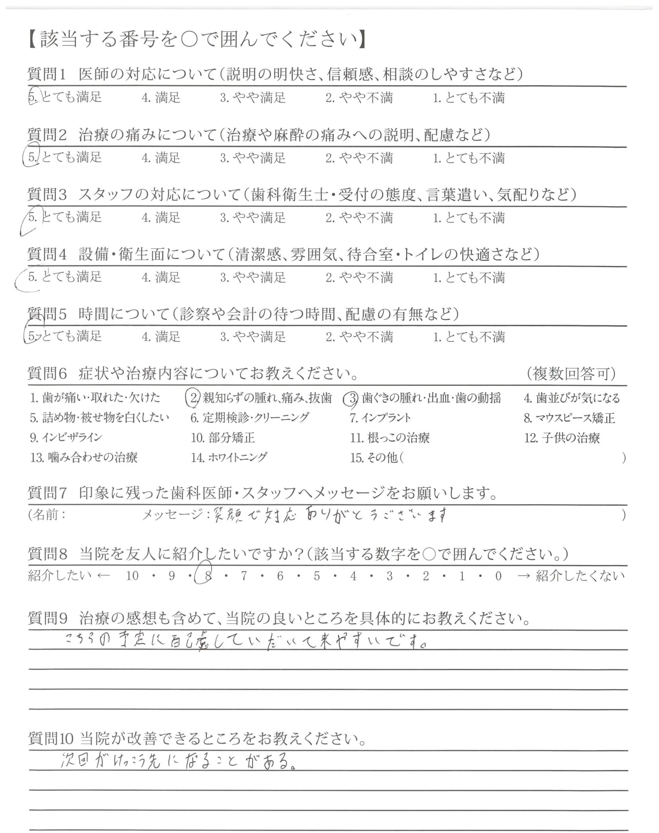 非常に患者の気持ちによりそって下さり、治療が辛くて中断したいことを嫌な顔せずうけ入れて下さいました。本当にありがとうございました。
