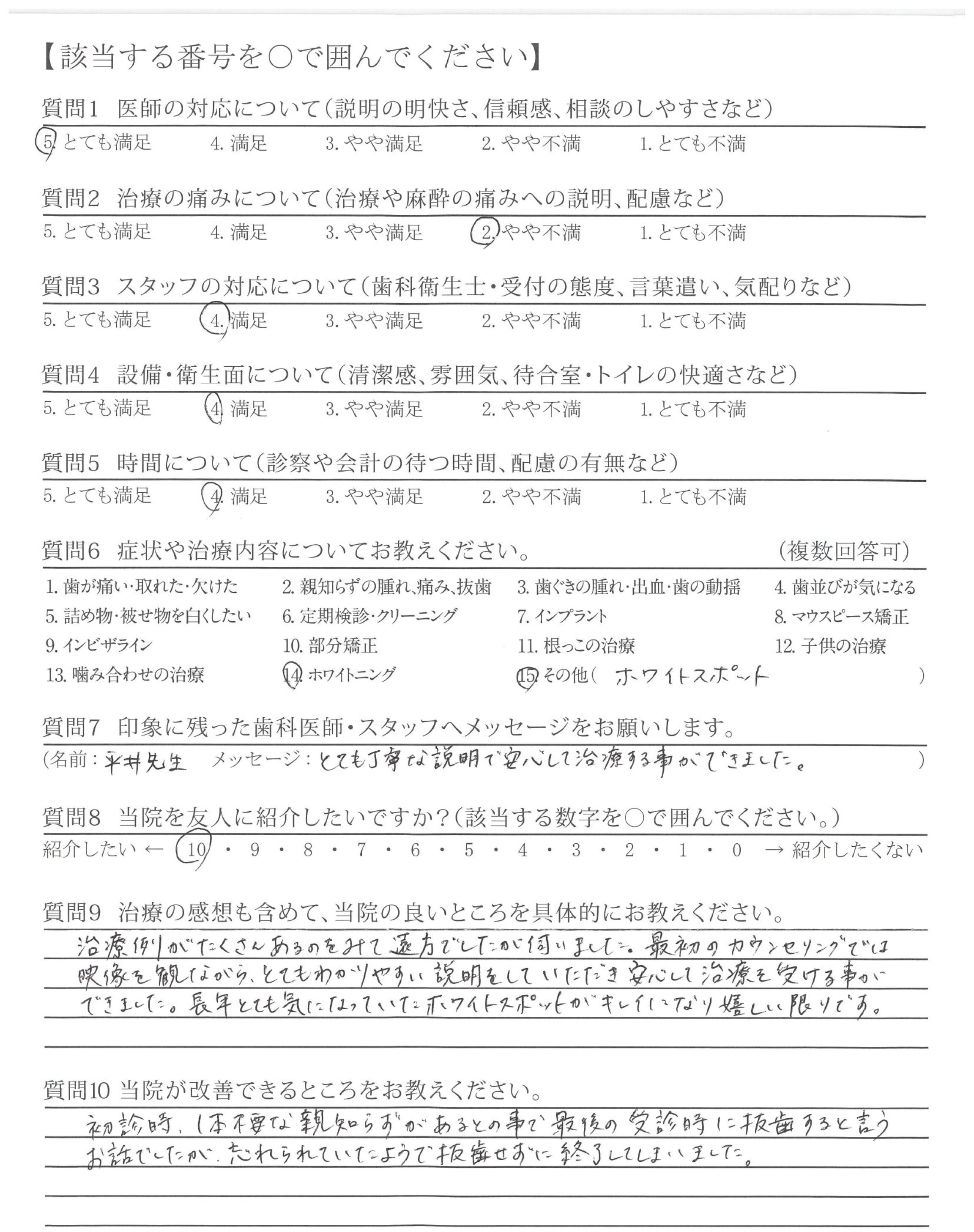 治療例がたくさんあるのをみて遠方でしたが伺いました。最初のカウンセリングでは映像を観ながら、とてもわかりやすい説明をしていただき安心して治療を受ける事ができました。長年とても気になっていたホワイトスポットがキレイになり嬉しい限りです。