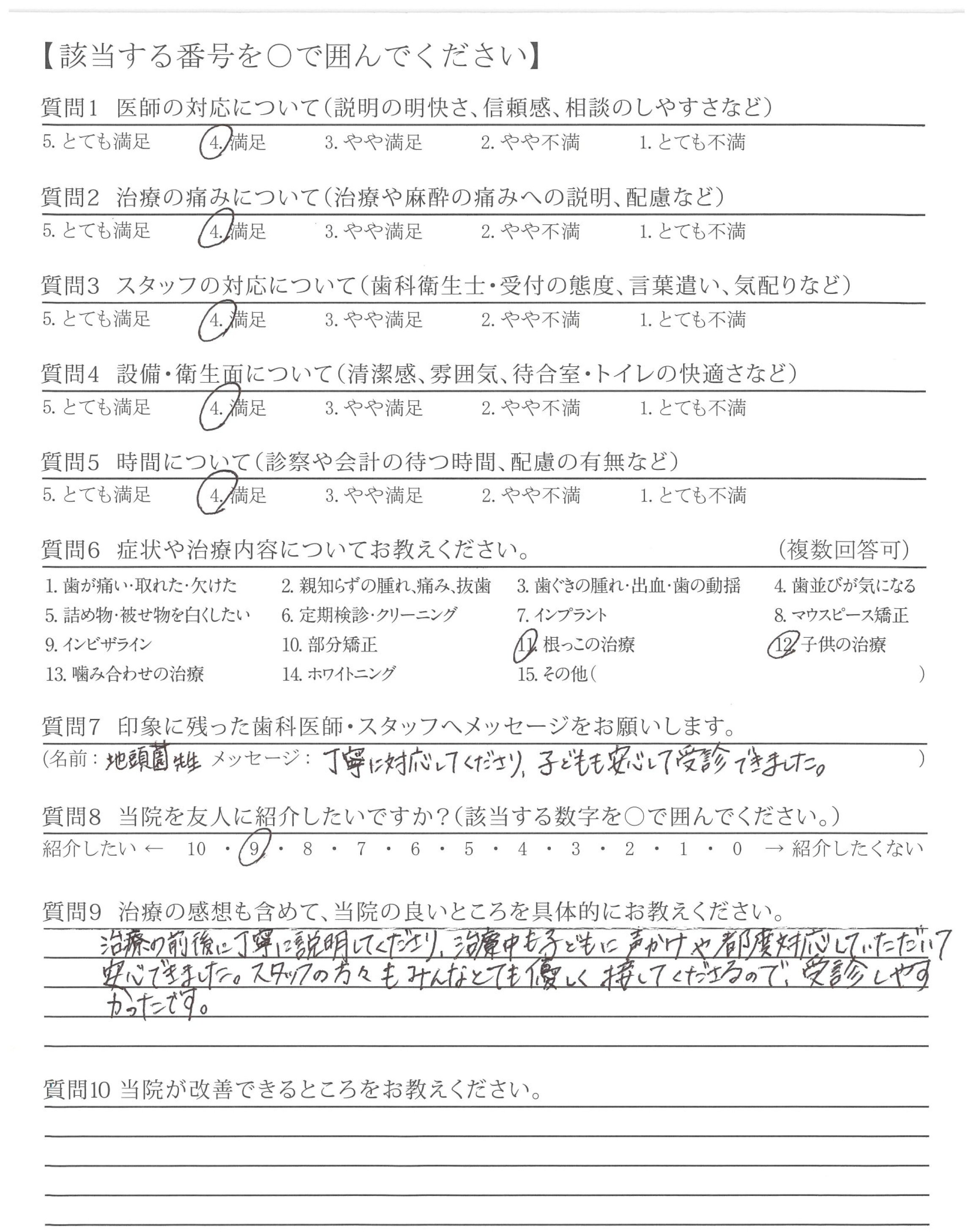 話を聞いてくださり安心して治療を受診することができました。ありがとうございました。