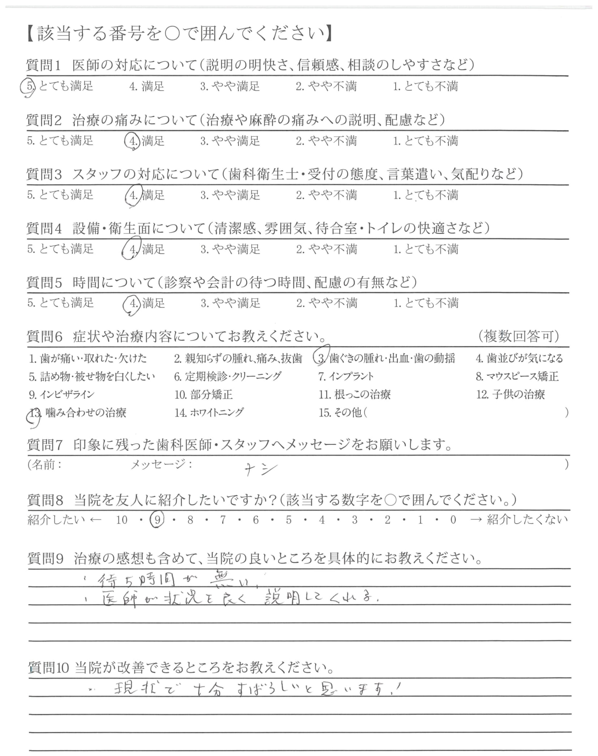 ・院長さんはじめ受付のスタッフさん皆様とても感じが良く、フレンドリーで話しやすく待ち時間もなく、院内も清潔で歯医者さんのイメージが変わり、歯医者が大嫌いな私が気持ち良く通院できました。
