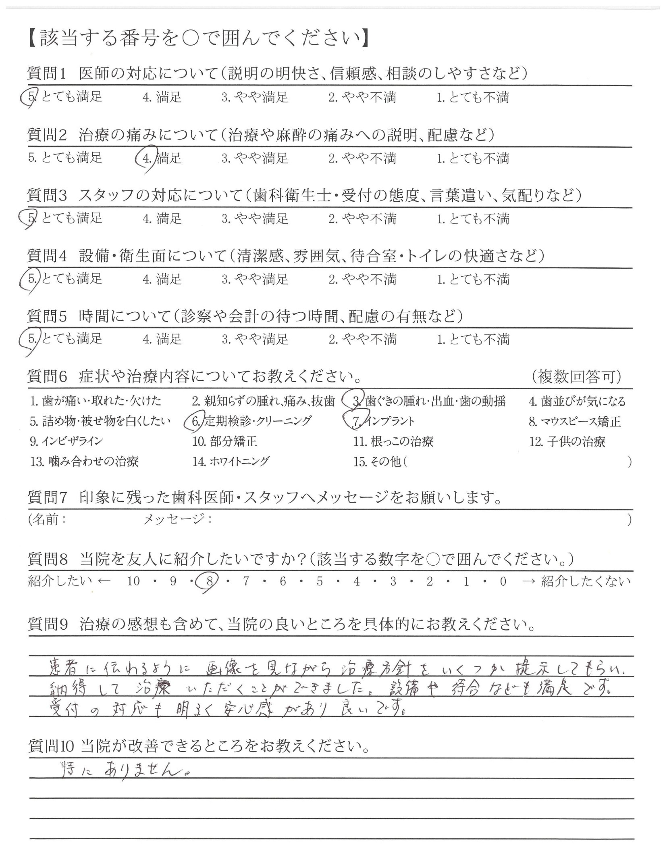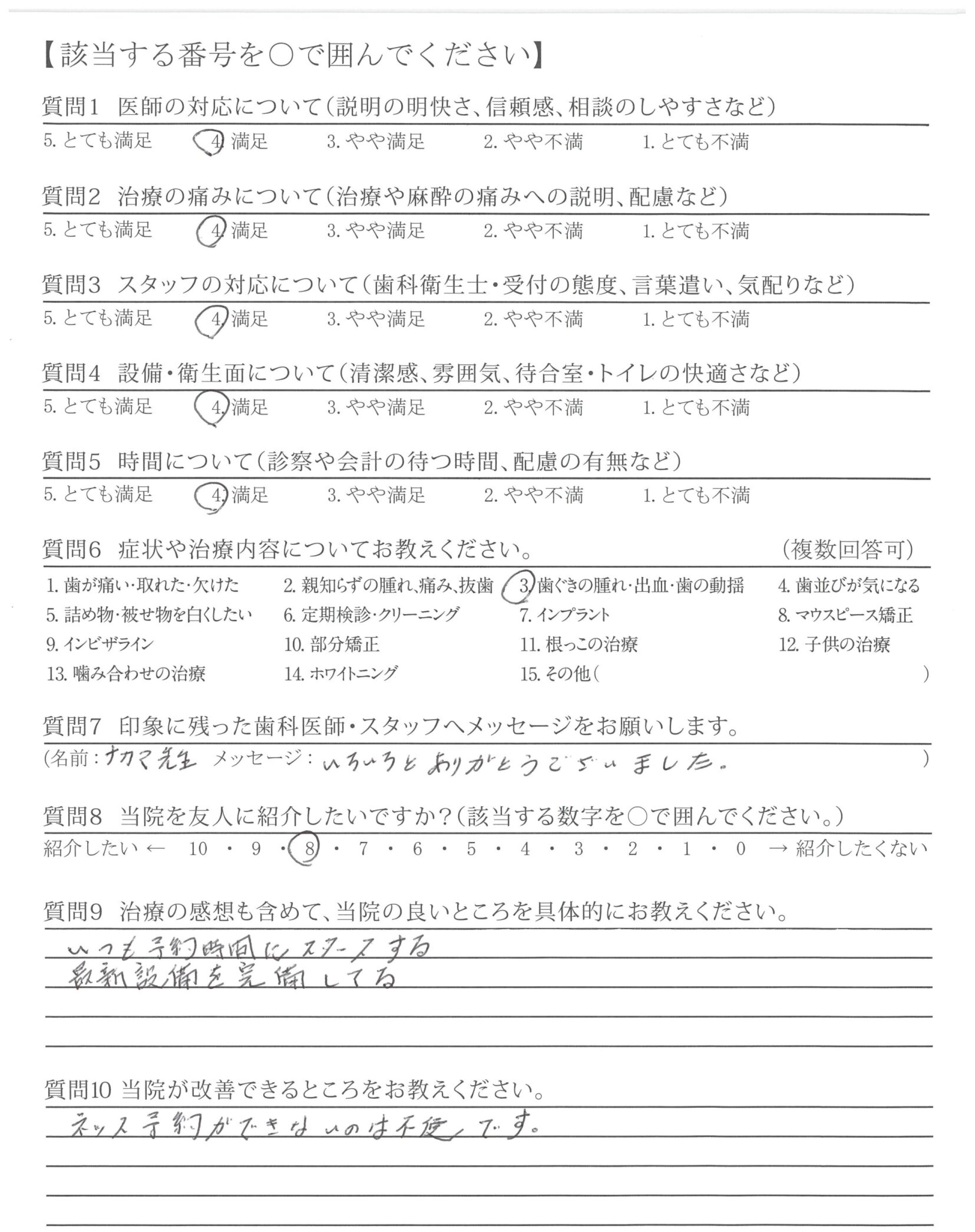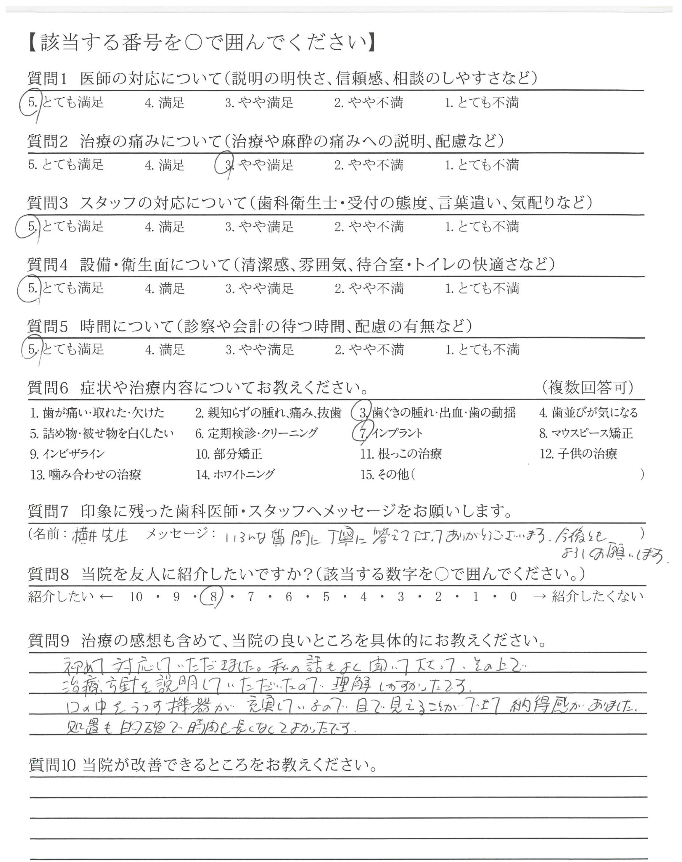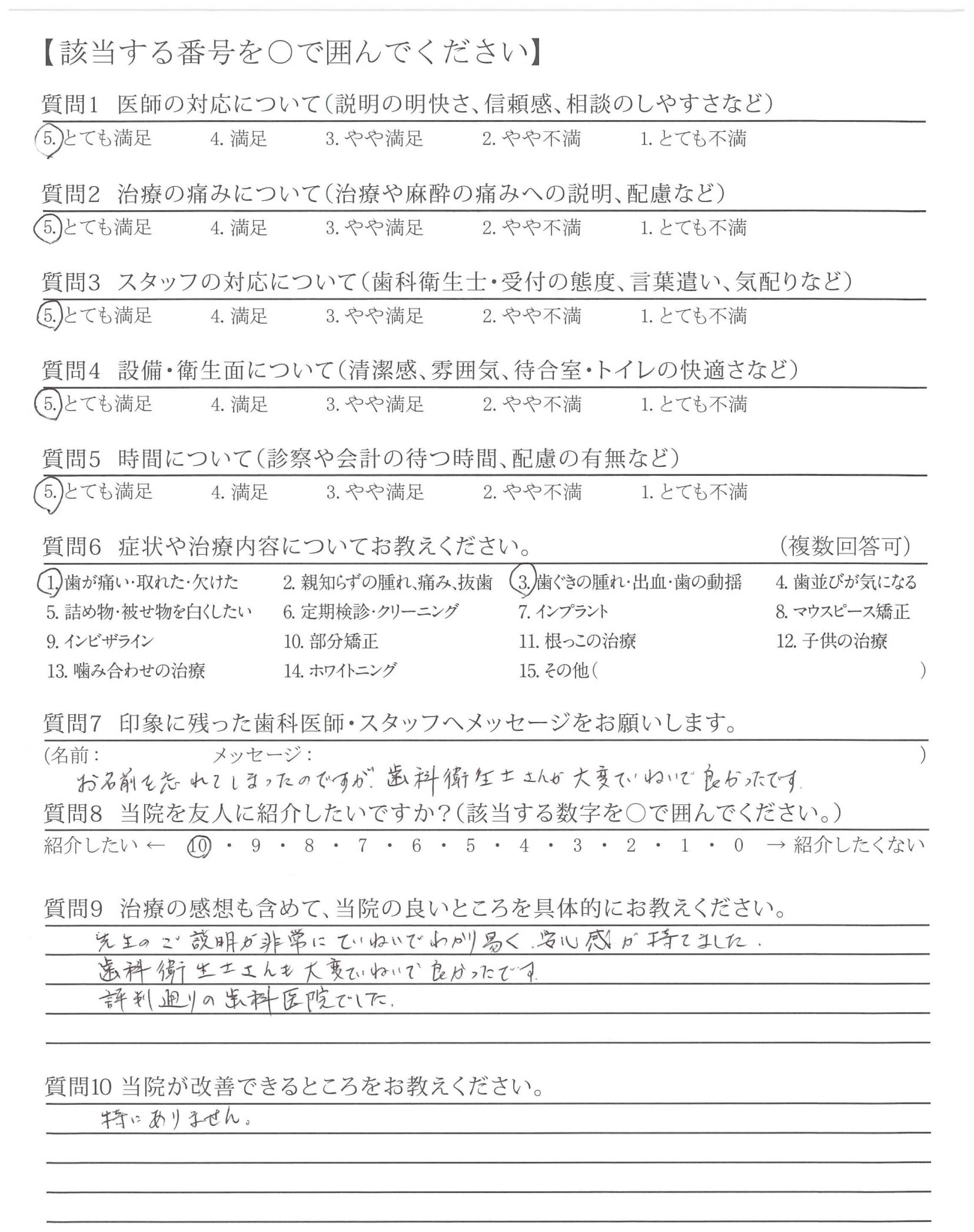 最初クリーニングで伺いましたが歯周病が相当すすんでいるとの事で徹底的に治療していただきました。とても調子がよくなり気になっていた口臭も改善できてありがとうございました。