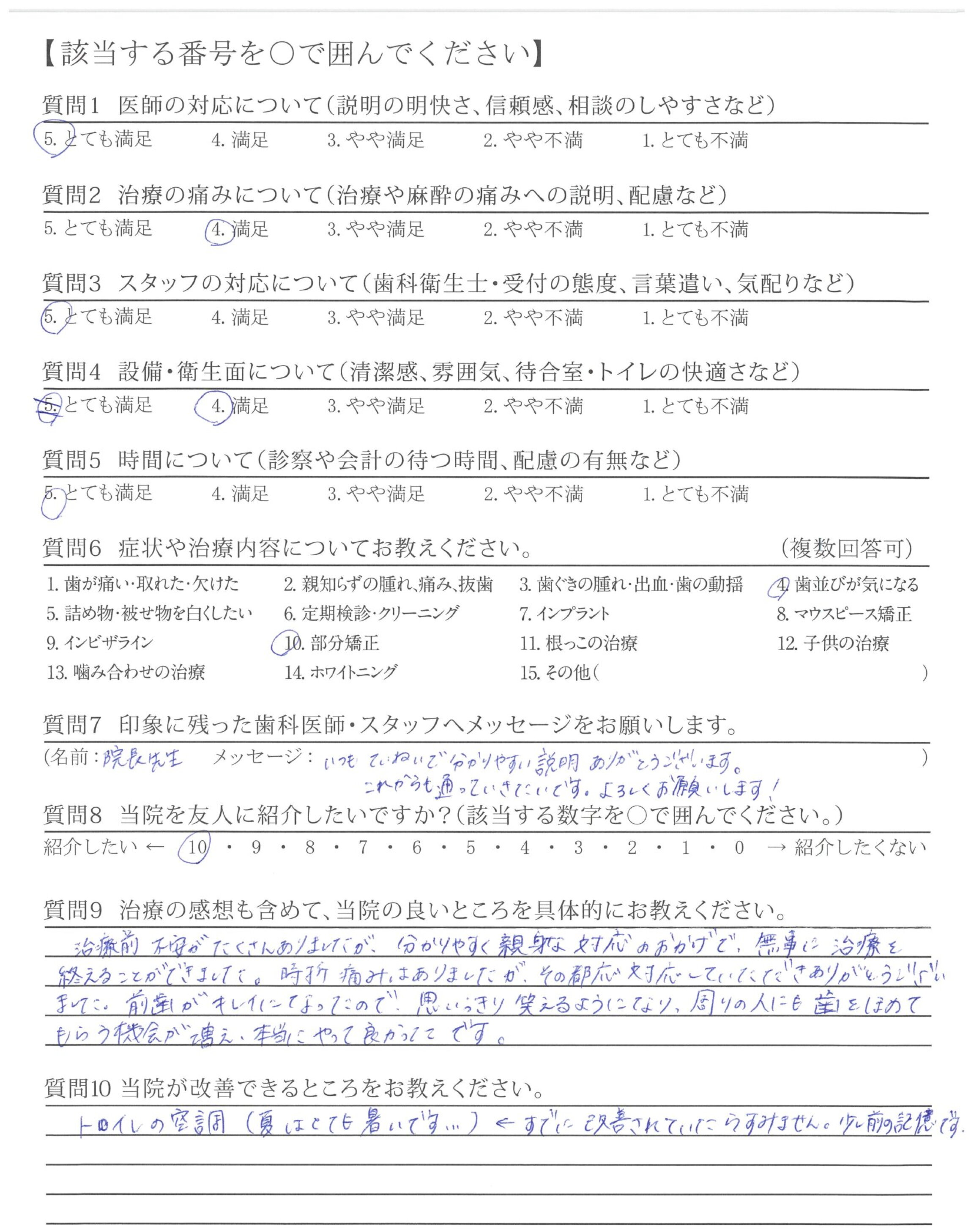 治療前不安がたくさんありましたが、分かりやすく親身な対応のおかげで、無事に治療を終えることができました。時折痛みはありましたが、その都応対応していただきありがとうございました。