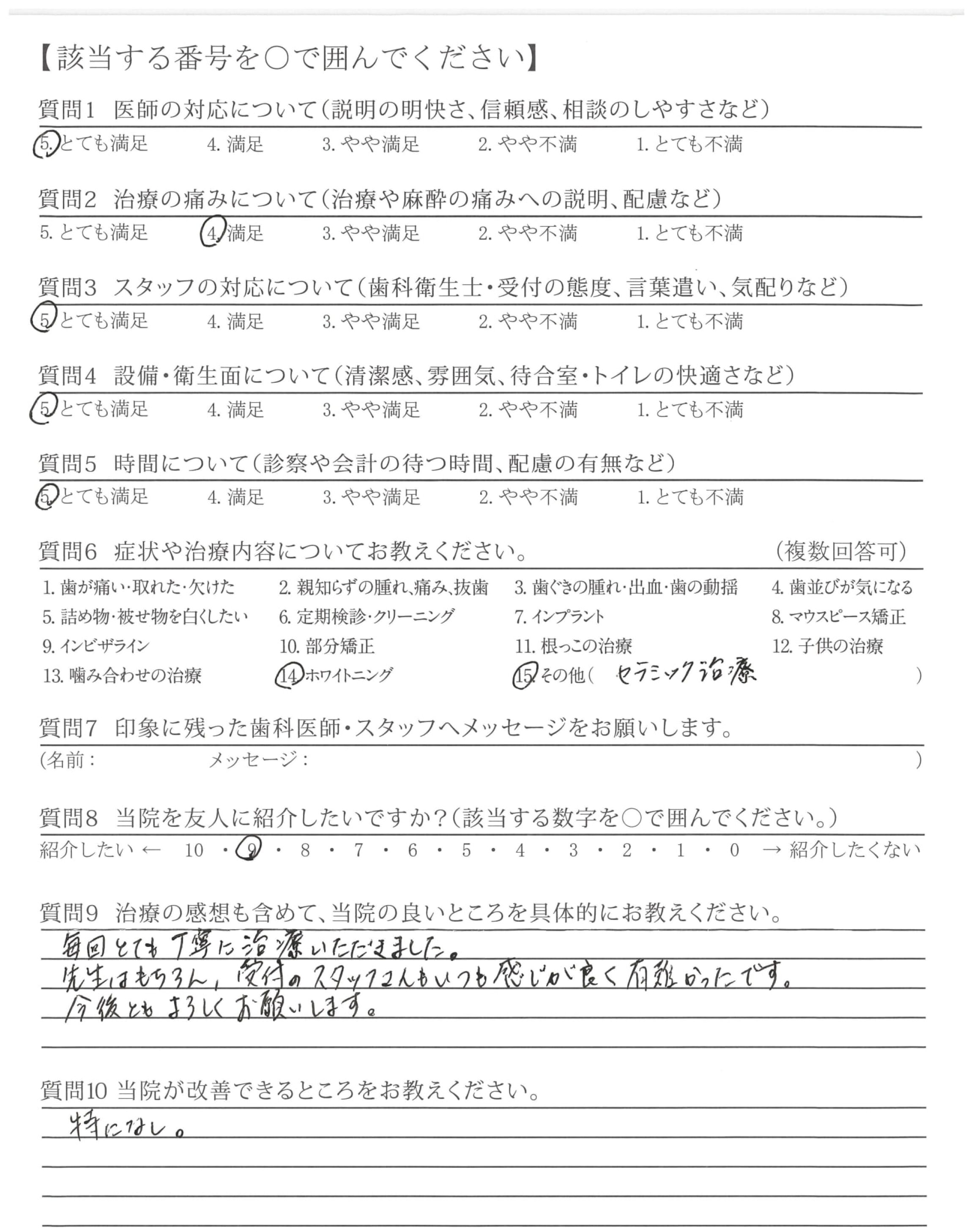 最初から最後まで親切ていねいな治療をしていただきありがとうございました。物腰やわらかで相談しやすく安心して治療できました。痛くないか等の声かけがあったのが嬉しかったです。