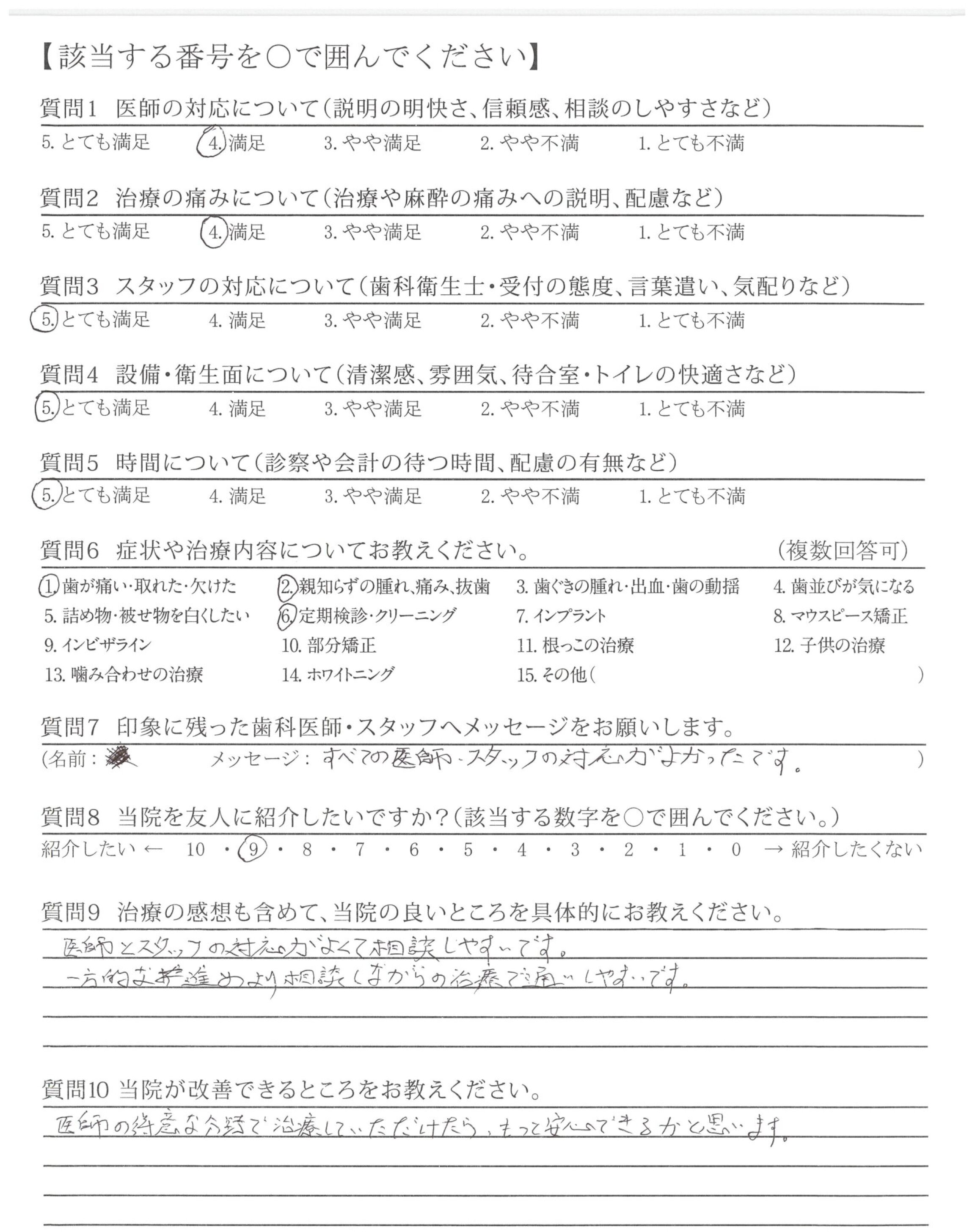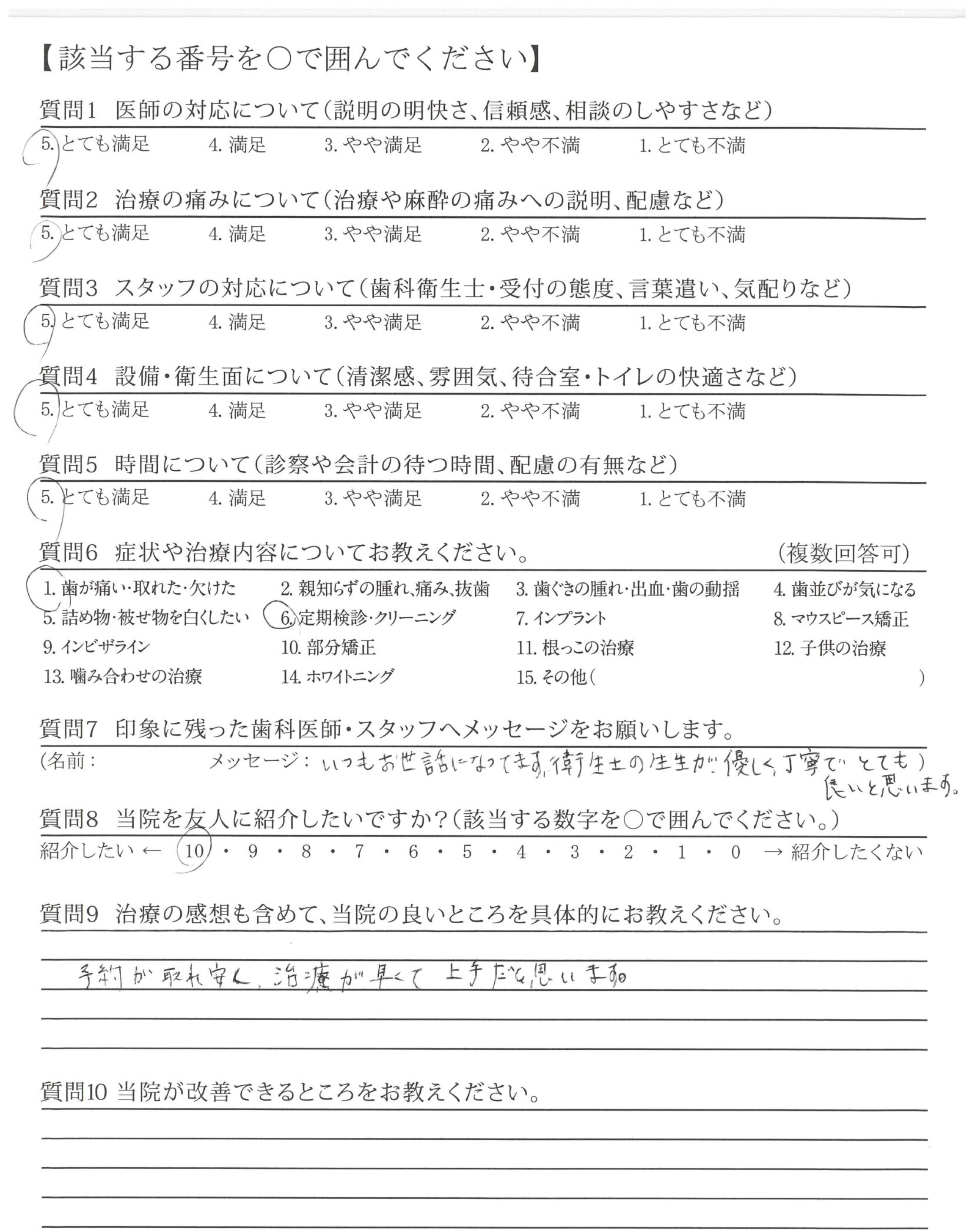 いつもお世話になってます、衛生士の先生が優しく、丁寧でとても良いと思います。