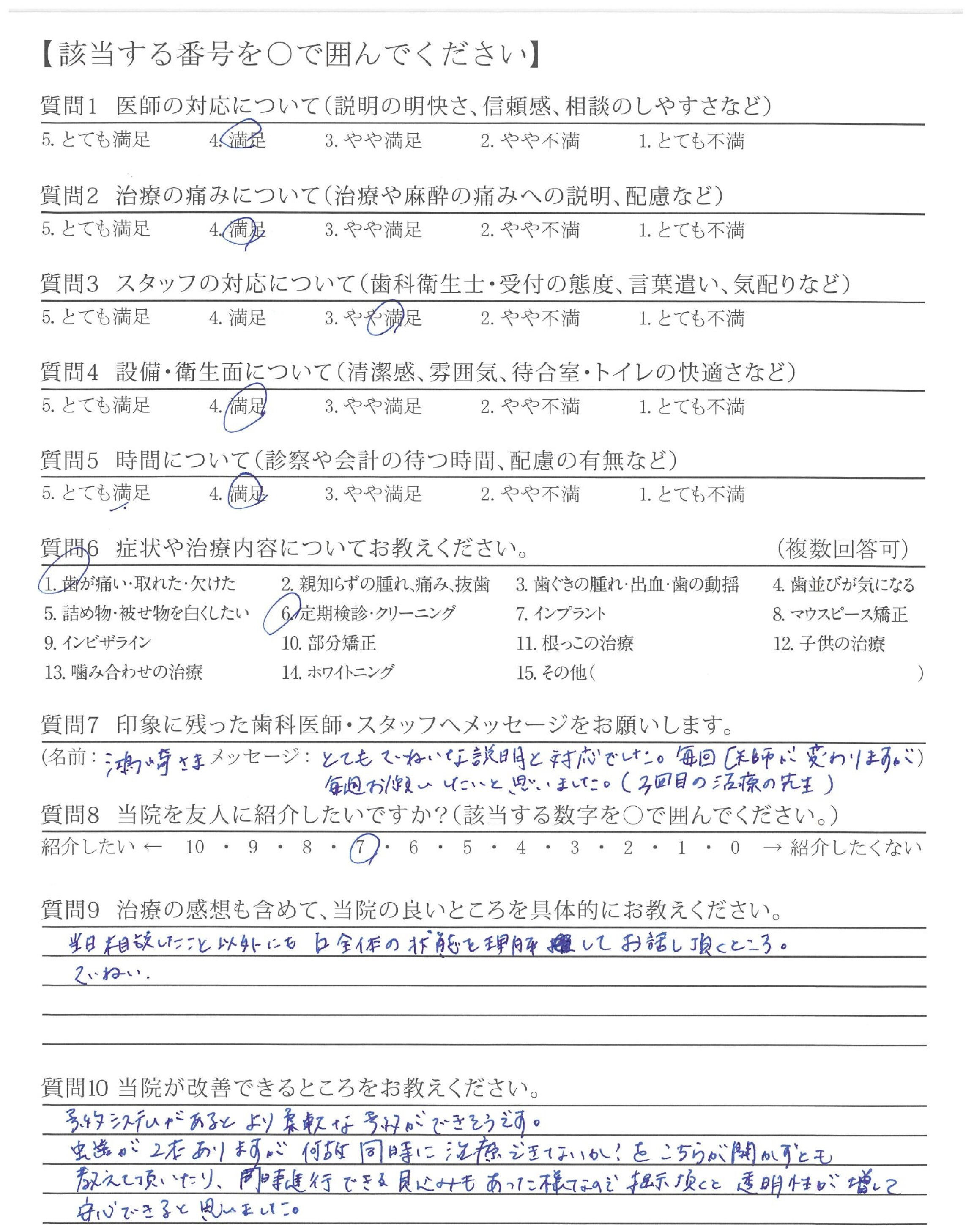 カウンセリングがていねいで、苦手な治りょうをお伝えしたところ改善して頂けた