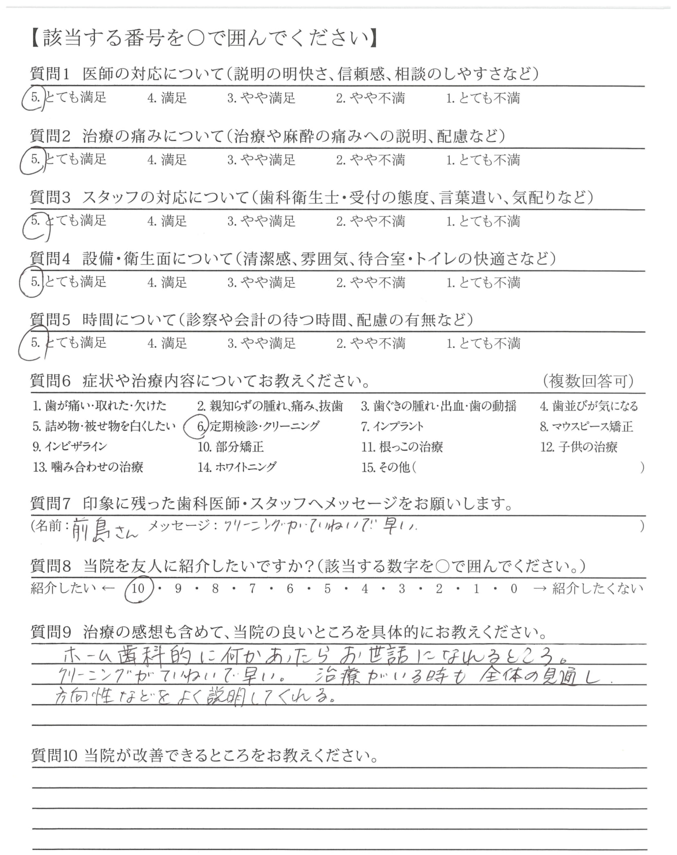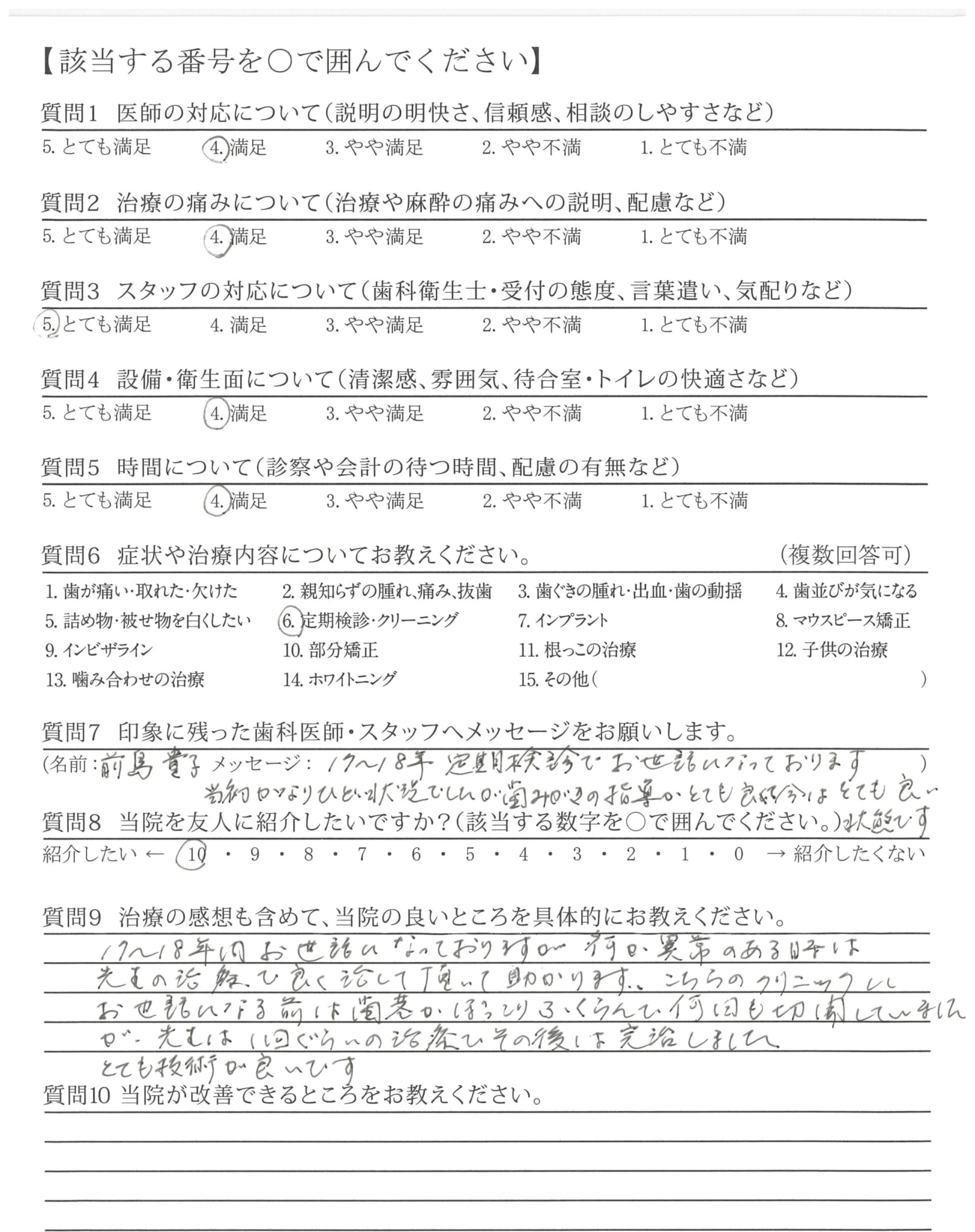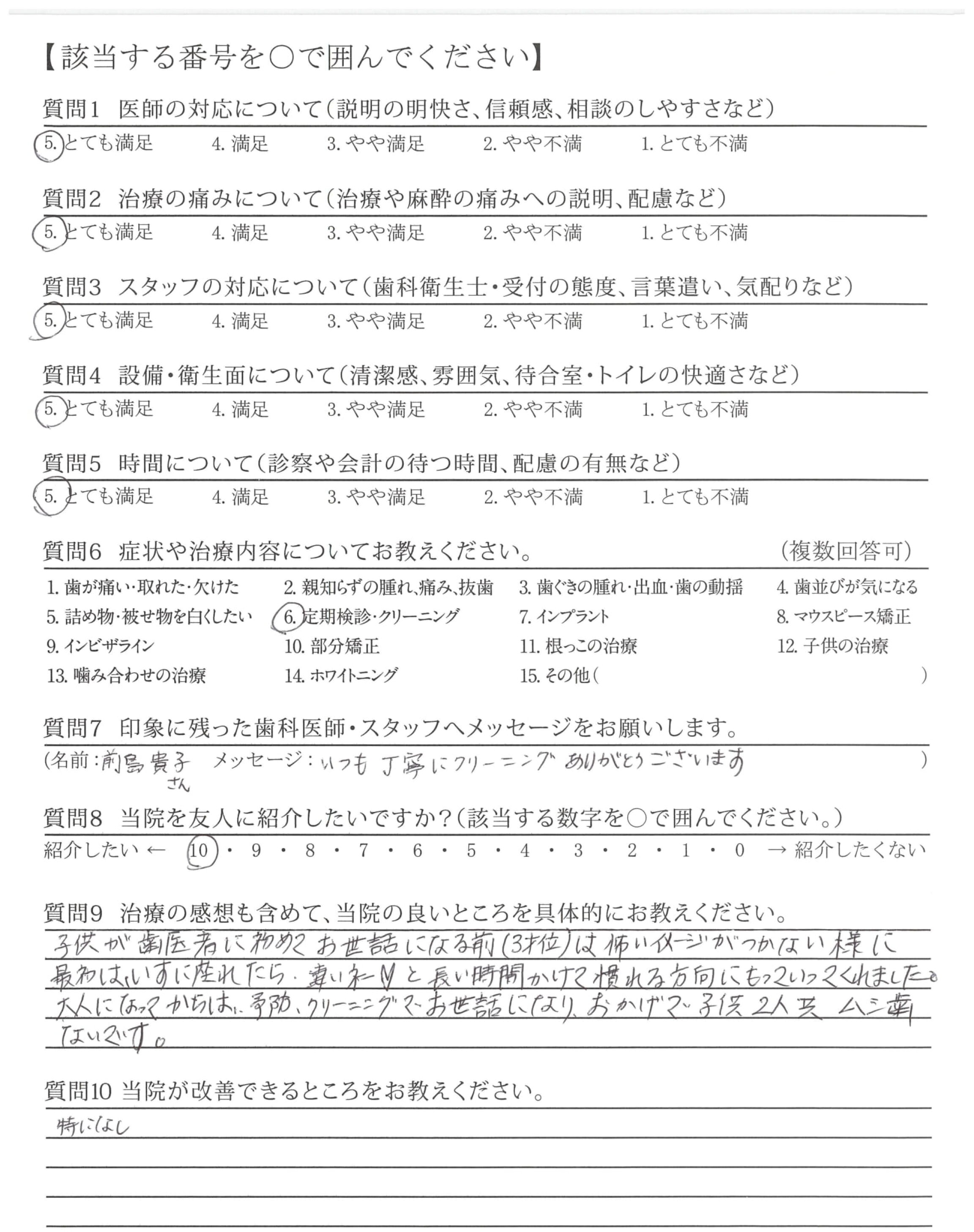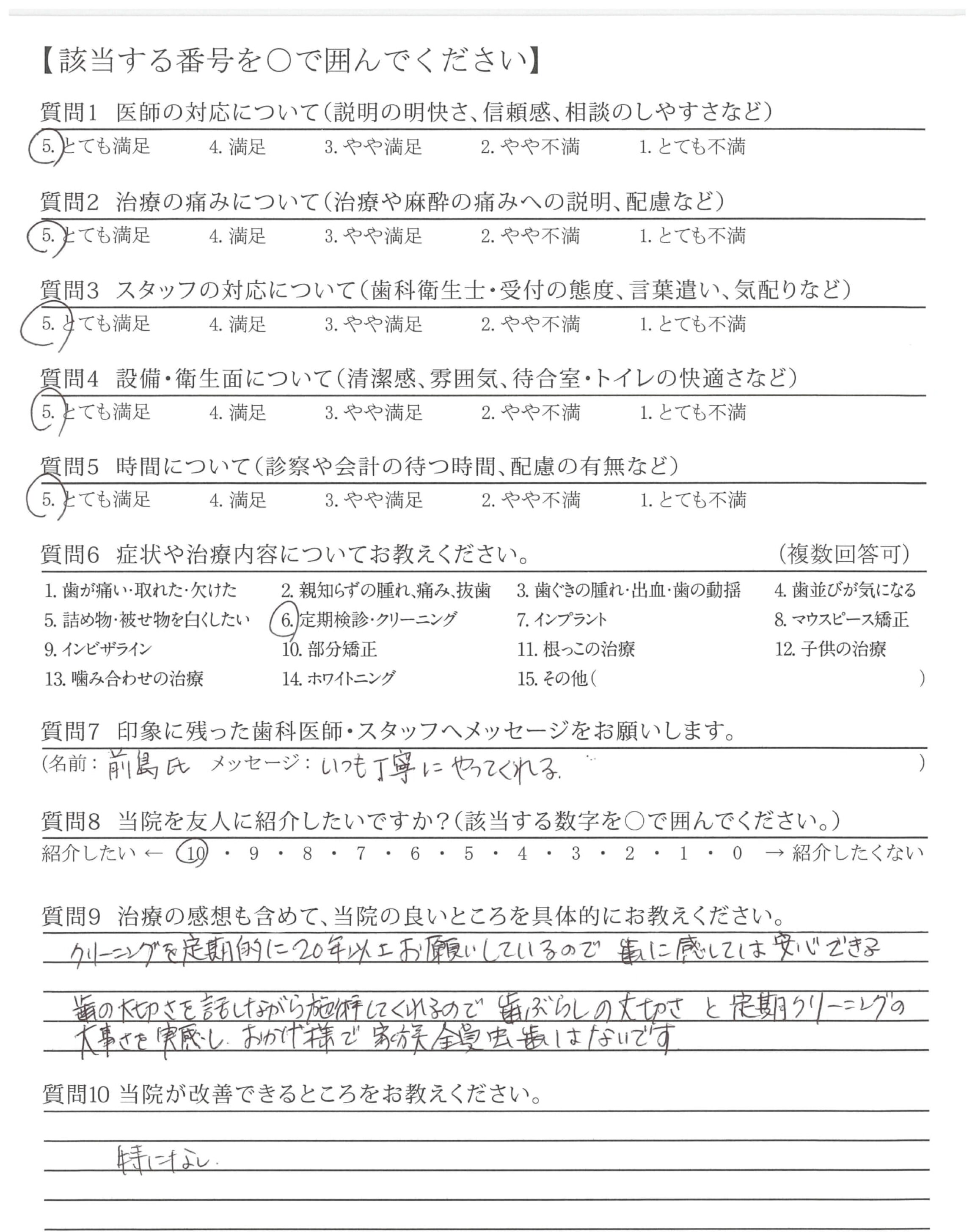 長期にクリーニングを続けている為、むし歯の治療もほとんどなく、口腔衛生管理をして頂き、感謝しております。