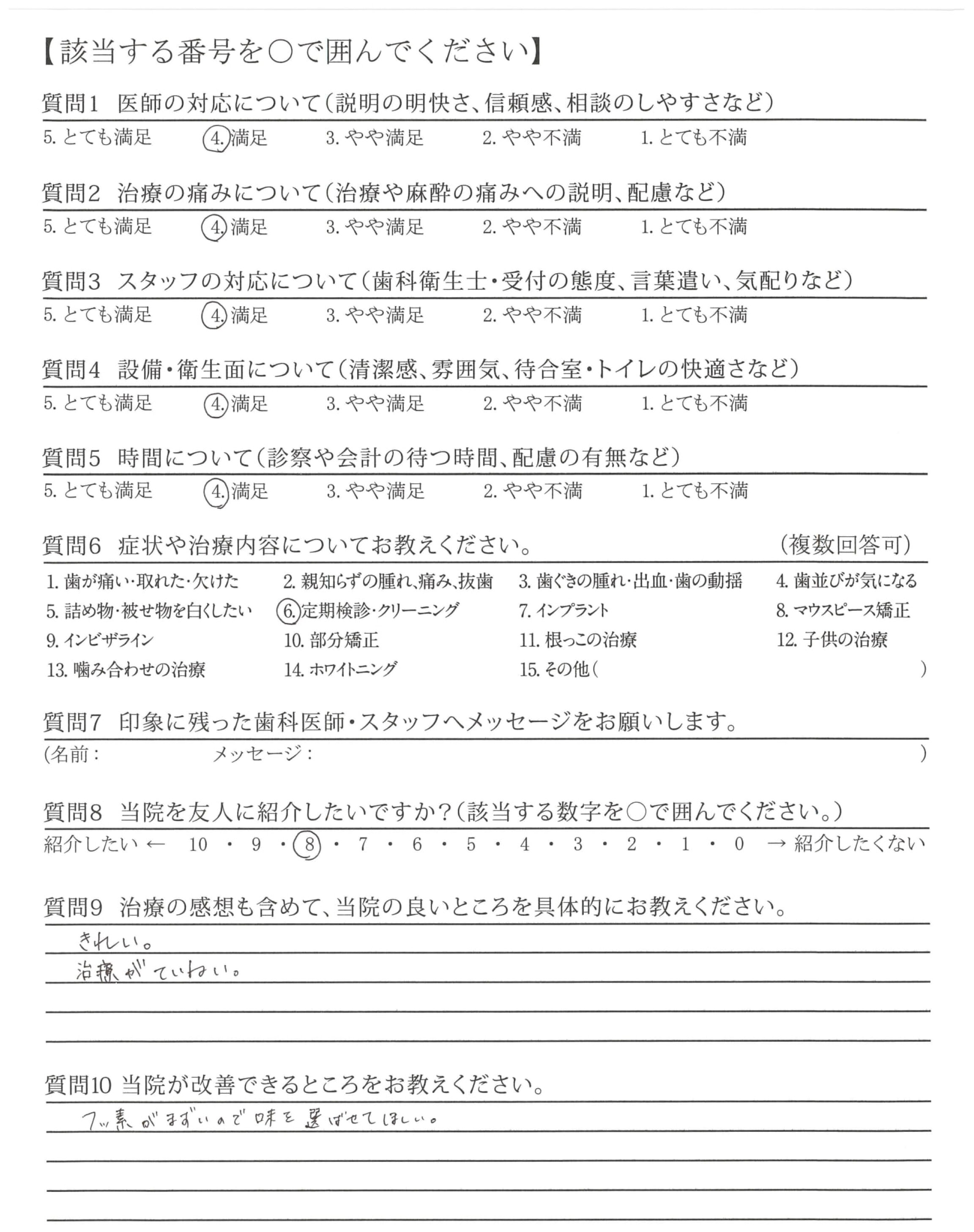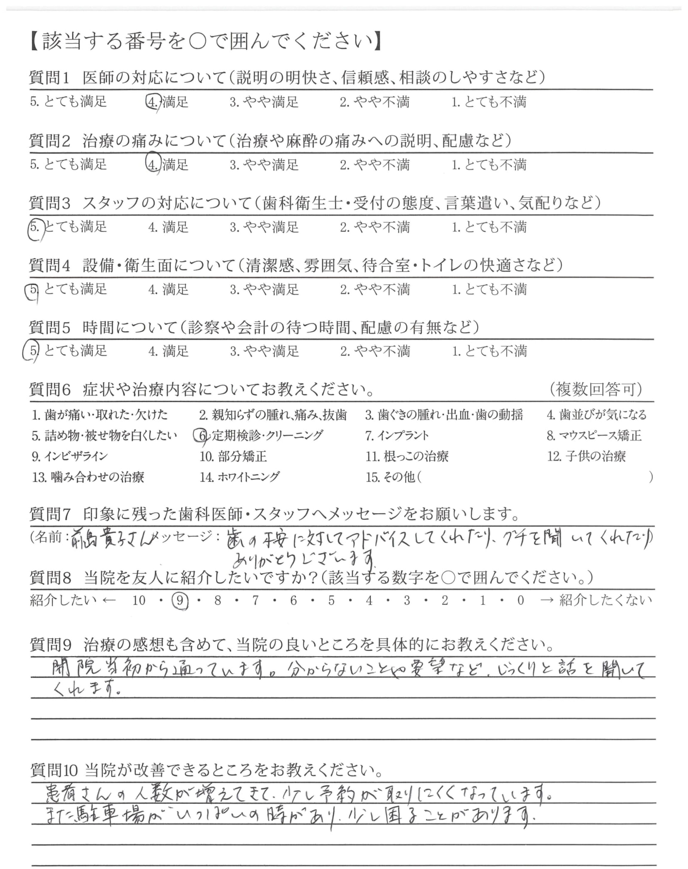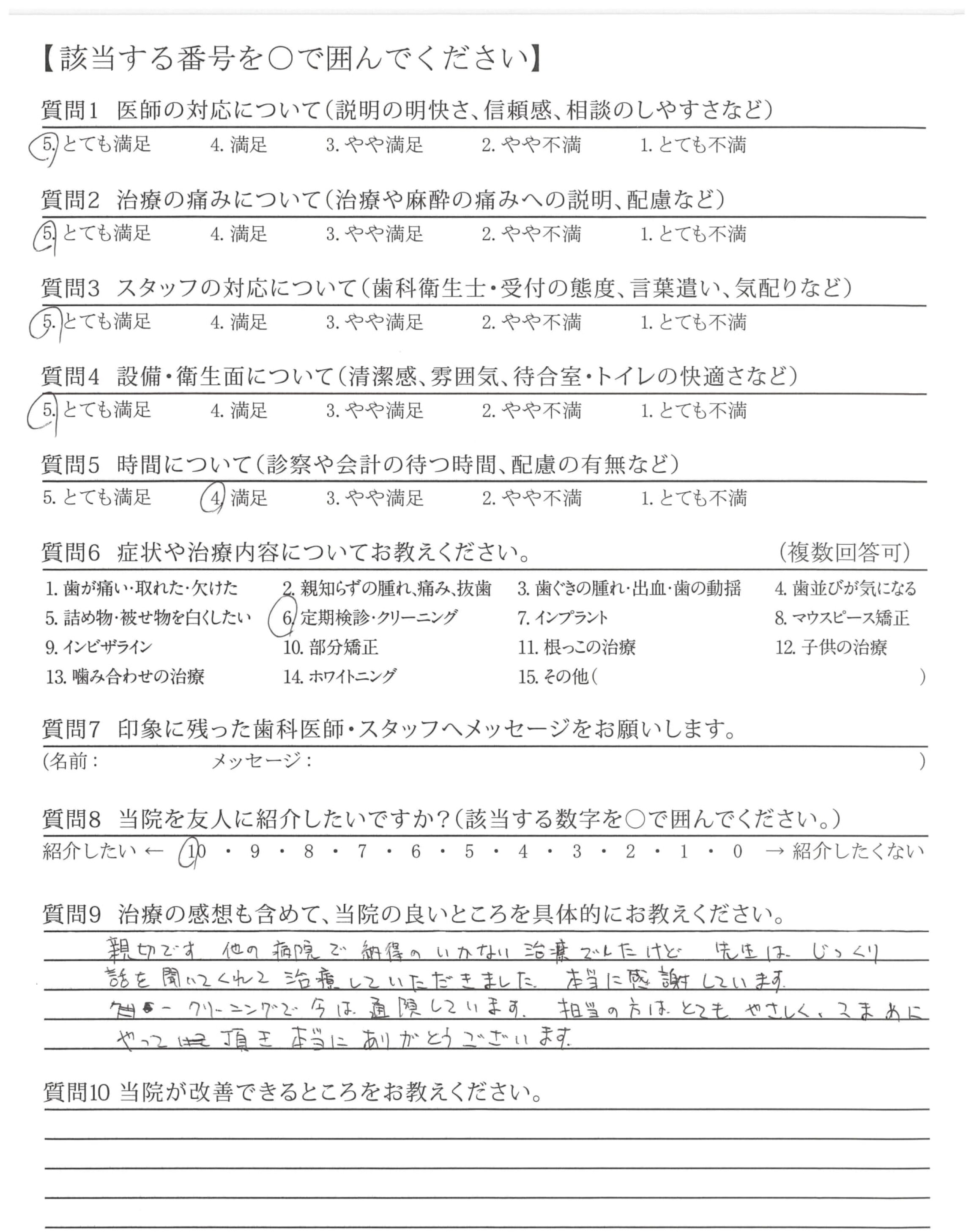 治療について説して下さり、治療についてもピタッとはまり、その後全くトラブルもなく安心しています。また歯科衛生師の方もクリーニングが上手で安心しています。歳なので口を長時間開けているのがつらく、クリーニングの途中で口をすすぐことをうながして下さりとても助かっています