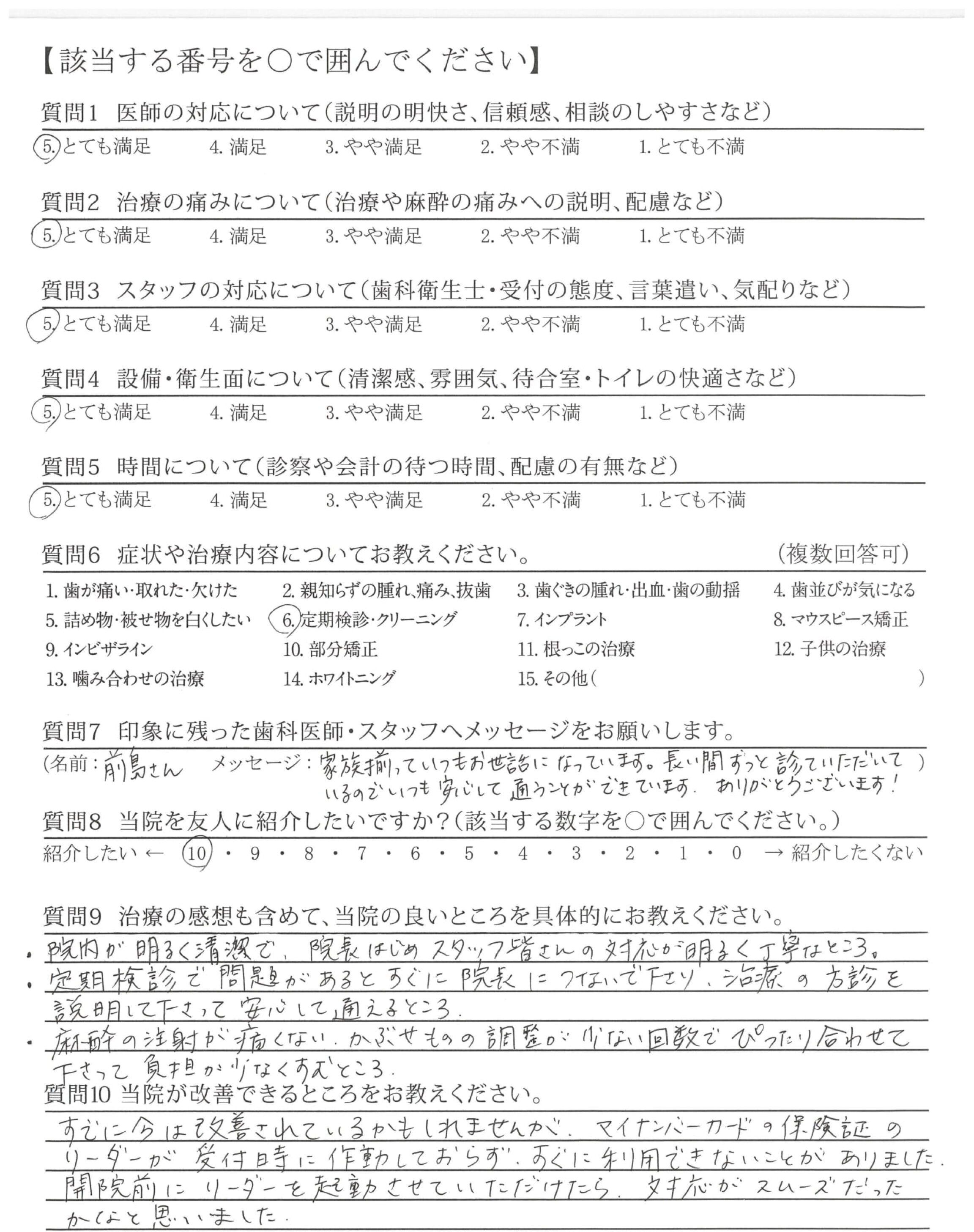 定期的に見ていただくことで、通い始めてから大きなトラブルもなく、歯を大切にすることができています。普段に歯のみがき方や食生活に至るまでのアドバイスが大変ありがたいです。