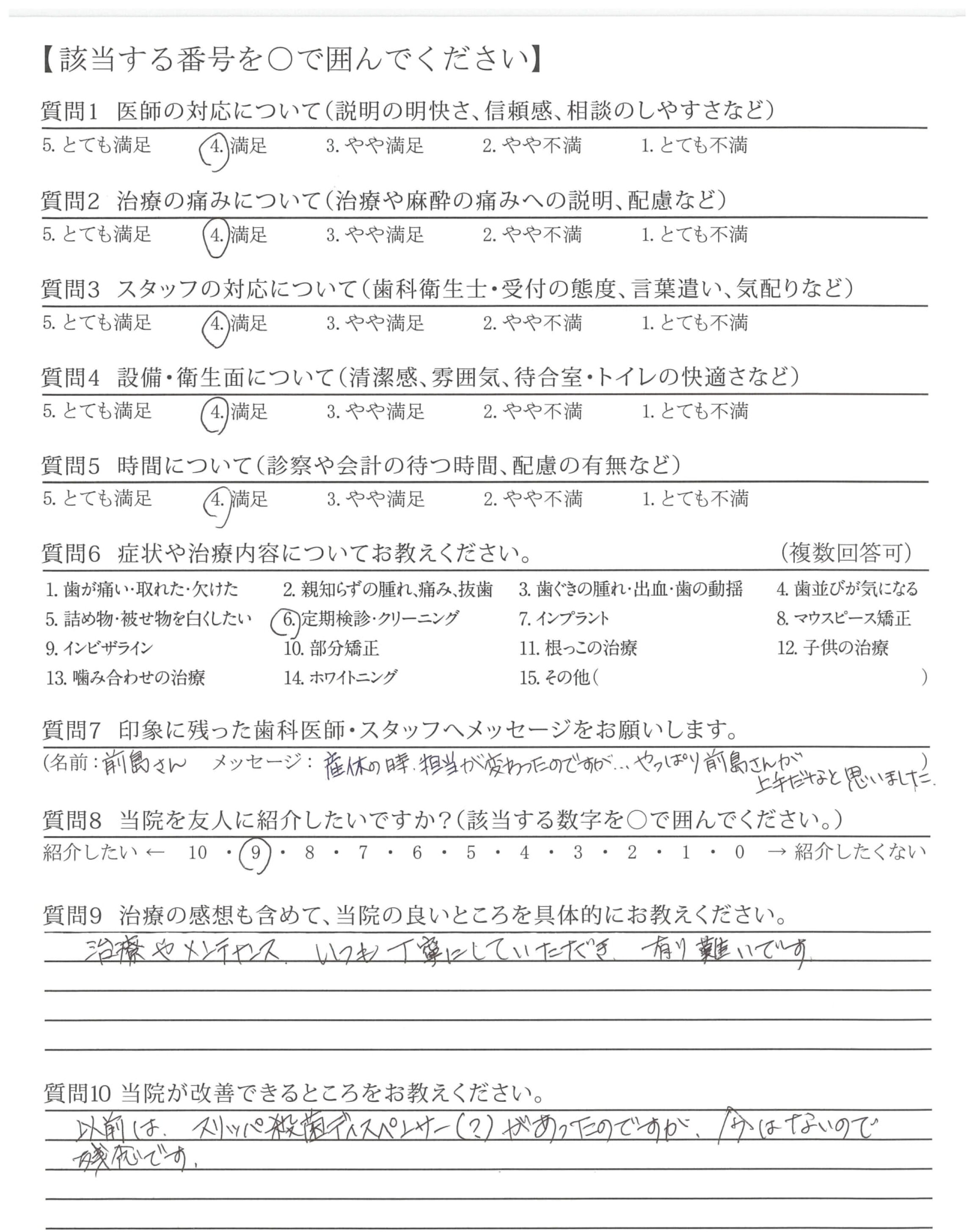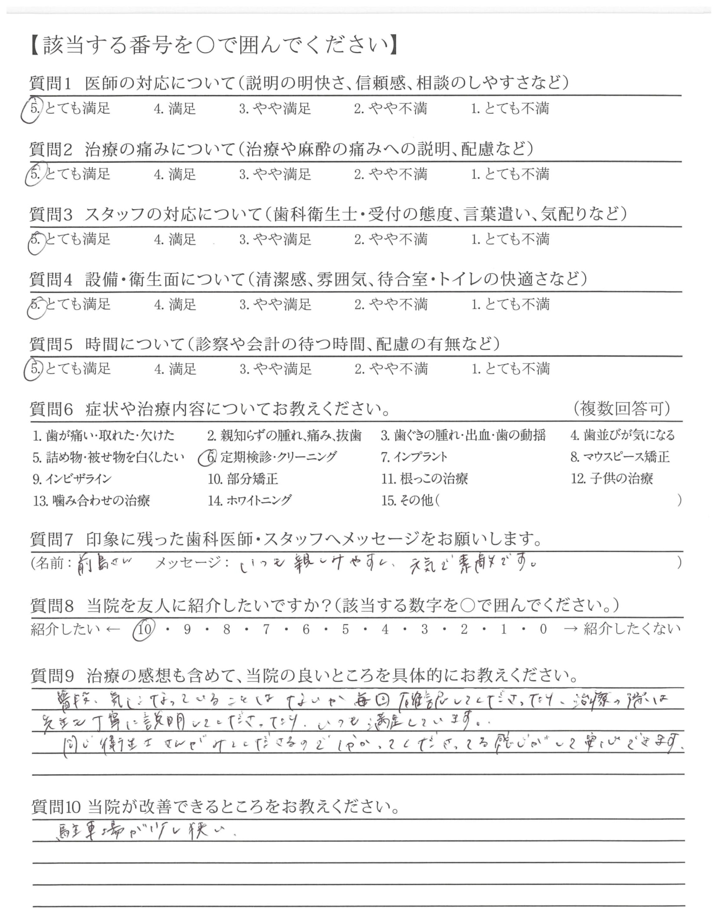 ・担当する方が決まっているのが良いと思います。前回をふまえてケアの話をしてくれるので、助かります。(クリーニング)