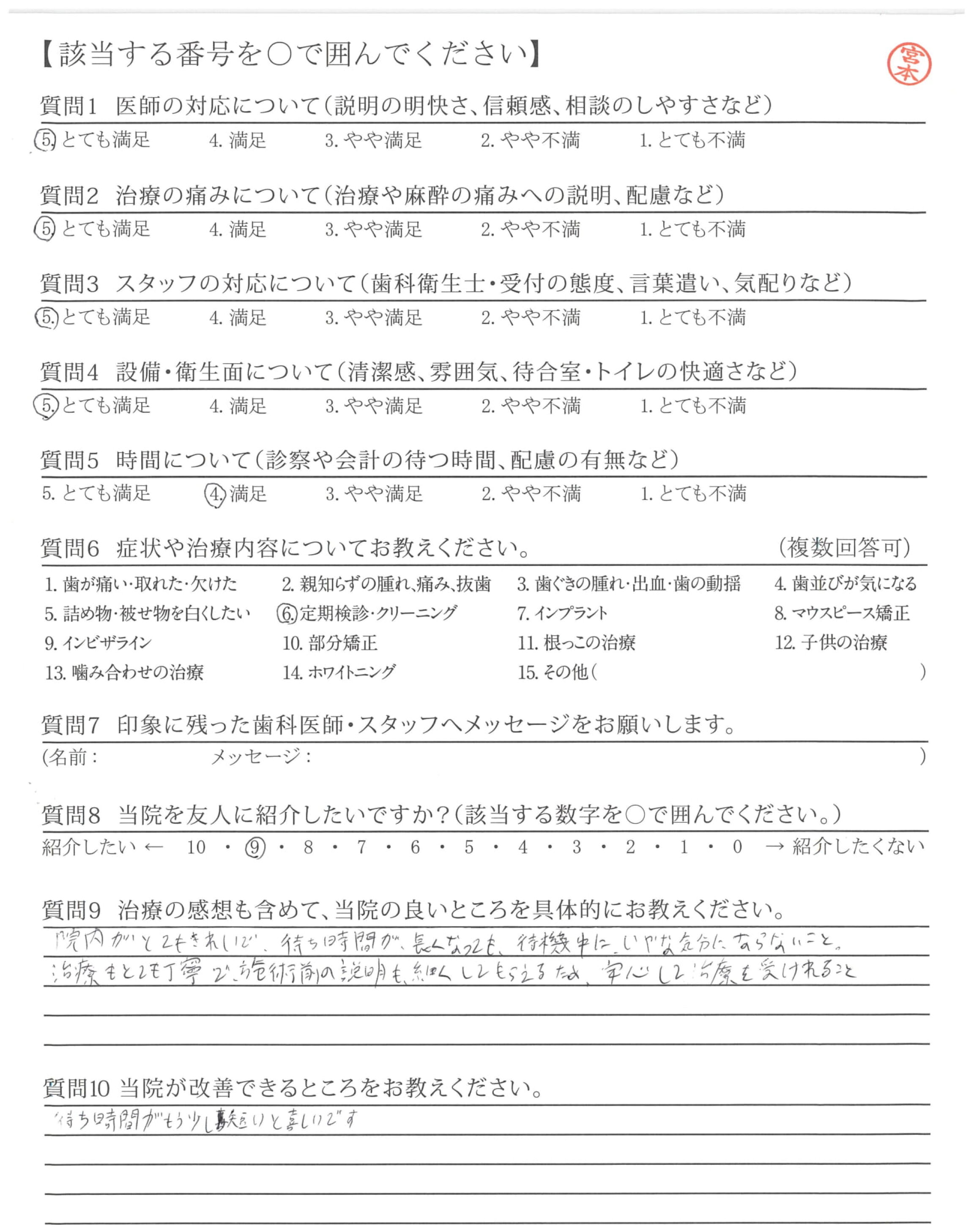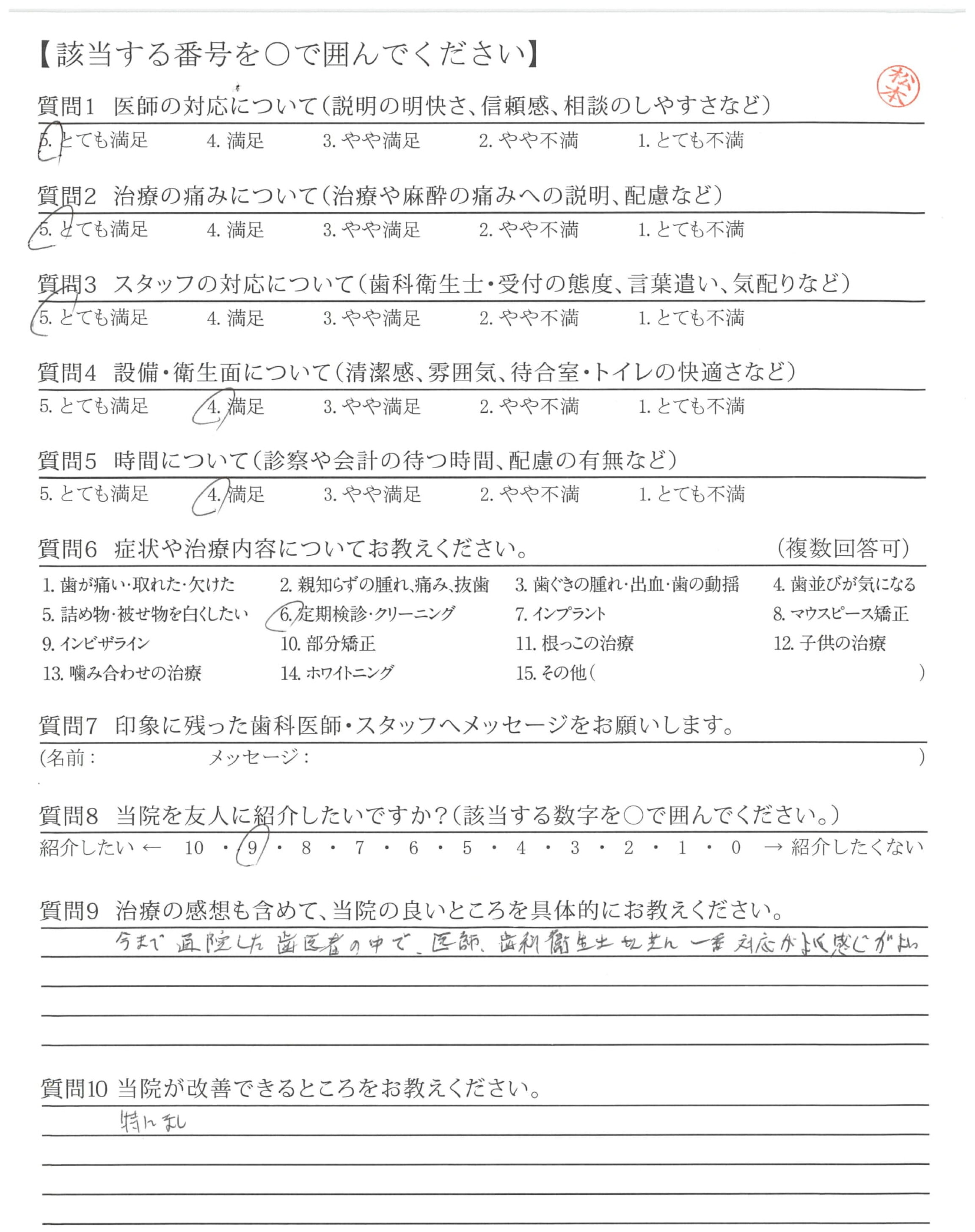 今まで通院した歯医者の中で、医師、歯科衛生士さん一番対応がよく感じがよい