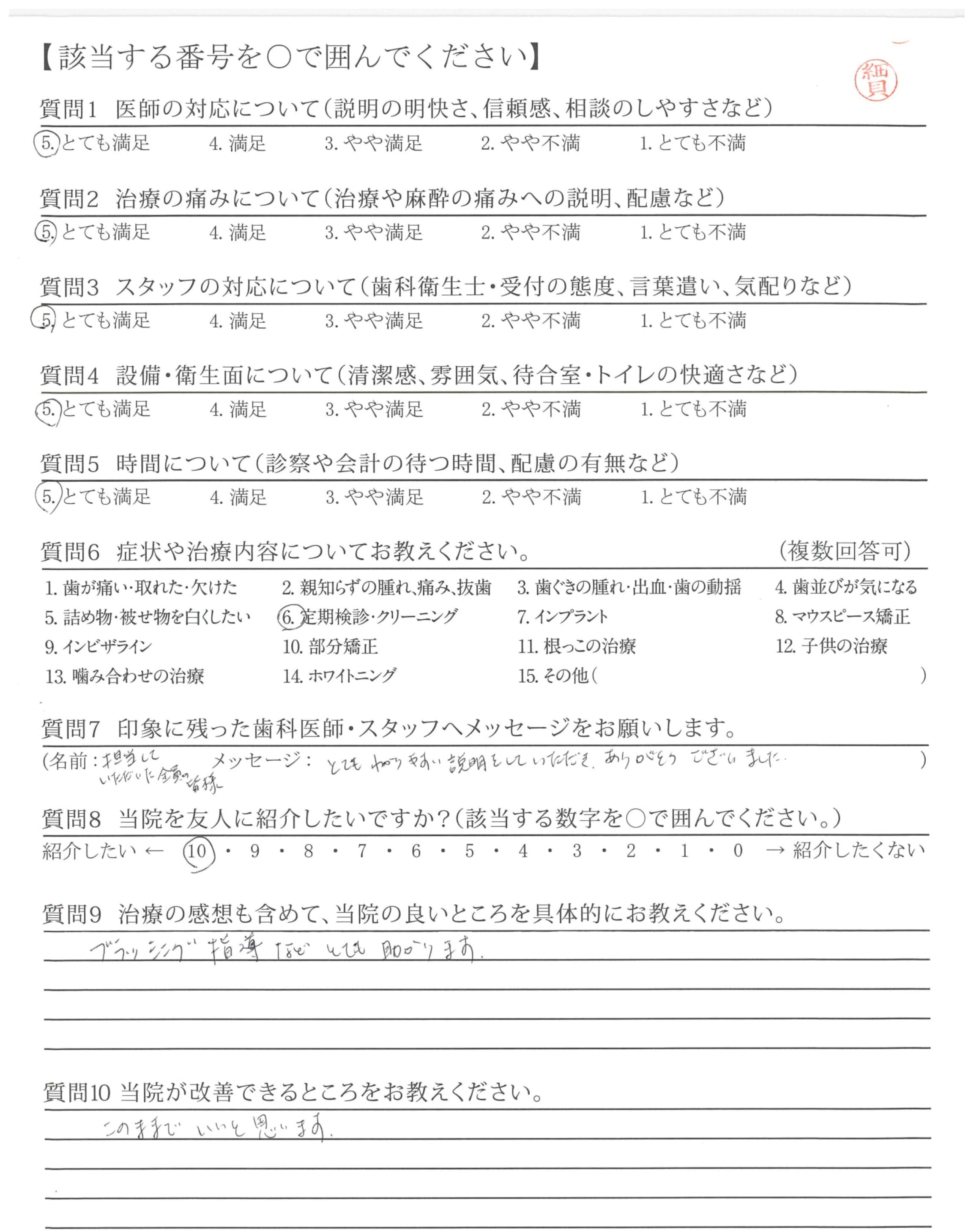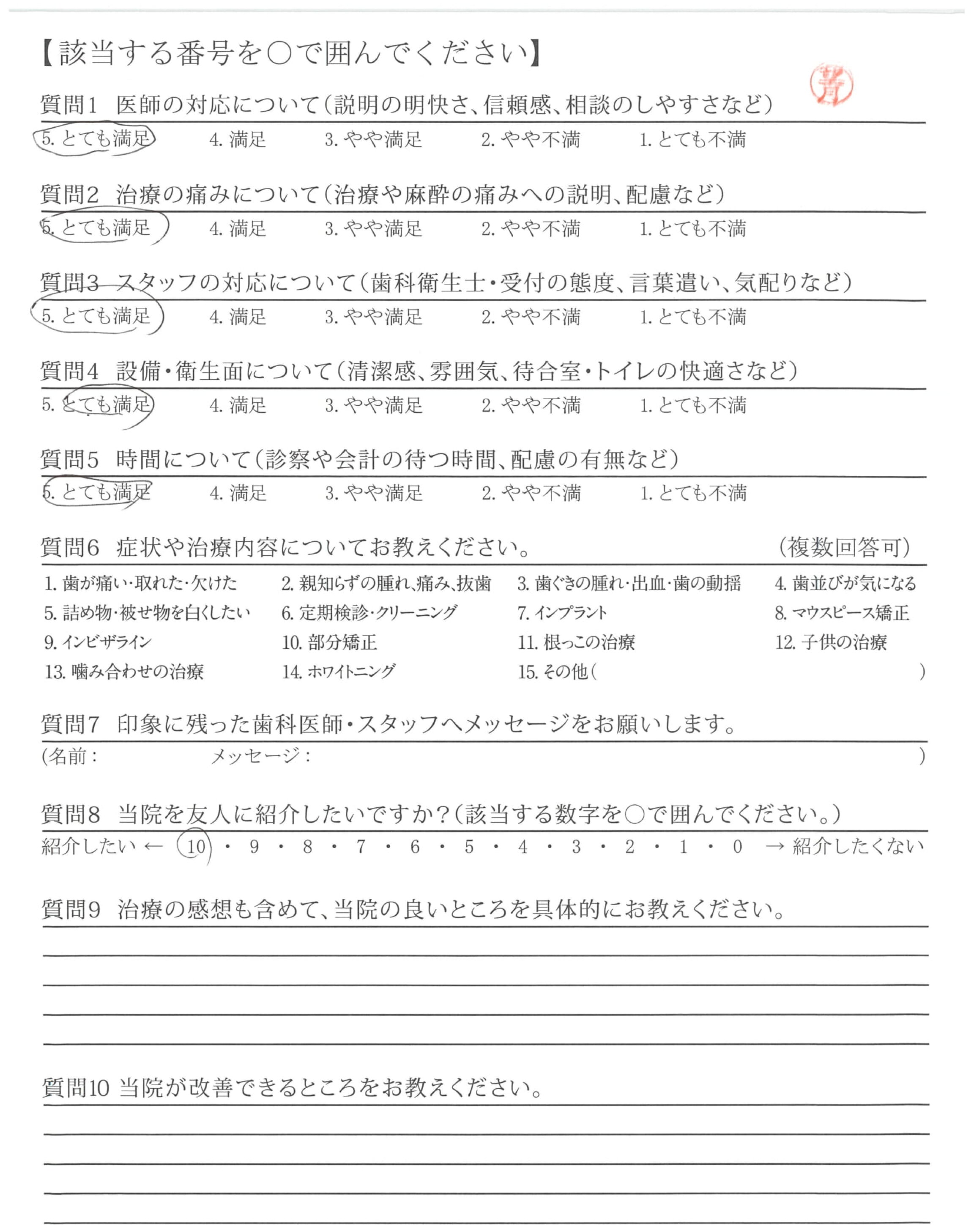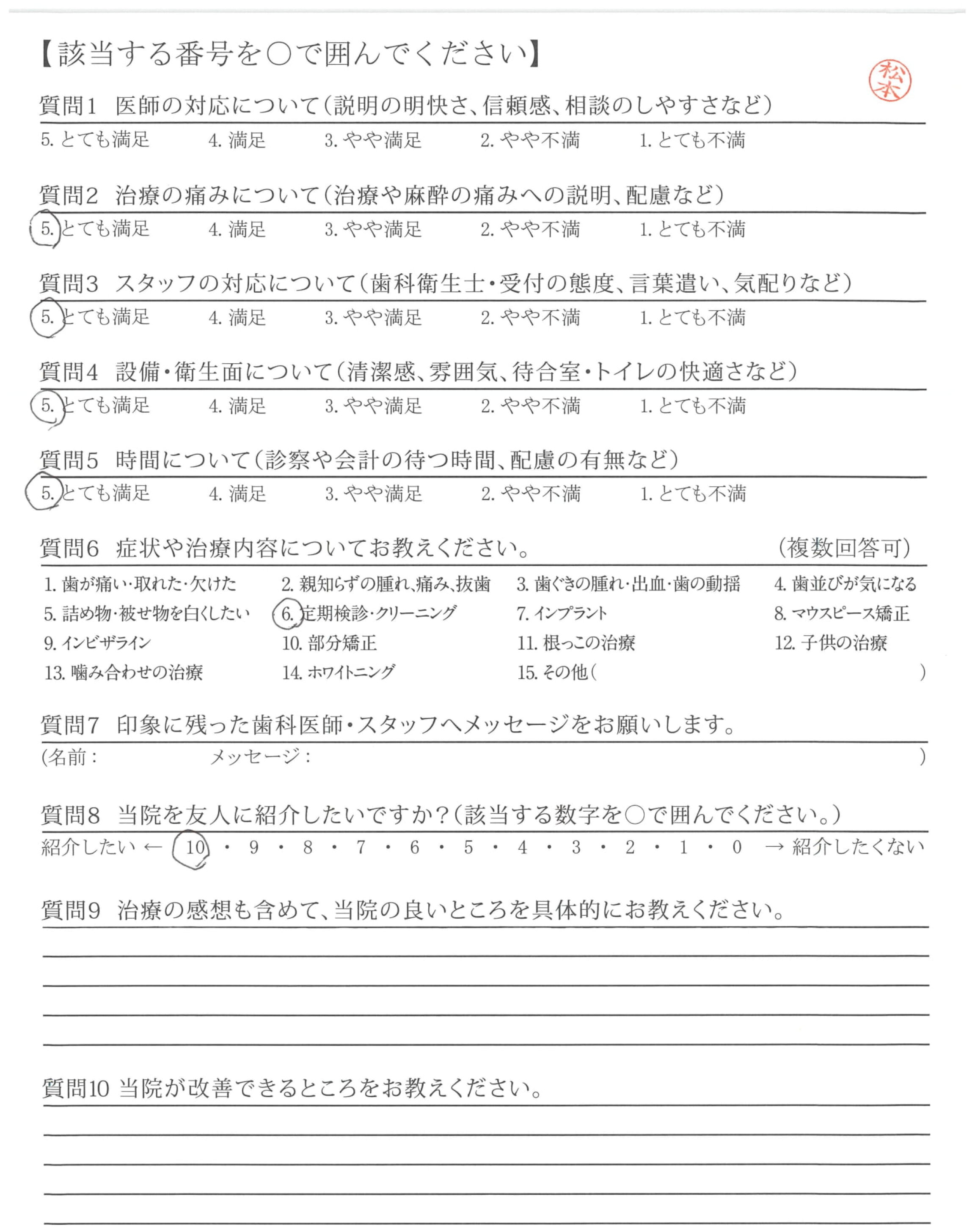 当サイトに掲載しているアンケートは、第三者機関である日本歯科医療評価機構が医院の協力を得て直接患者さんへ調査を行ったもので、医院では操作のできない客観的な評価です。毎週患者さんから届くアンケート結果を集計し、このページを更新しています。