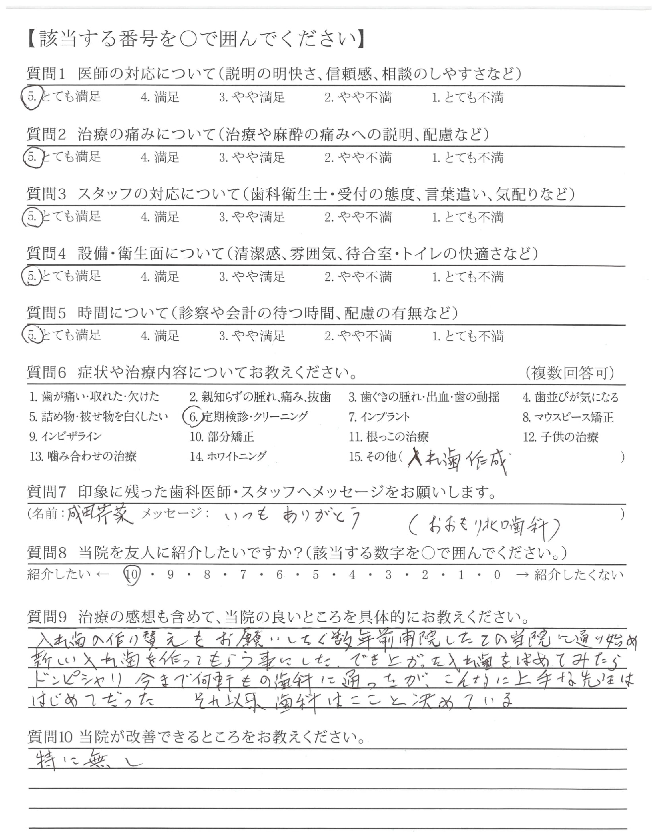 入れ歯の作り替えをお願いしたく数年前開院したての当院に通い始め新しい入れ歯を造ってもらう事にした。でき上がった入れ歯をはめてみたらドンピシャリ今まで何軒もの歯科に通ったが、こんなに上手な先生ははじめてだった