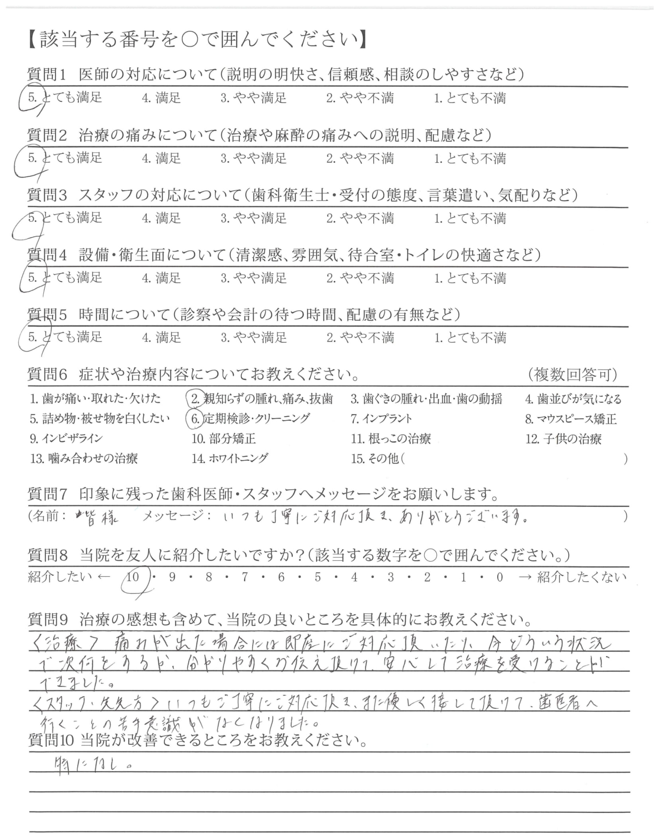 なるべく痛みや不安を感じさせないように治療して下さり、安心出来ました。いつもありがとうございます。