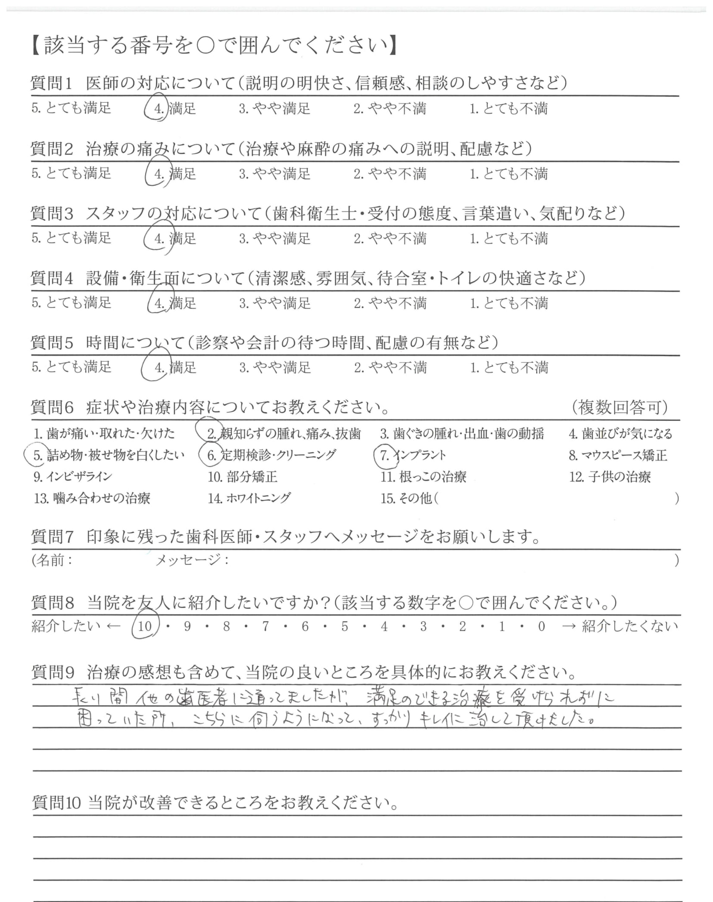 〈治療〉痛みが出た場合には即座にご対応頂いたり、今どいう状況で次何をするか、分かりやすくお伝え頂けて、安心して治療を受けることができました。