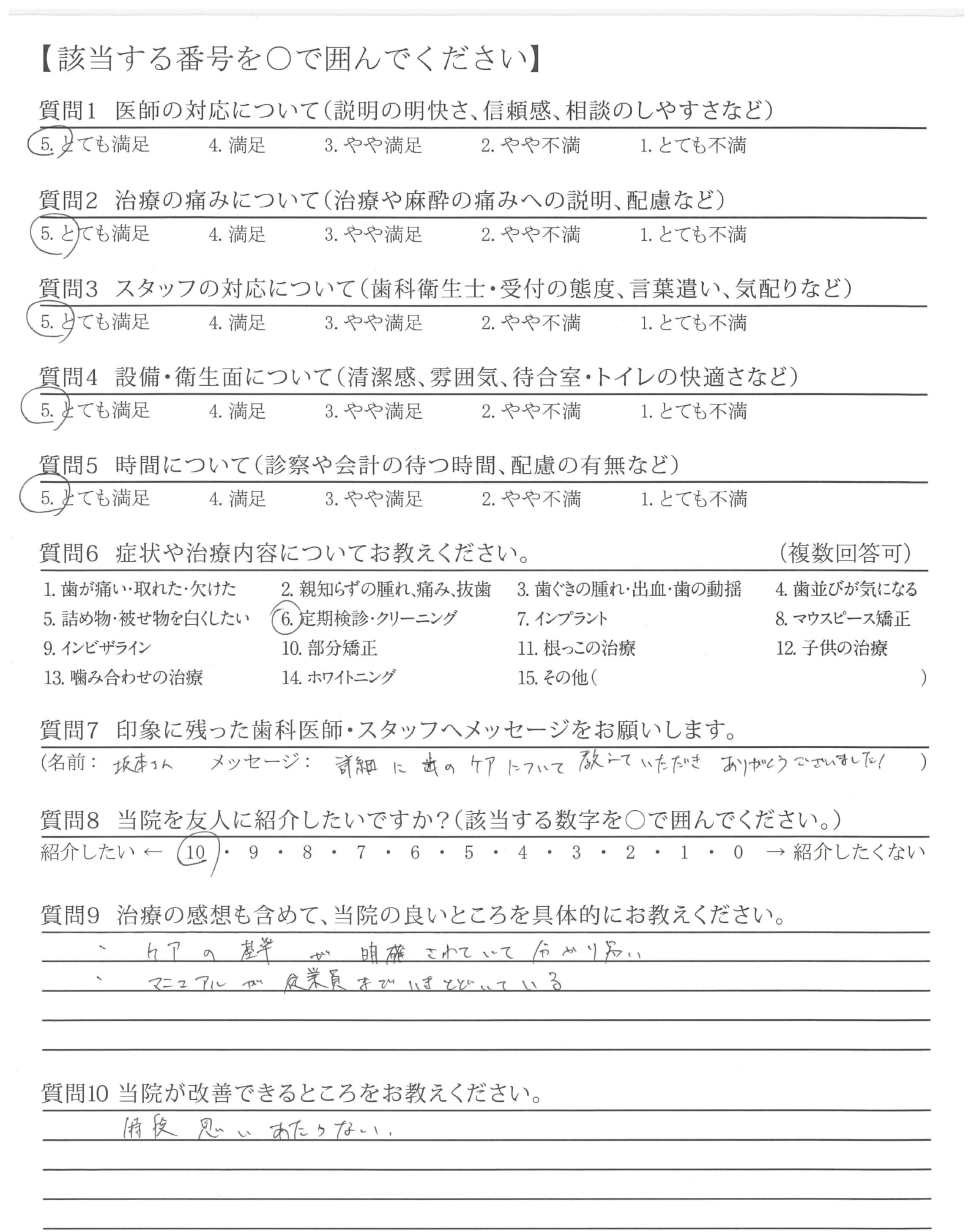 最近はクリーニングで訪れることが多いですが"ここが磨けていません"と一喝するのではなく、"ここをもっと重点的に行うともっと綺麗になりますよ。"と優しくアドバイスいただけるので、日々コツコツ頑張れているのではと思います。