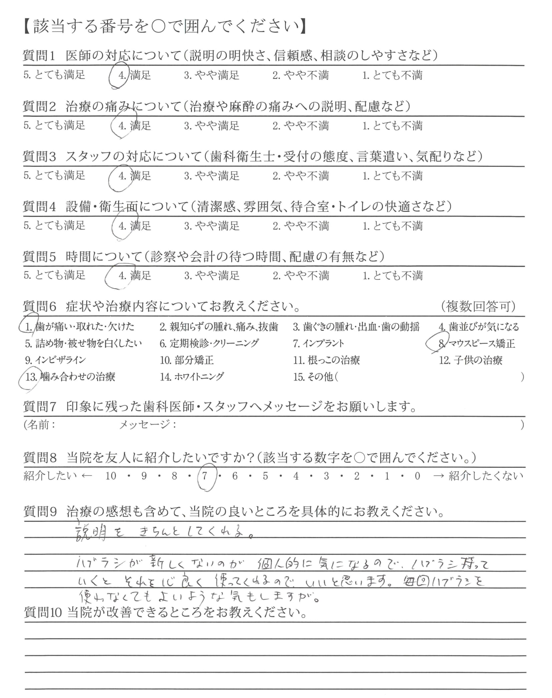 治療の手順や歯状況の説明がわかりやすく、安心して治療できた。
