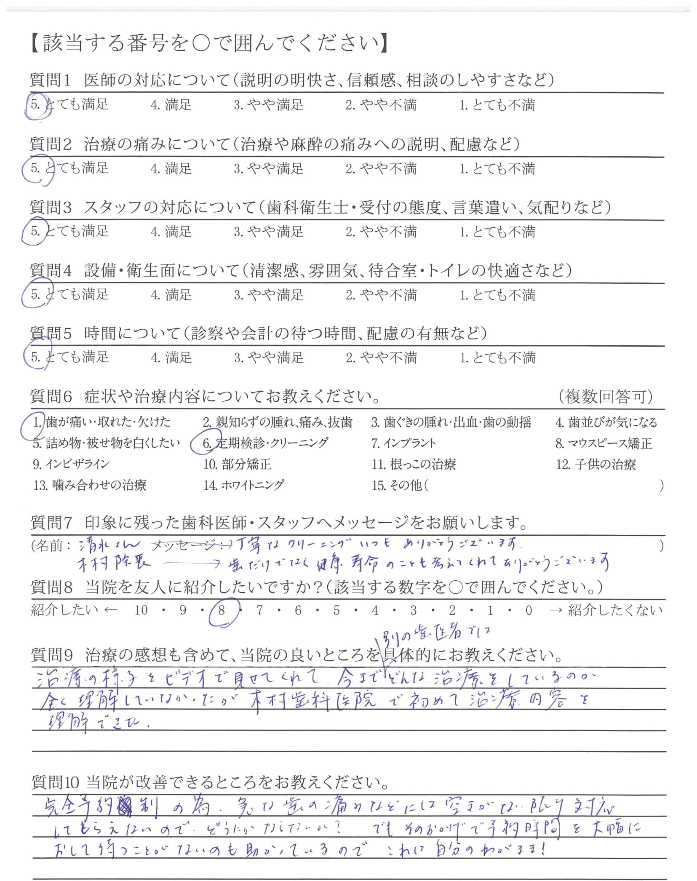 いつも丁寧に説明、治療していただき、安心しておまかせできました!ありがとうございました!!