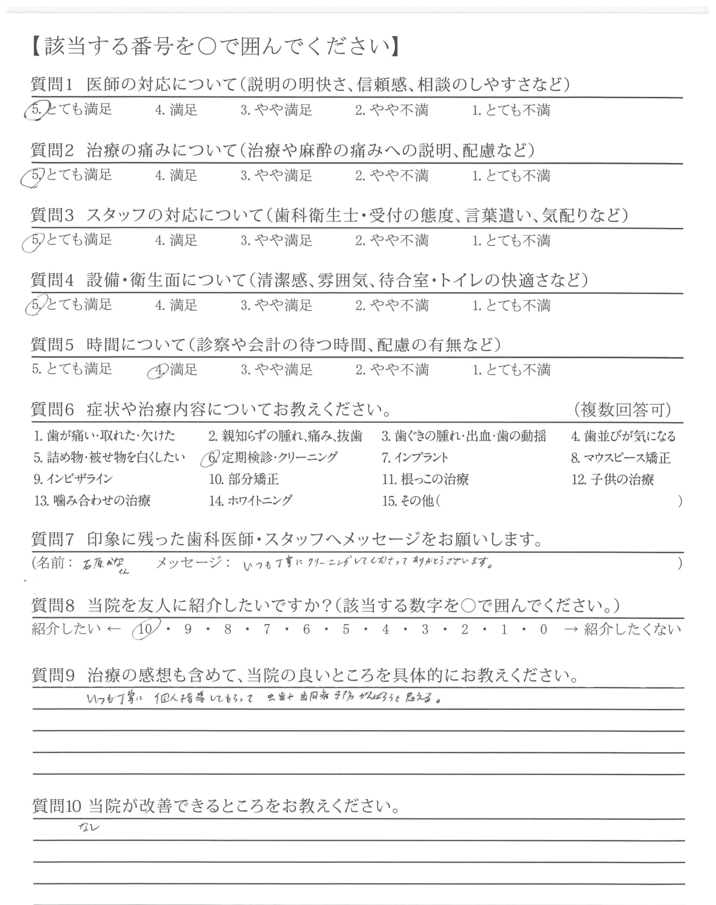 質問をすると適切な解答をくれたり、フロスやみがき残しが多い歯のみがきかたなど親切にアドバイスをくれるのでたすかります。