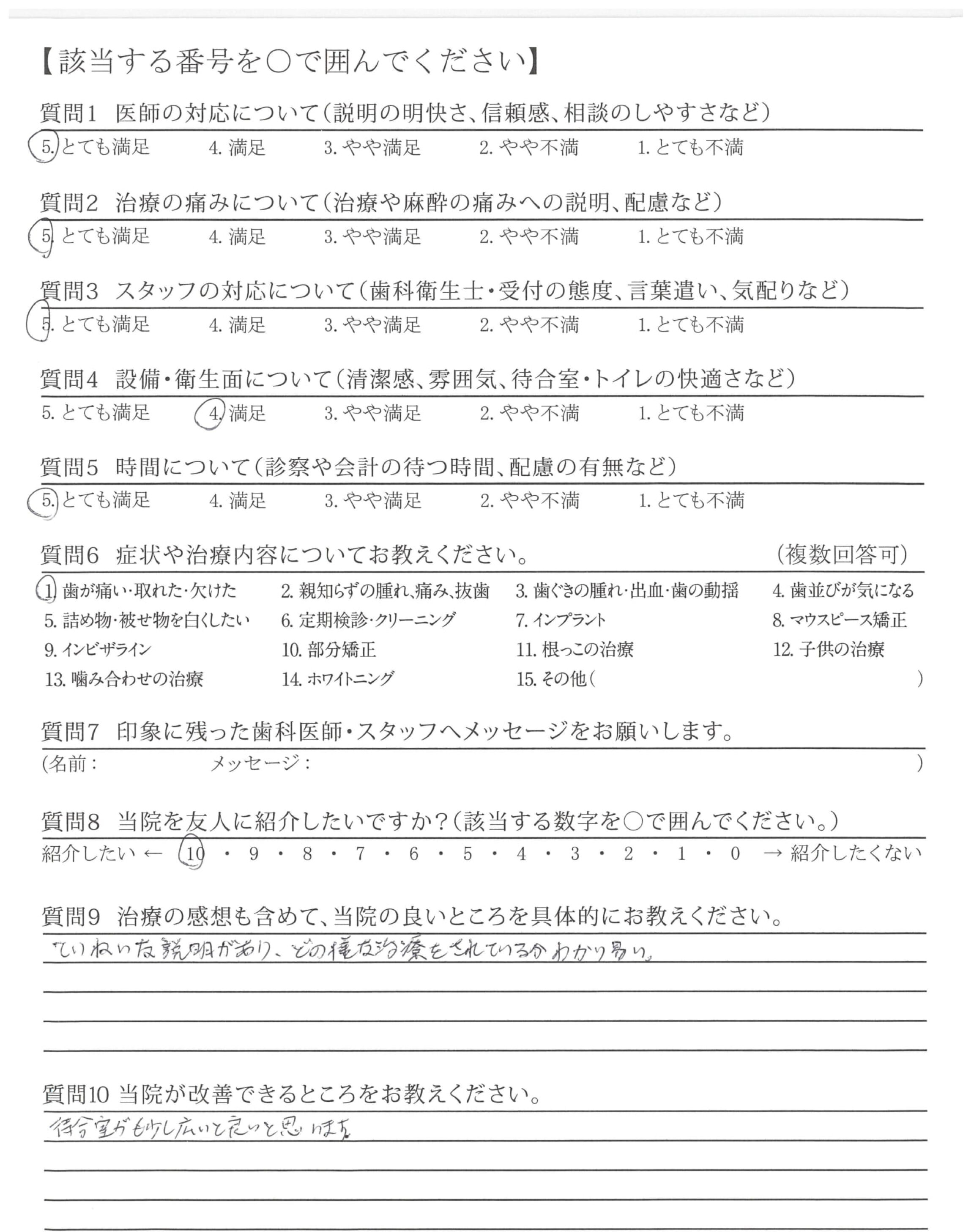 治療前には治療内容の説明をていねいにして下さり、不安なく治療がうけられております。治療中も声をかけて下さいますし治療後、今後起こりうる事の説明かあり、必要時、痛み止めの処方の提案などもあり安心して帰宅できます。