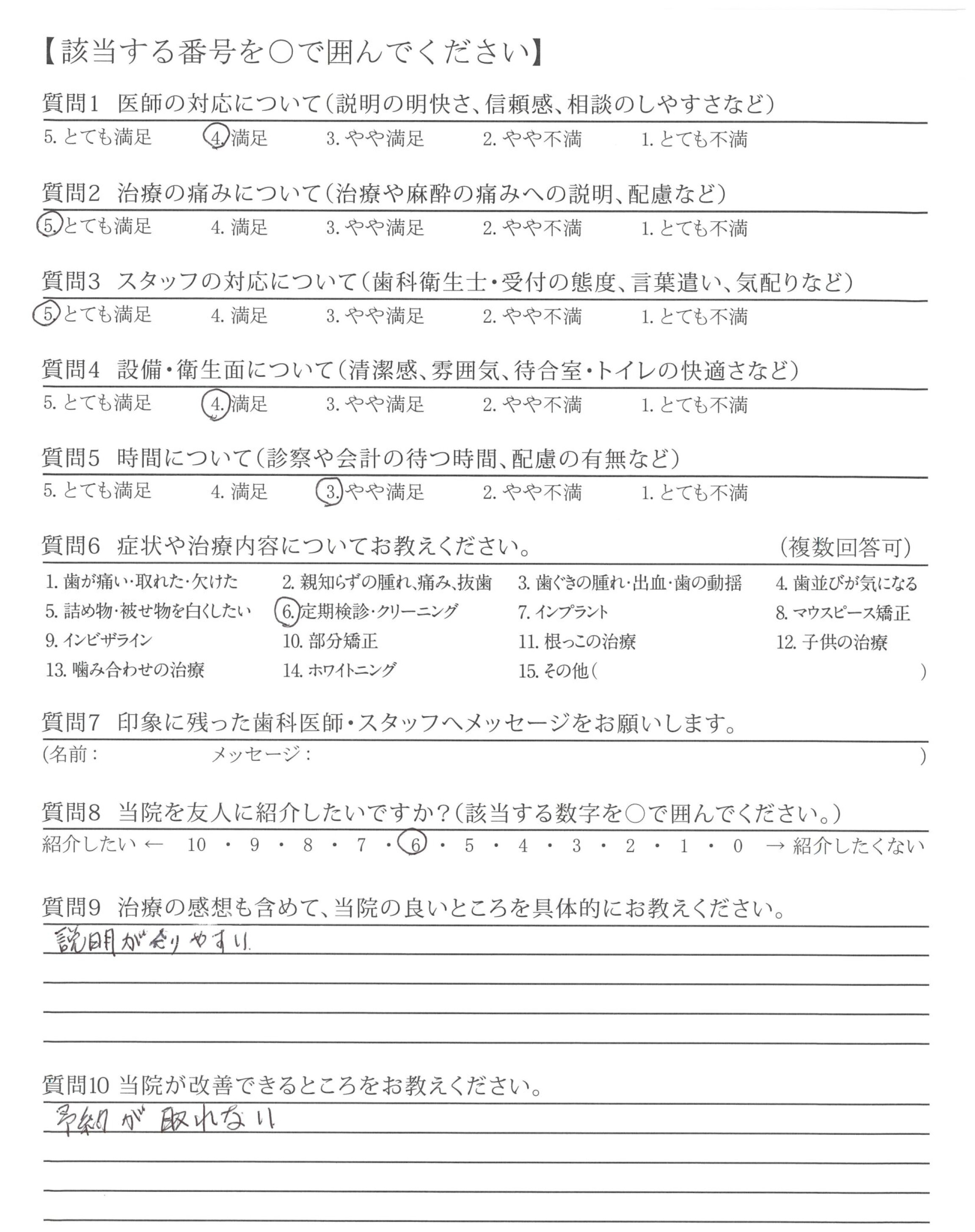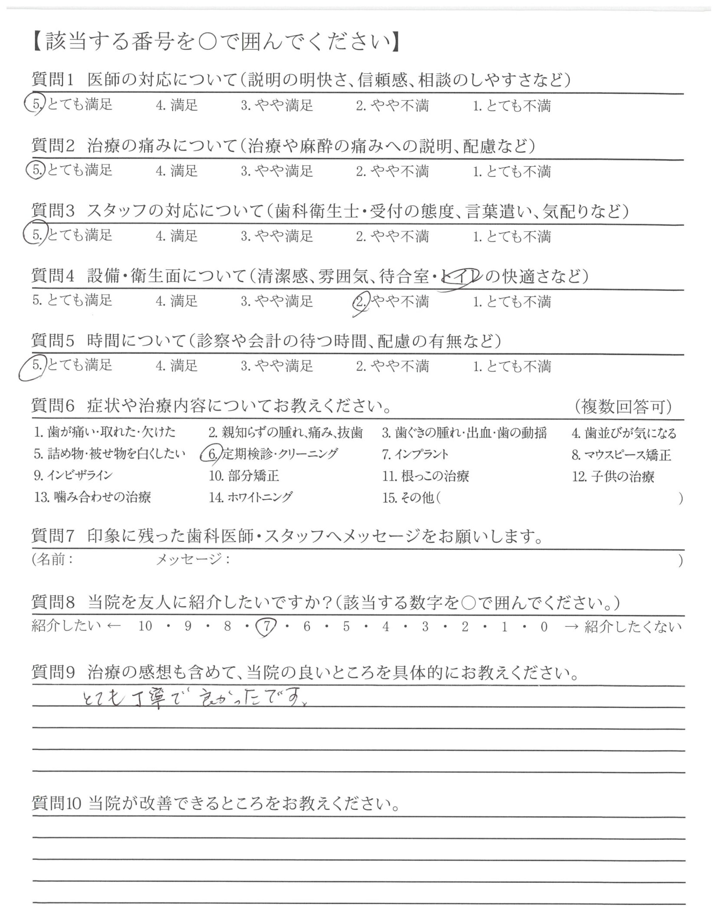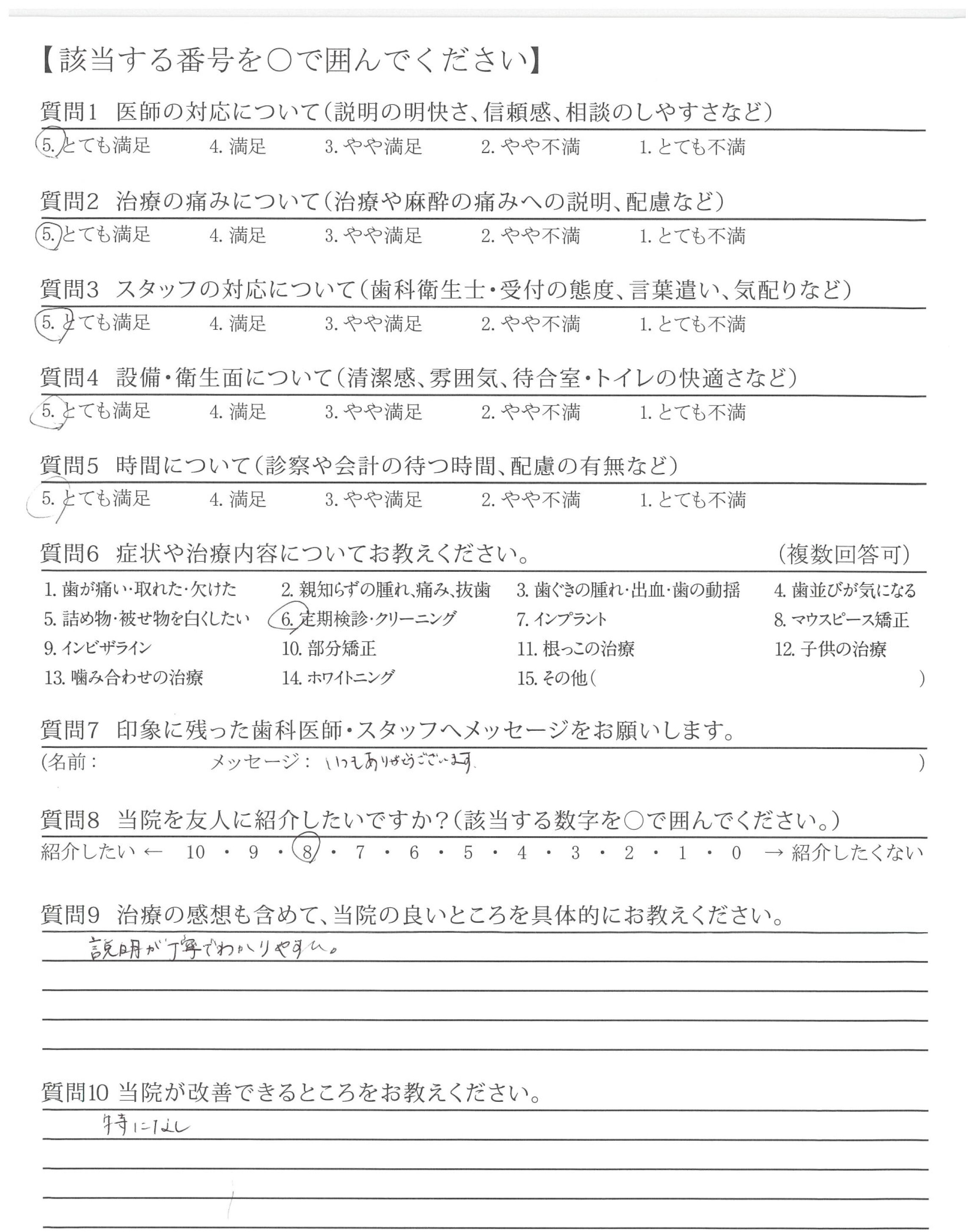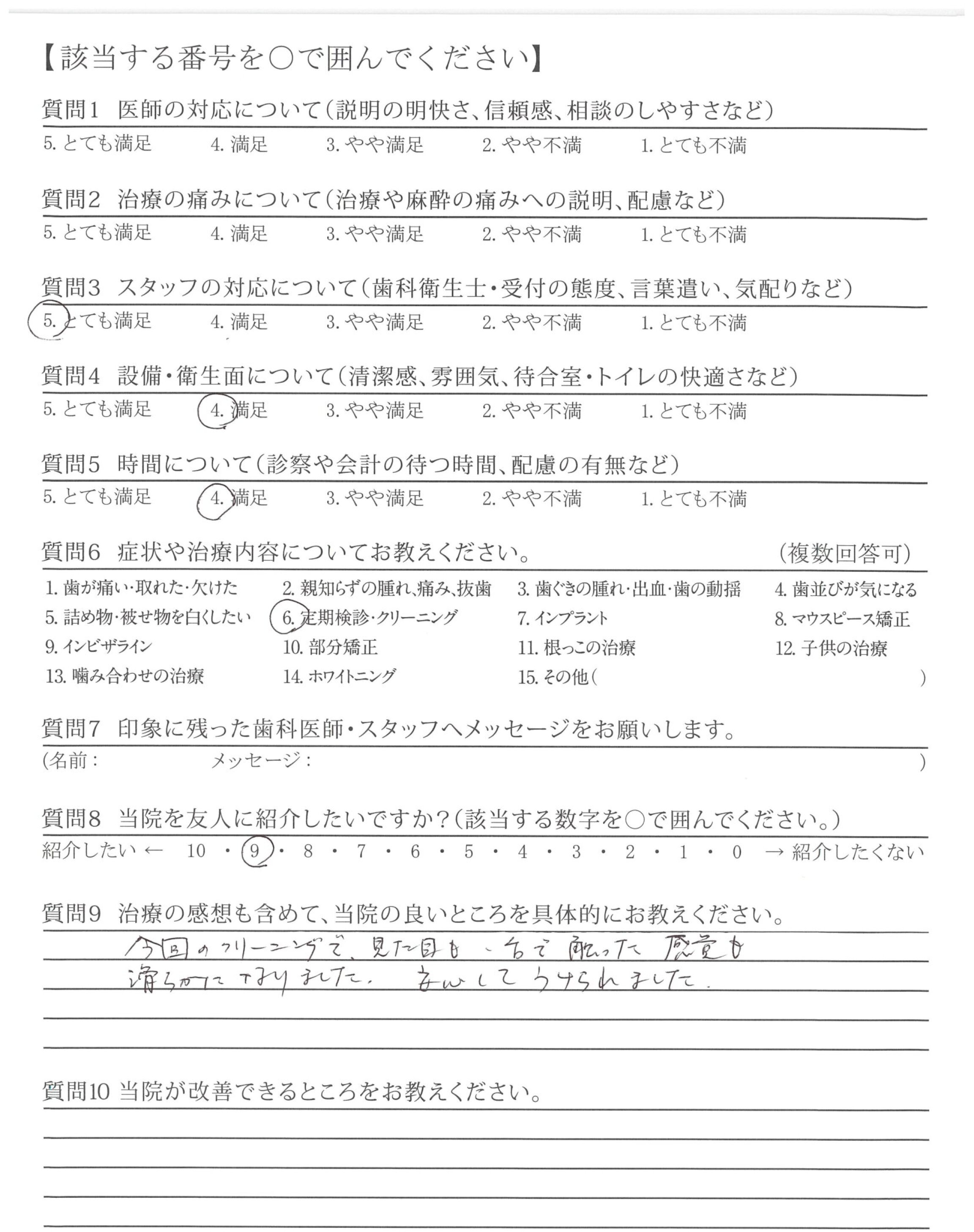 ・歯みがき指導が丁寧で、自分のみがき方の改善が出来、歯も歯ぐきも良くなった。