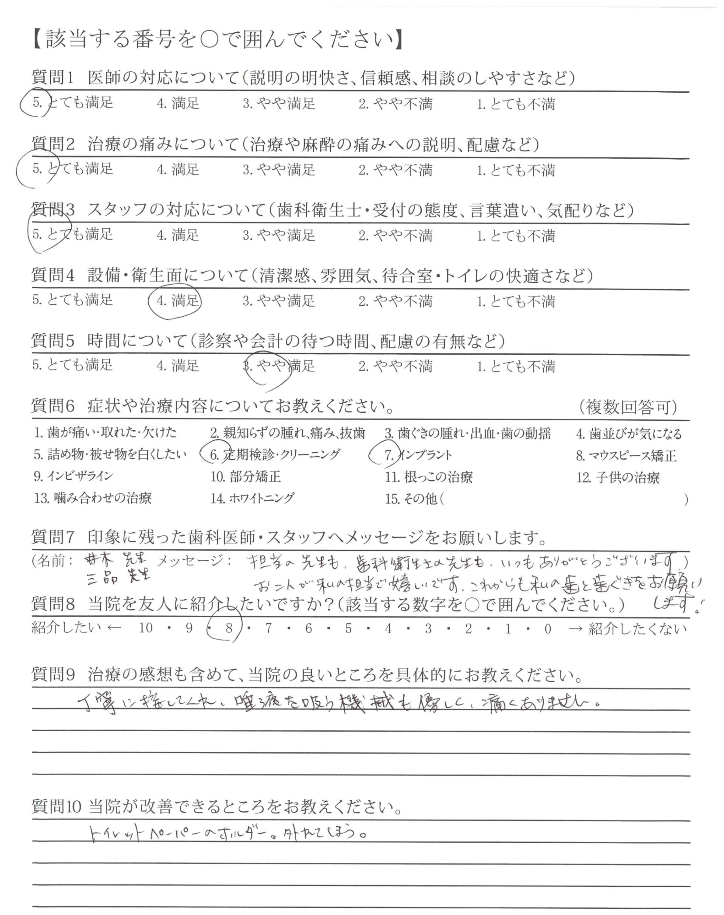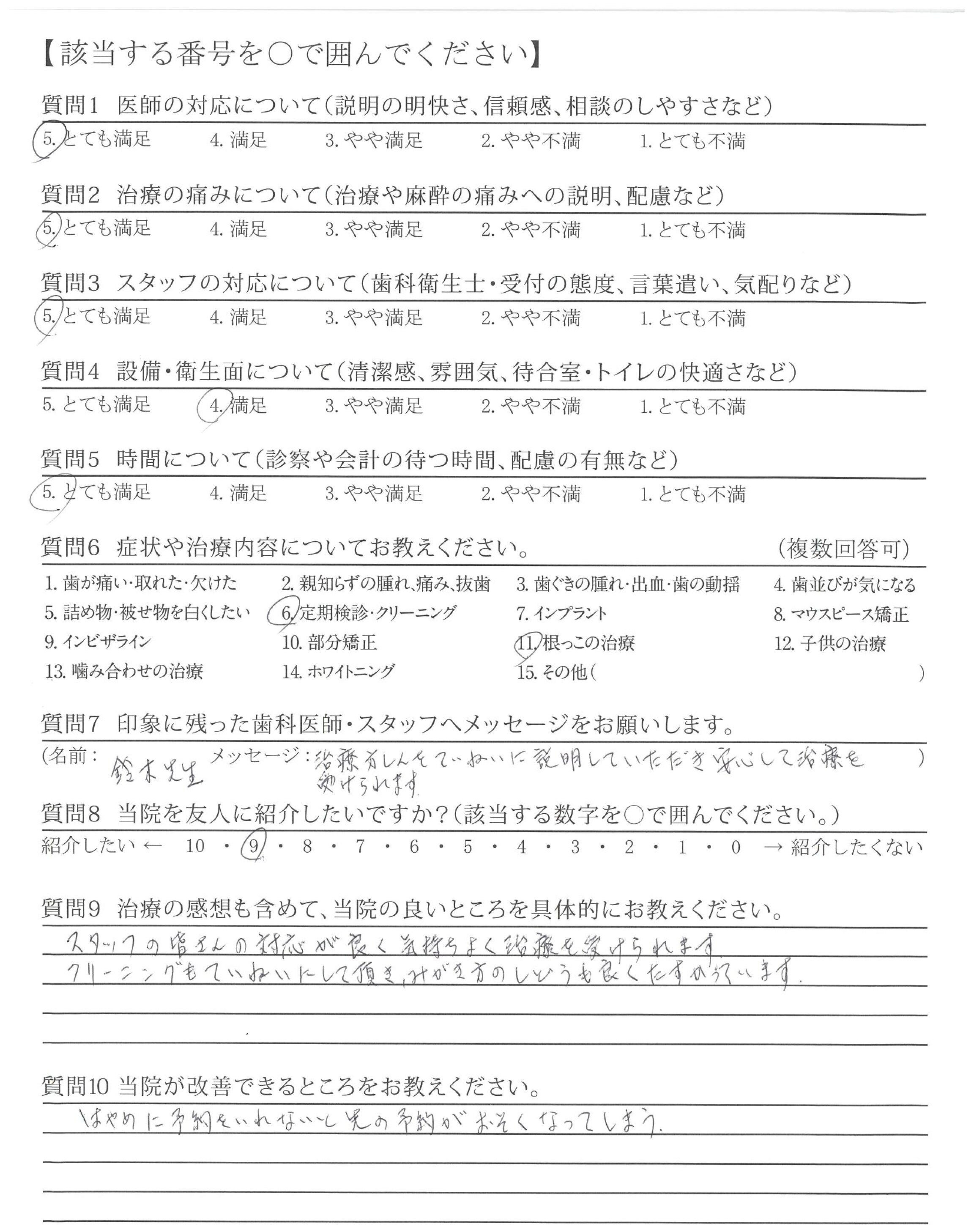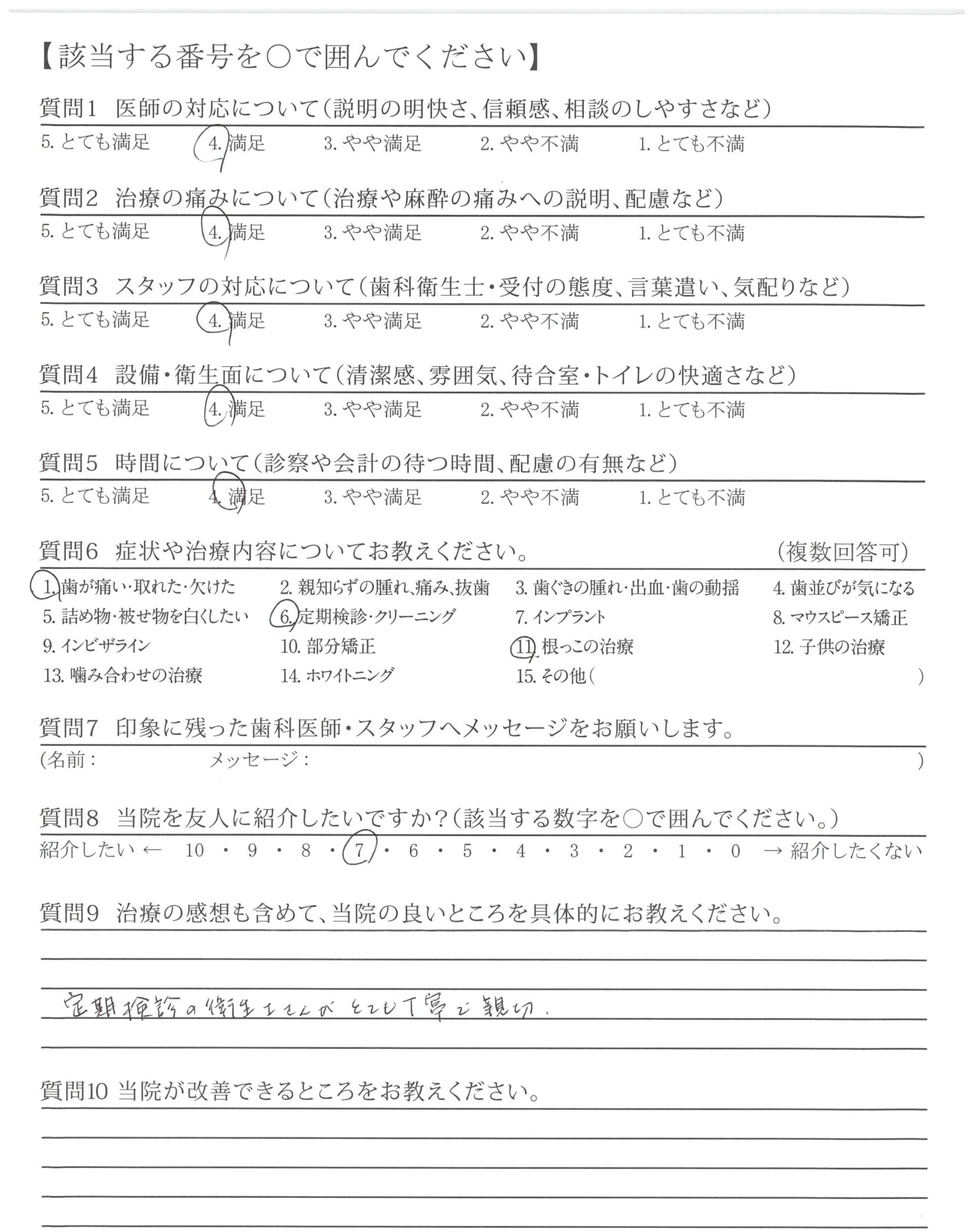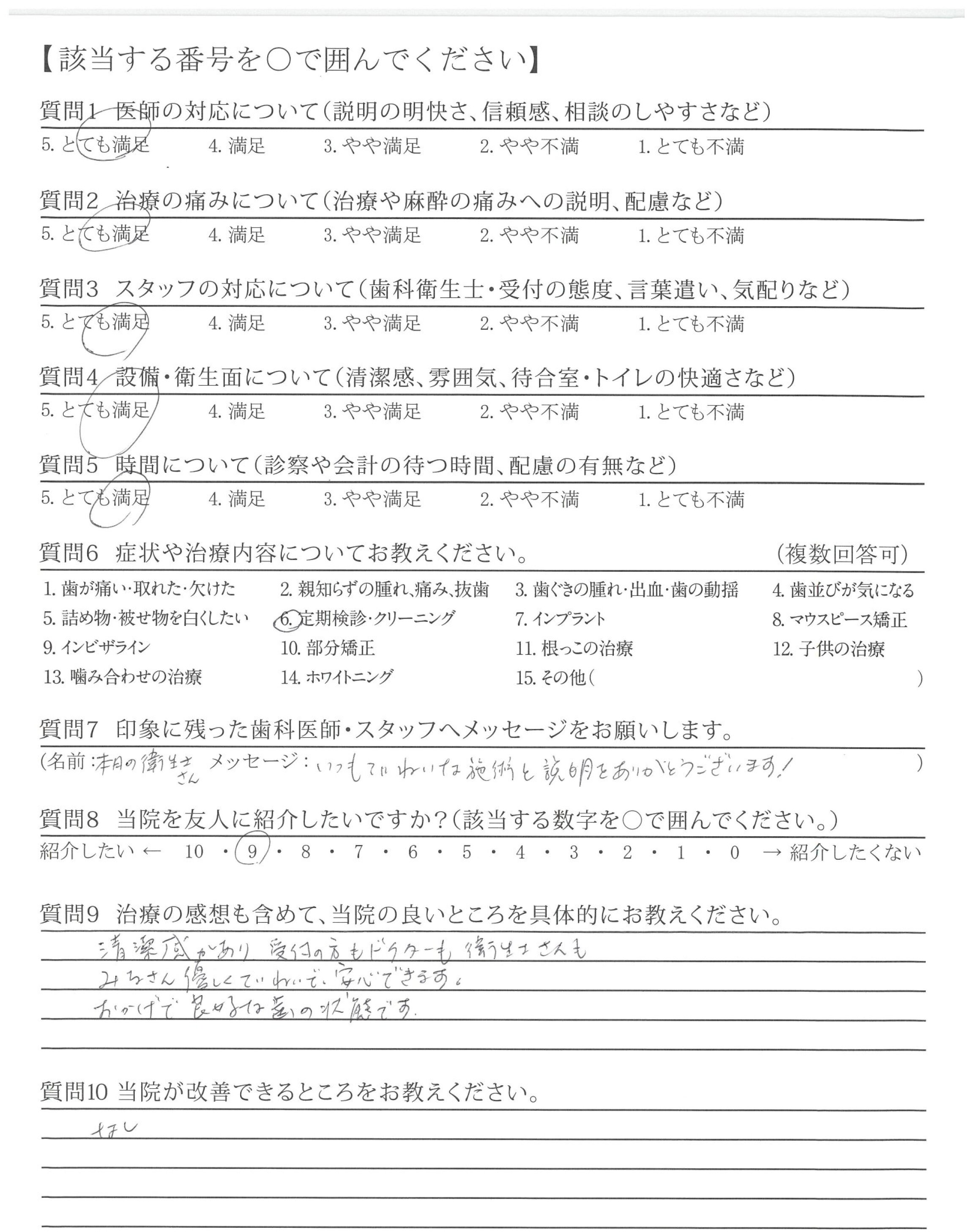 ・歯みがき指導が丁寧で、自分のみがき方の改善が出来、歯も歯ぐきも良くなった。