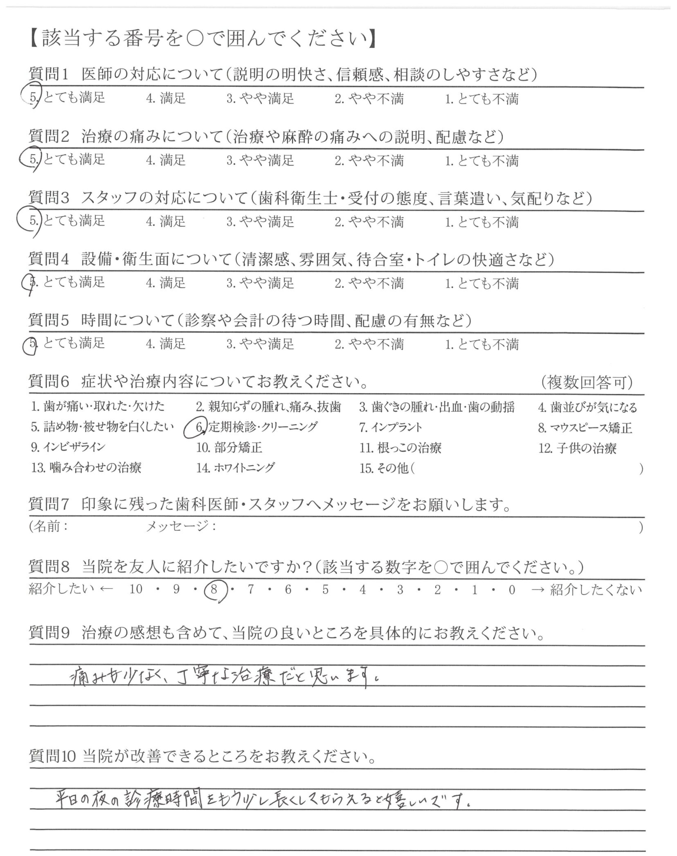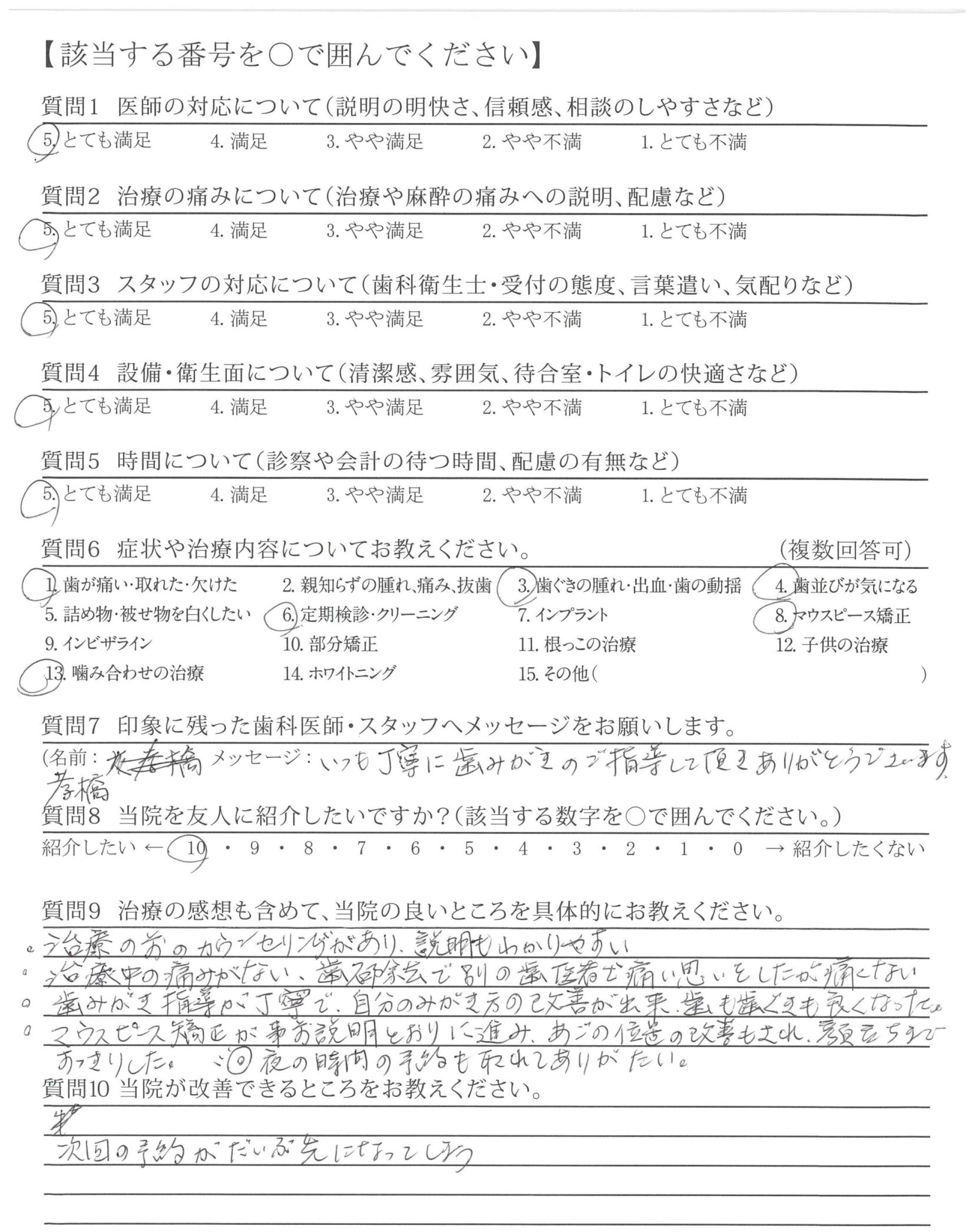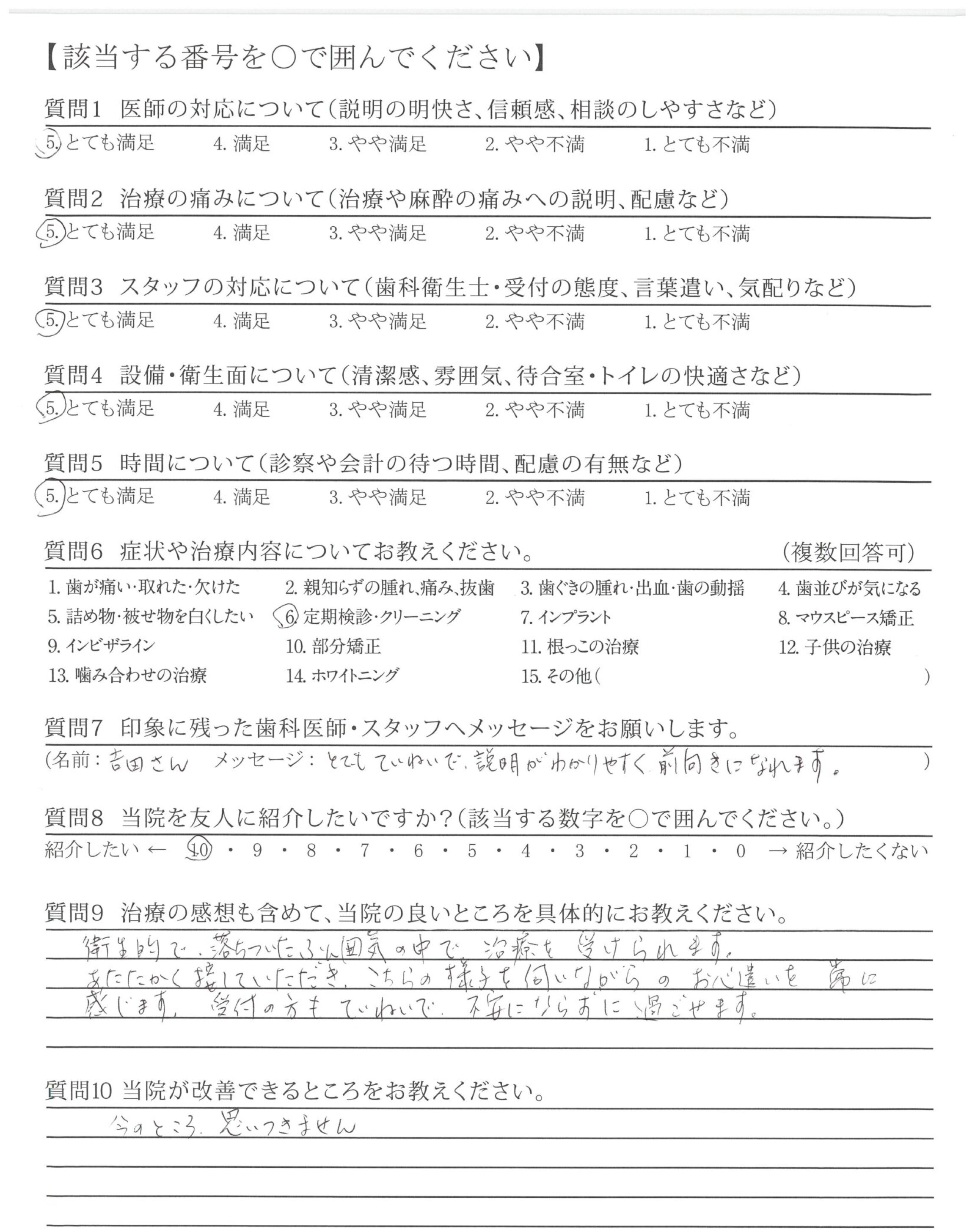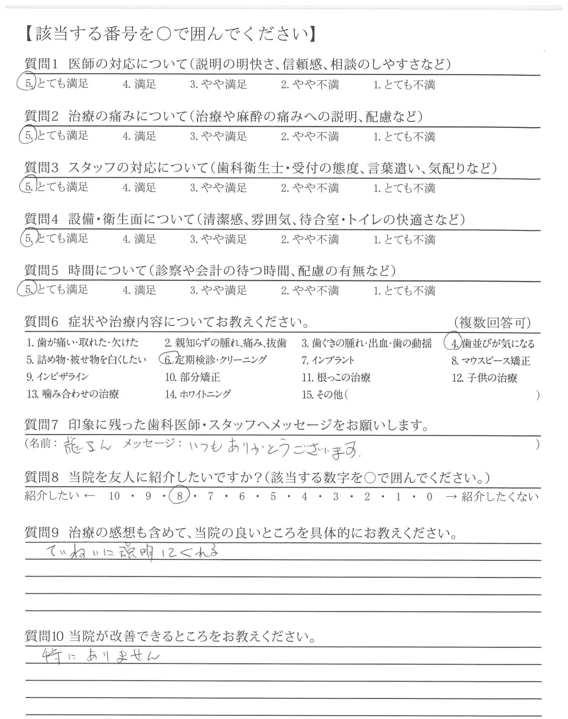 ・歯みがき指導が丁寧で、自分のみがき方の改善が出来、歯も歯ぐきも良くなった。
