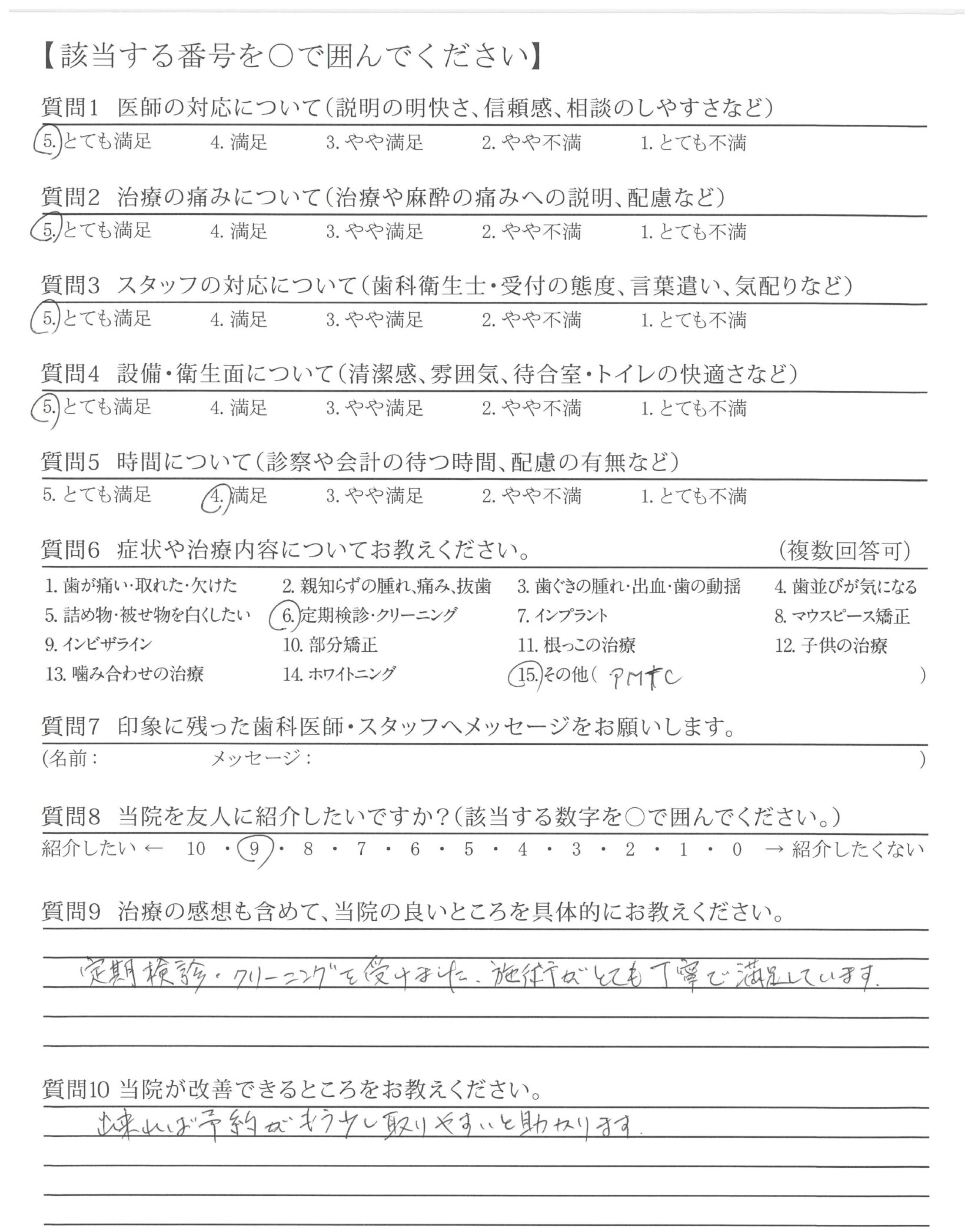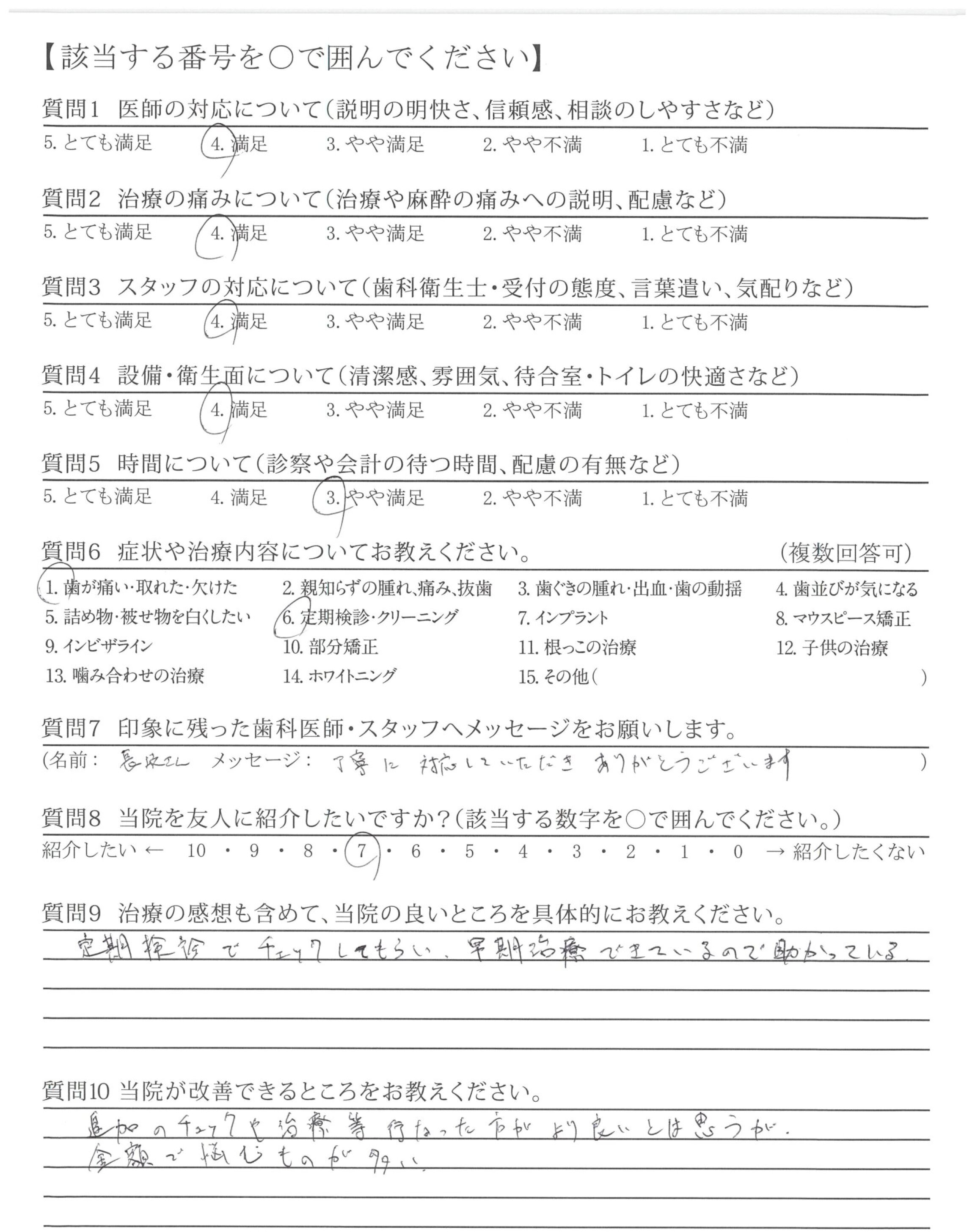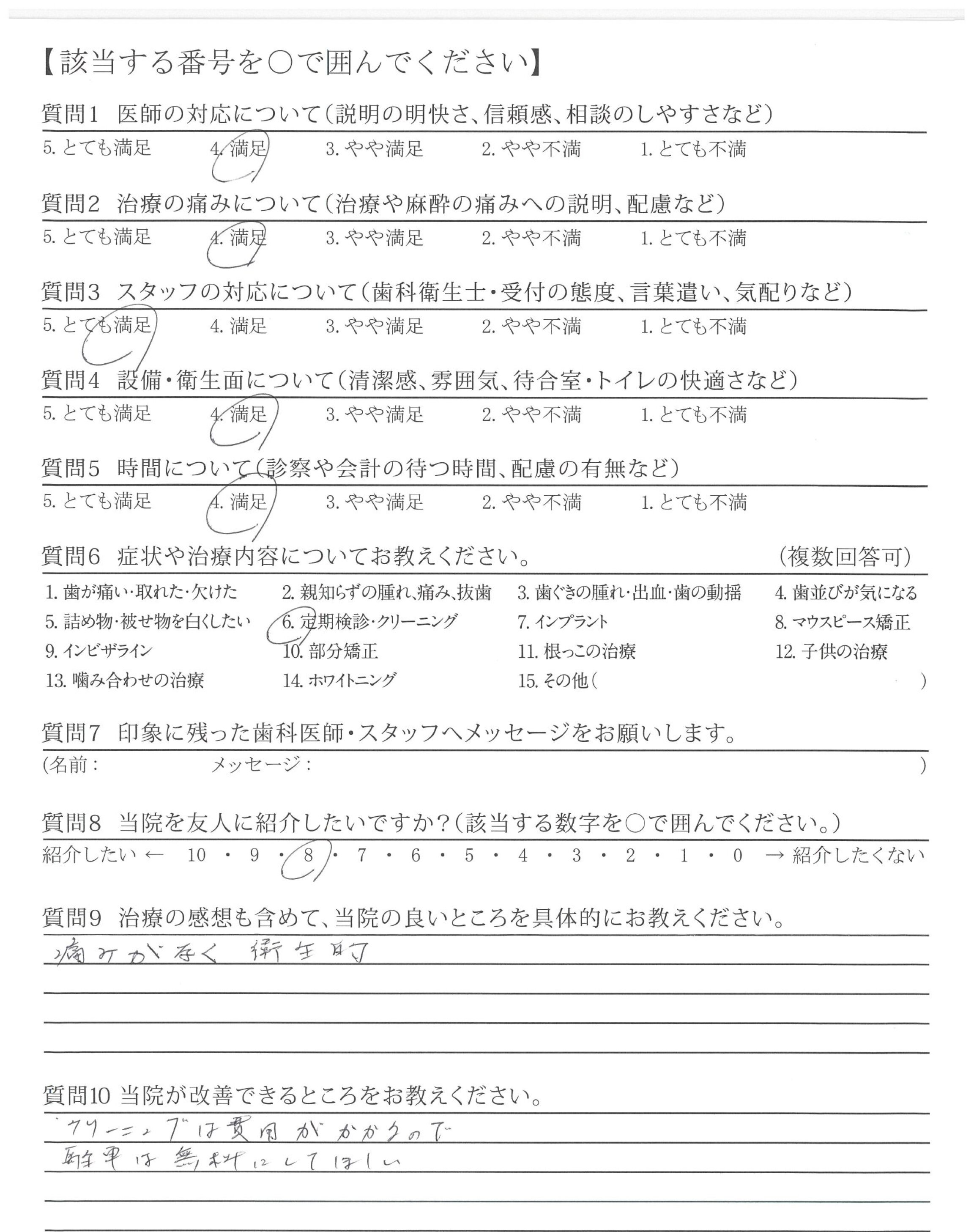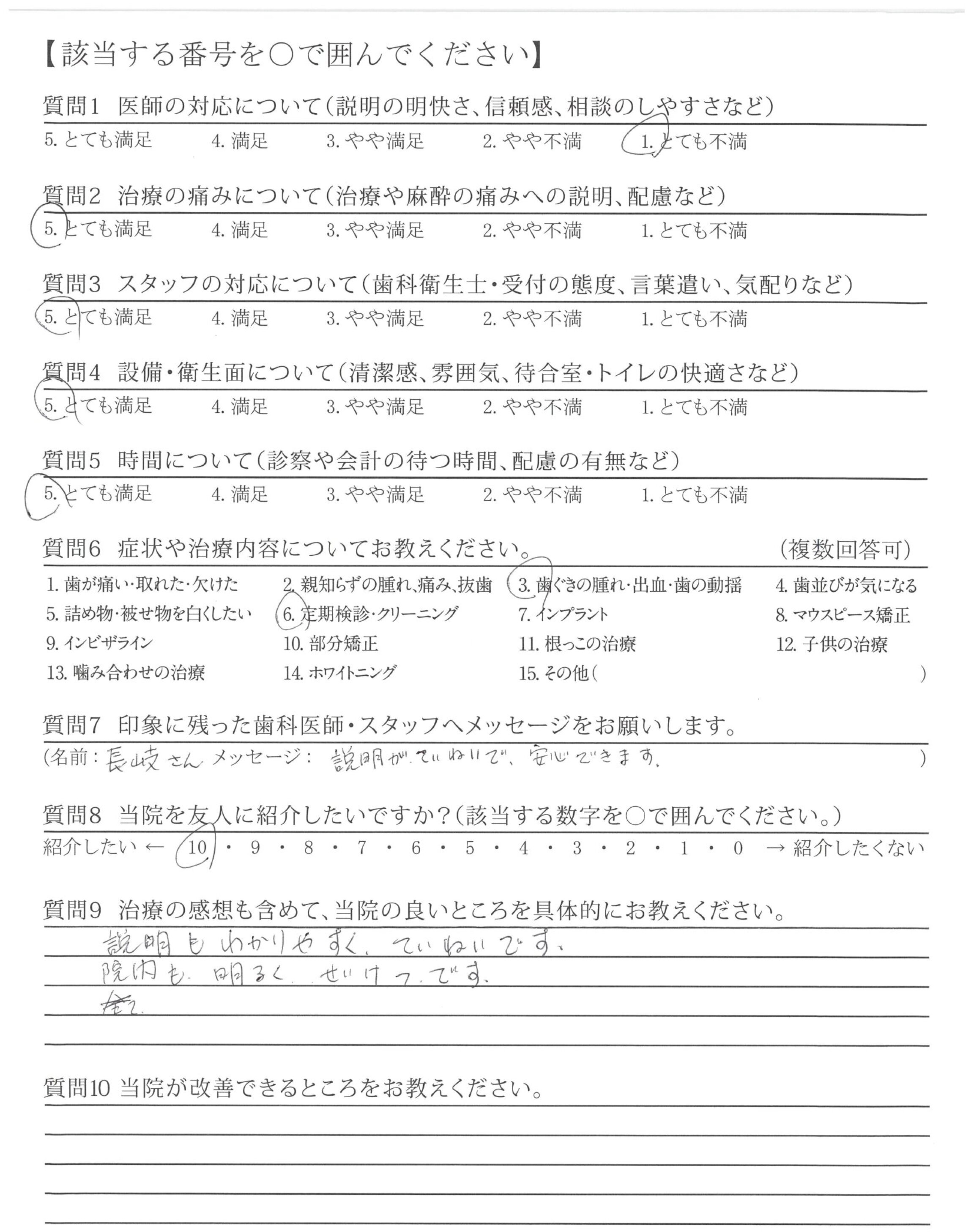 ・歯みがき指導が丁寧で、自分のみがき方の改善が出来、歯も歯ぐきも良くなった。
