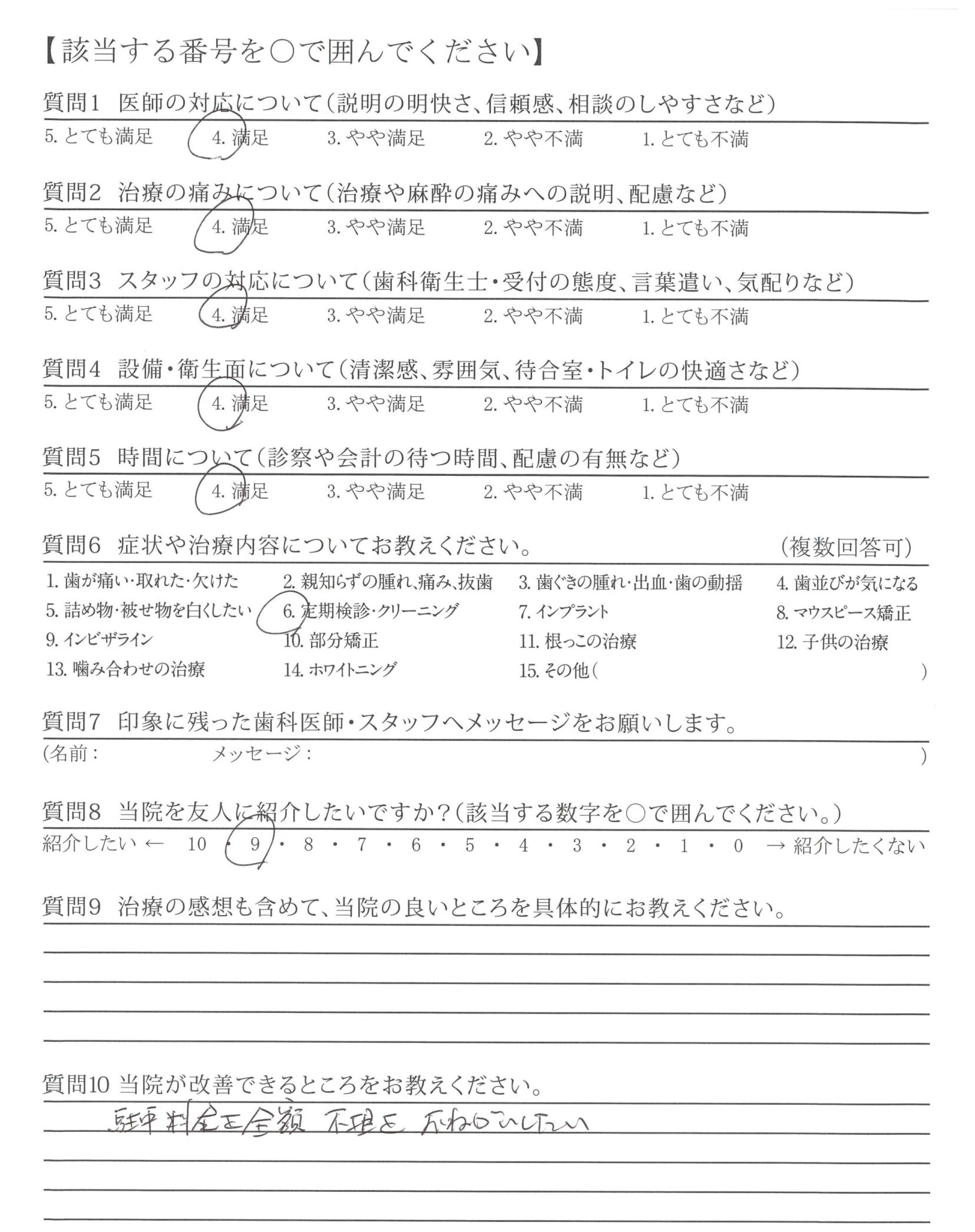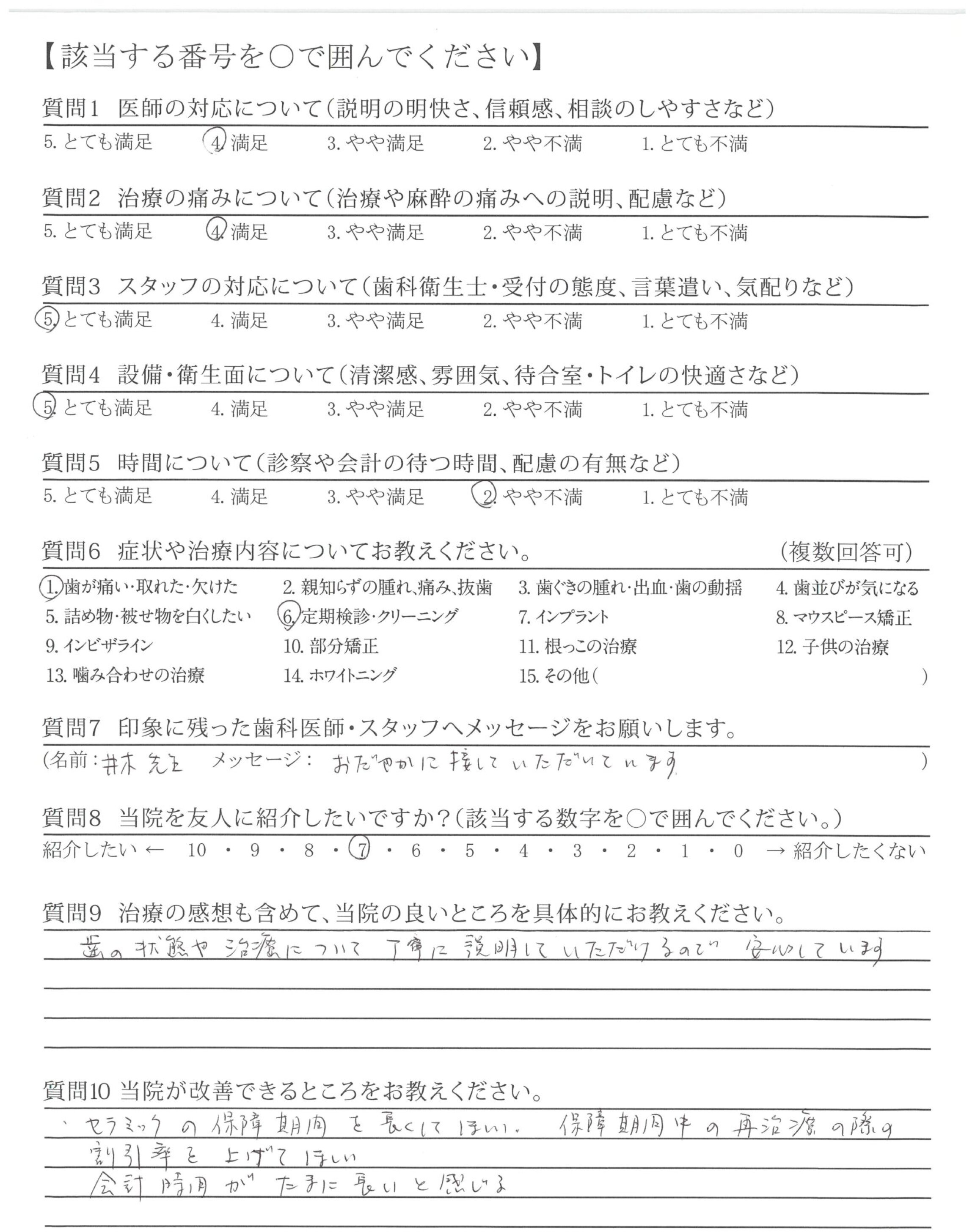 ・セラミックの保証期間を長くしてほしい。保証期間中の再治療の際の割引率を上げてほしい