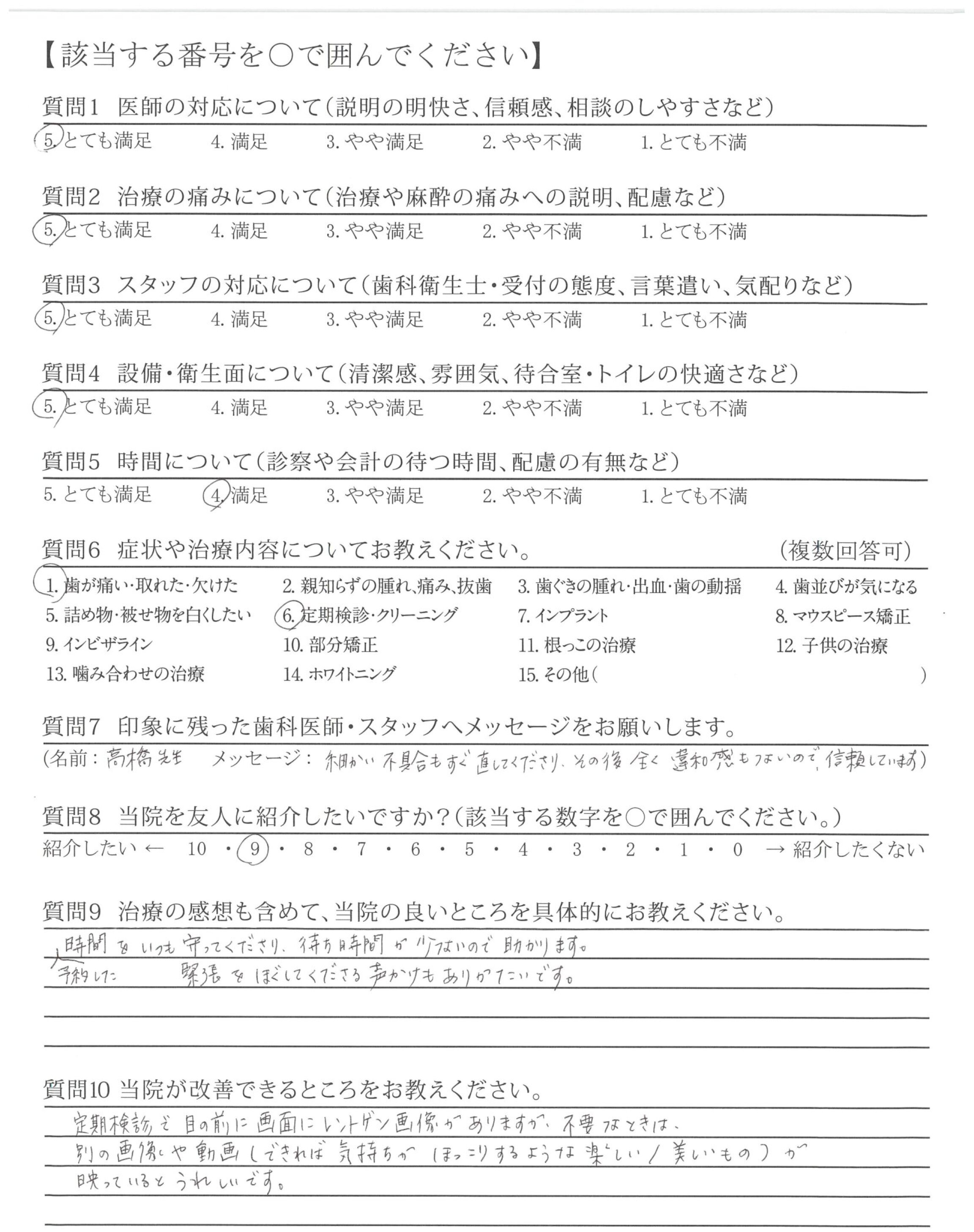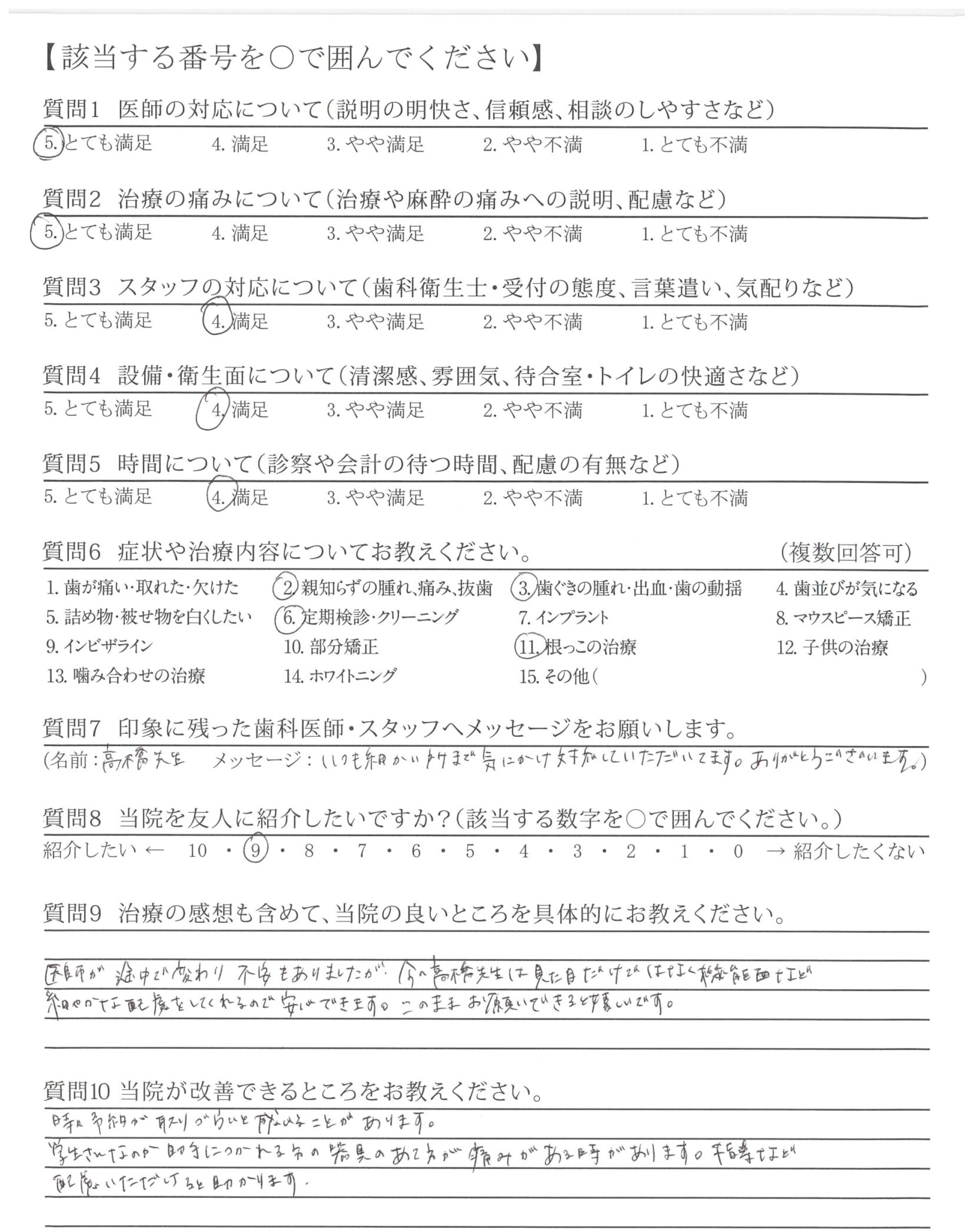 医師が途中で変わり不安もありましたが、今の高橋先生は見た目だけではなく機能面など細やかな配慮をしてくれるので安心できます。このままお願いできると嬉しいです。
