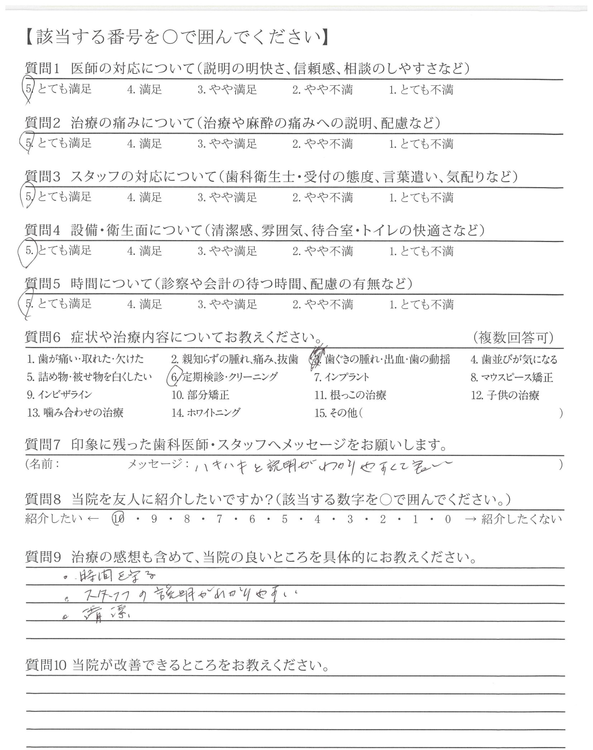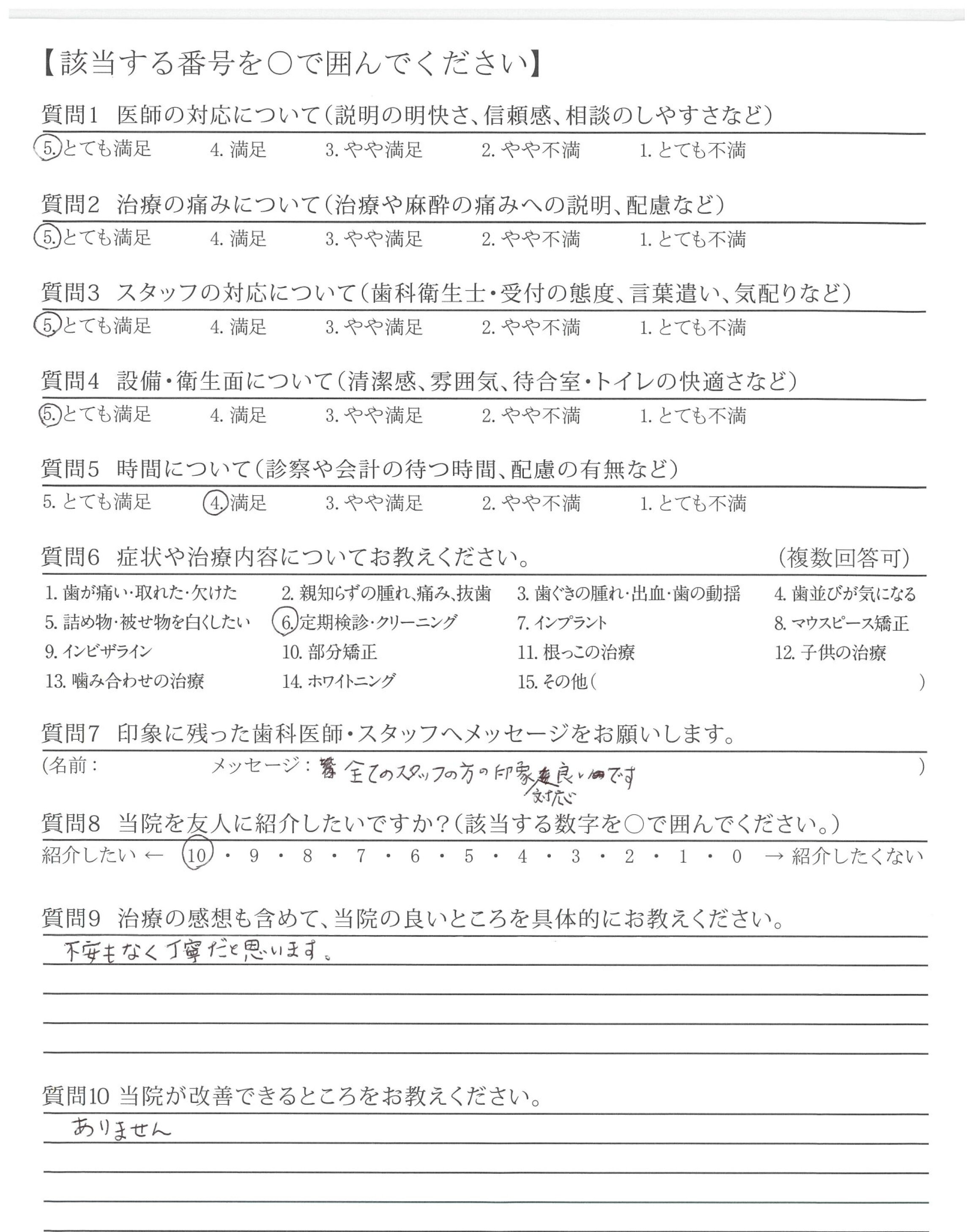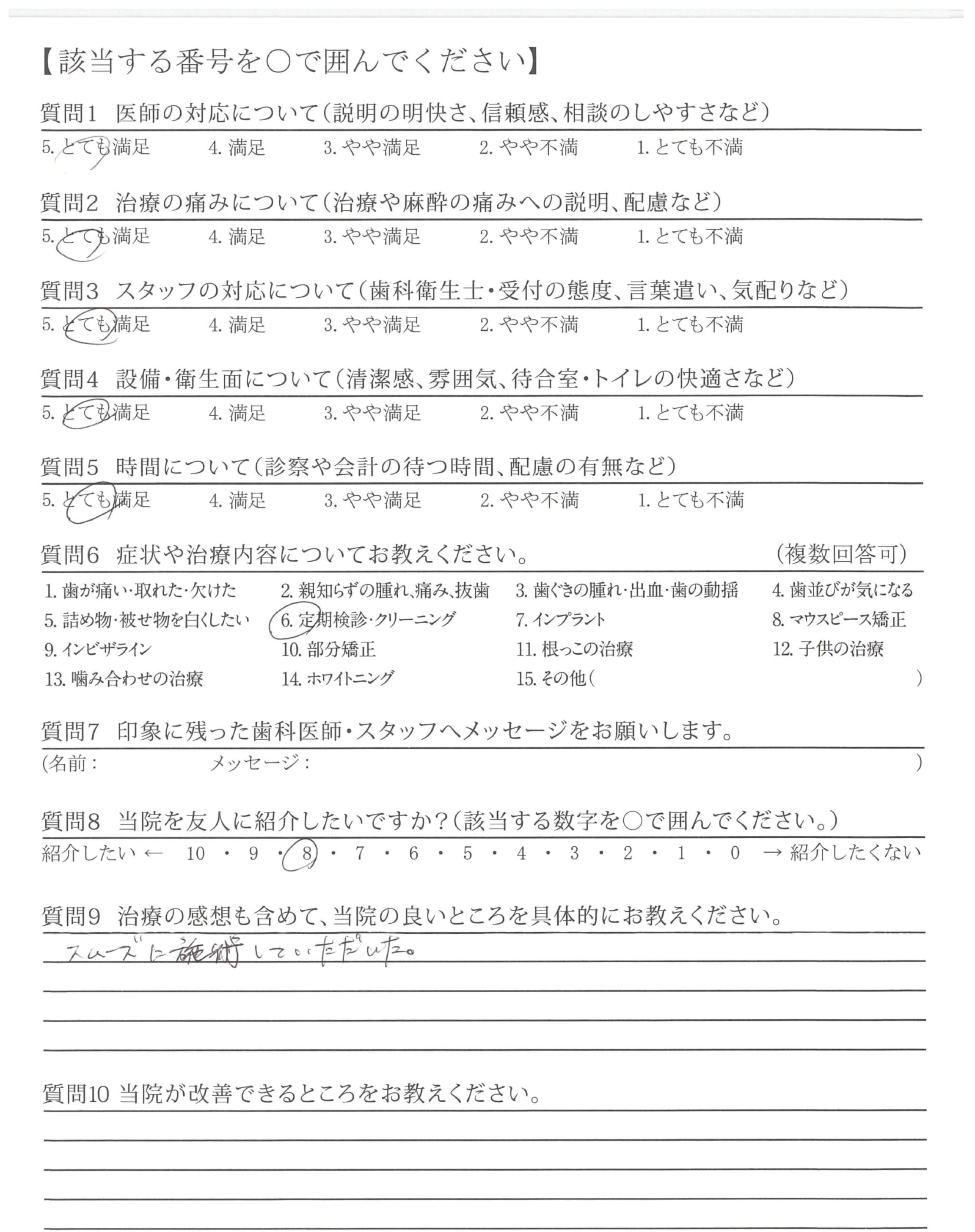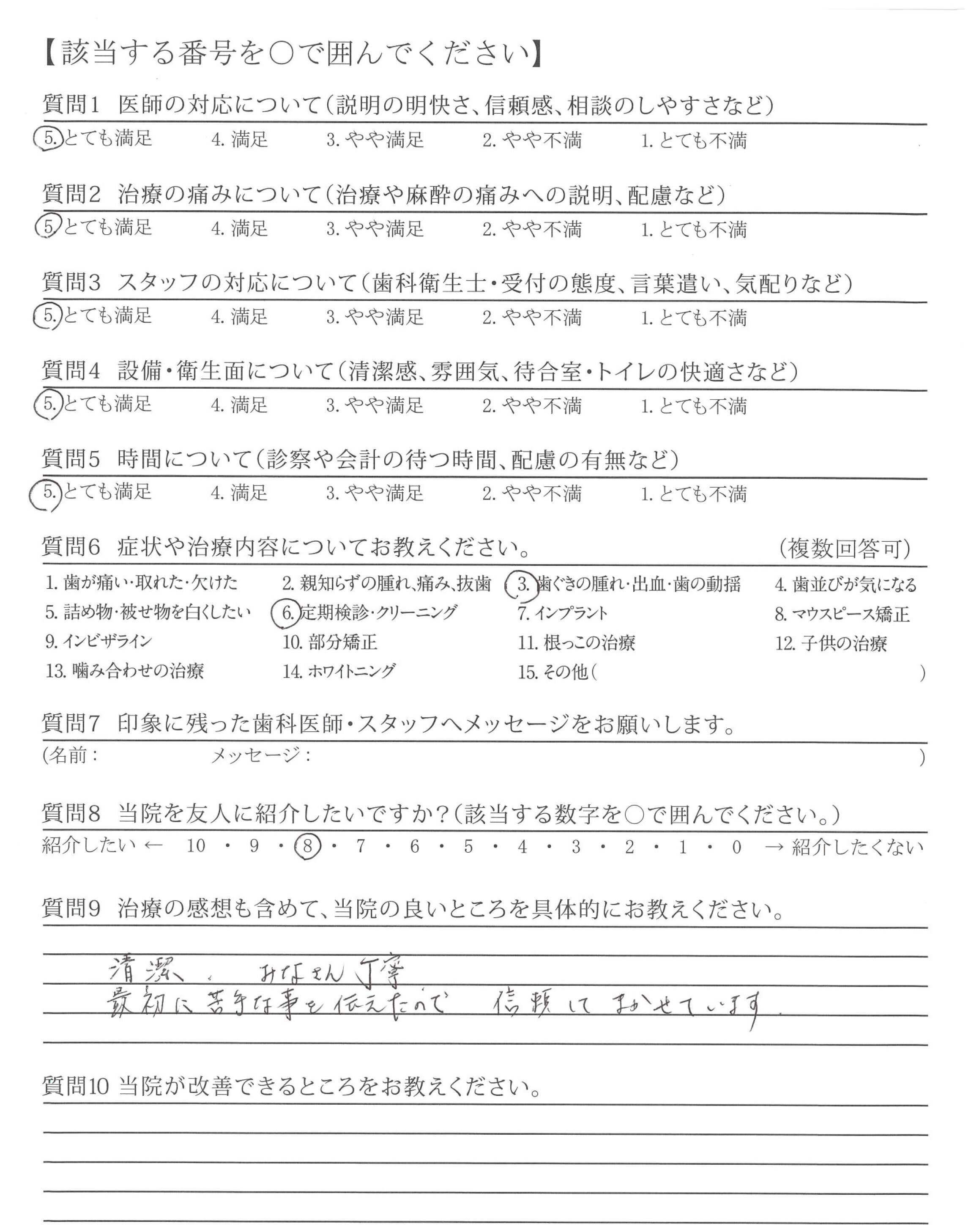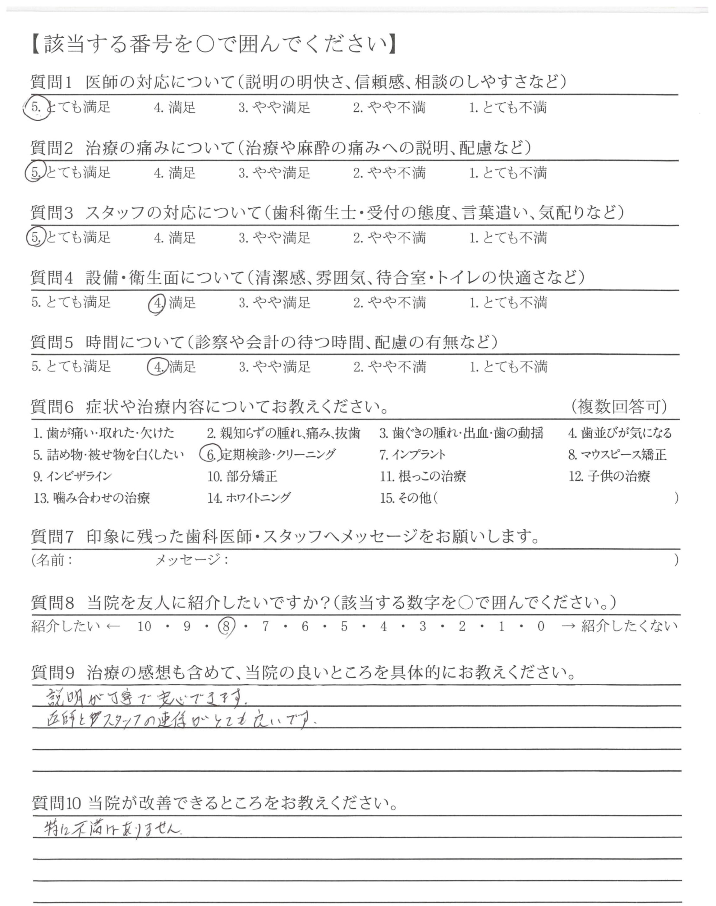 受付の方、衛生士の方、ドクターもスタッフの皆さまが全員穏やかで優しく、丁寧な対応と治療で信頼しております。これからもこの体制が続きます様、お願いします。