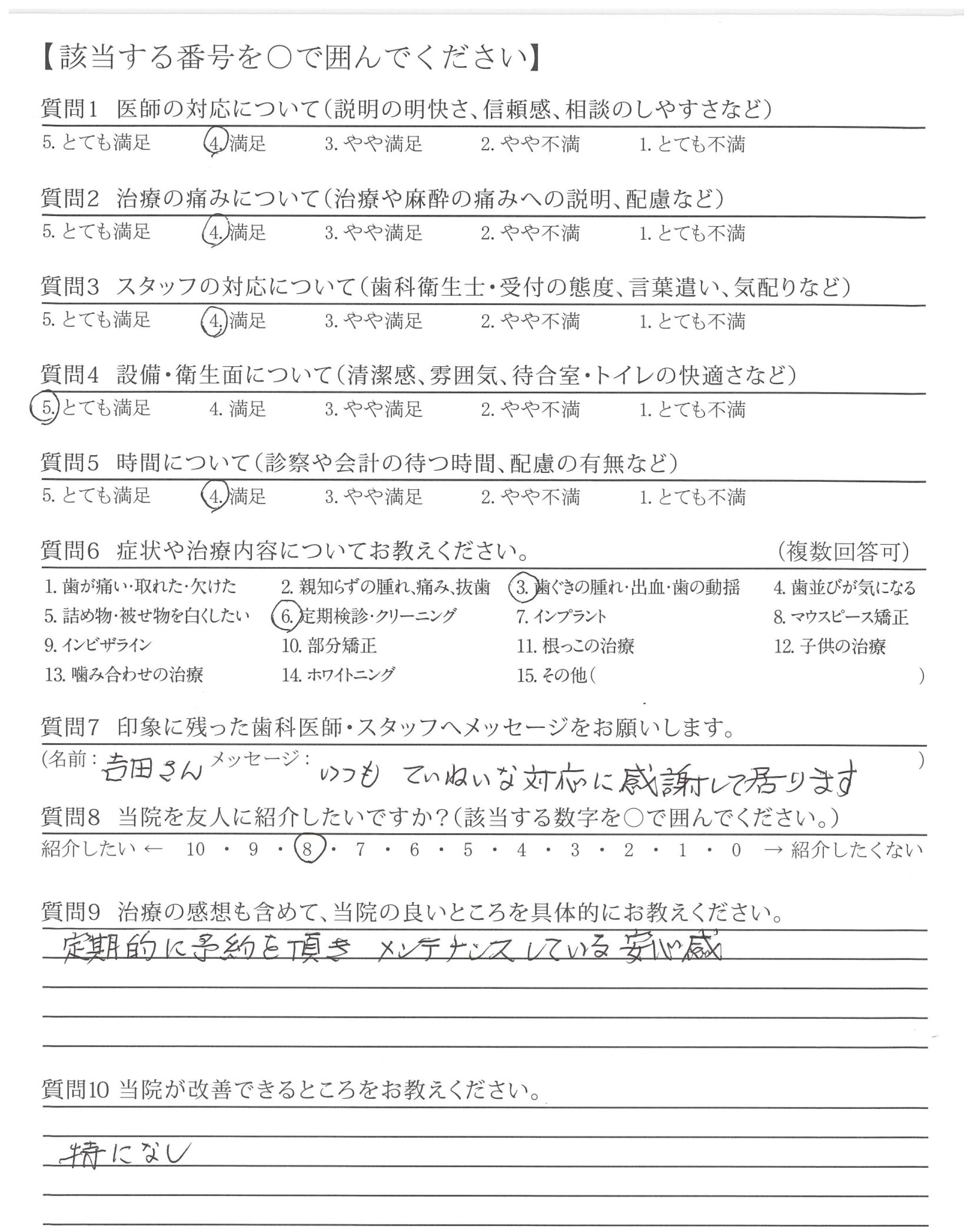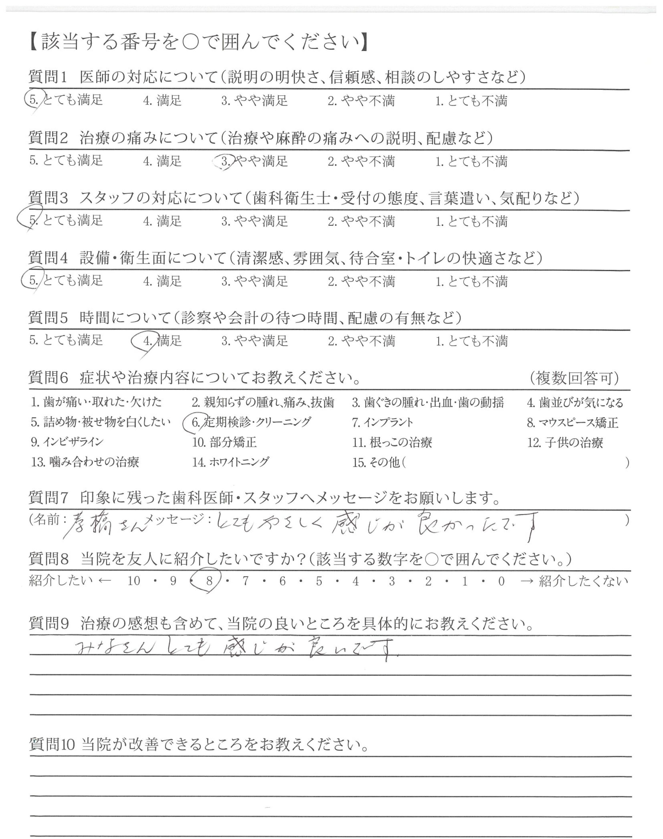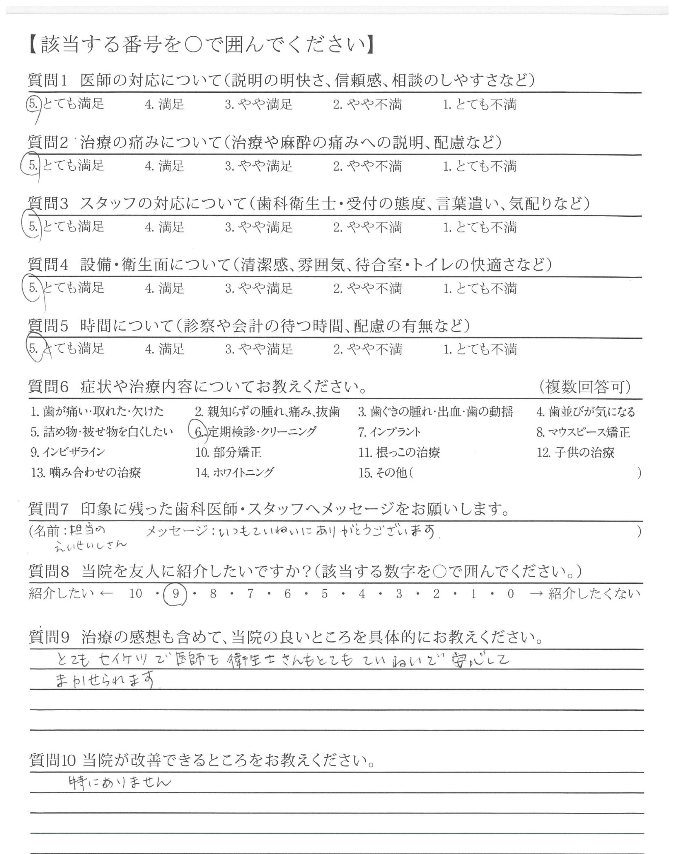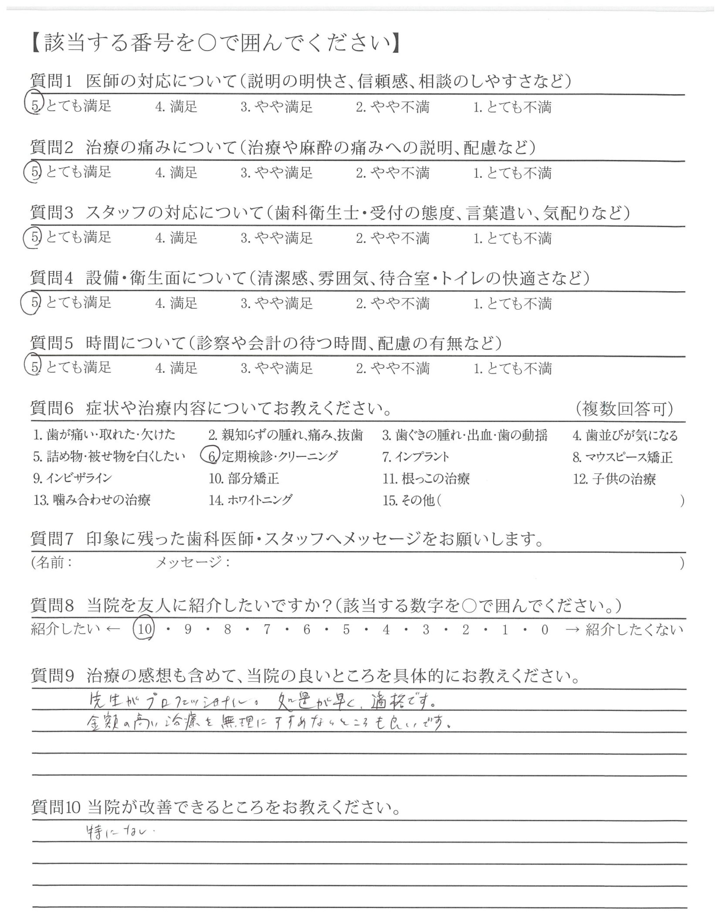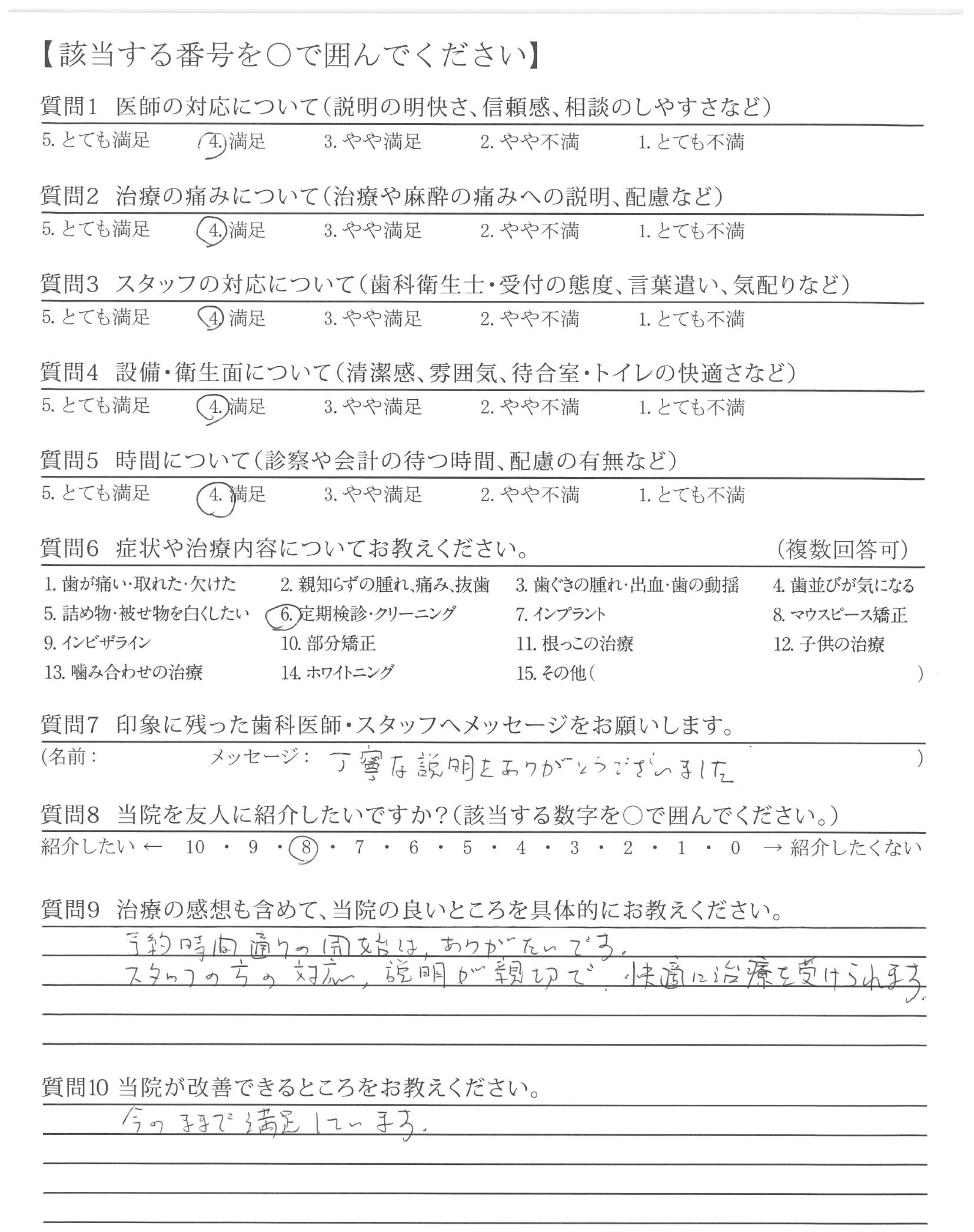 受付の方、衛生士の方、ドクターもスタッフの皆さまが全員穏やかで優しく、丁寧な対応と治療で信頼しております。これからもこの体制が続きます様、お願いします。