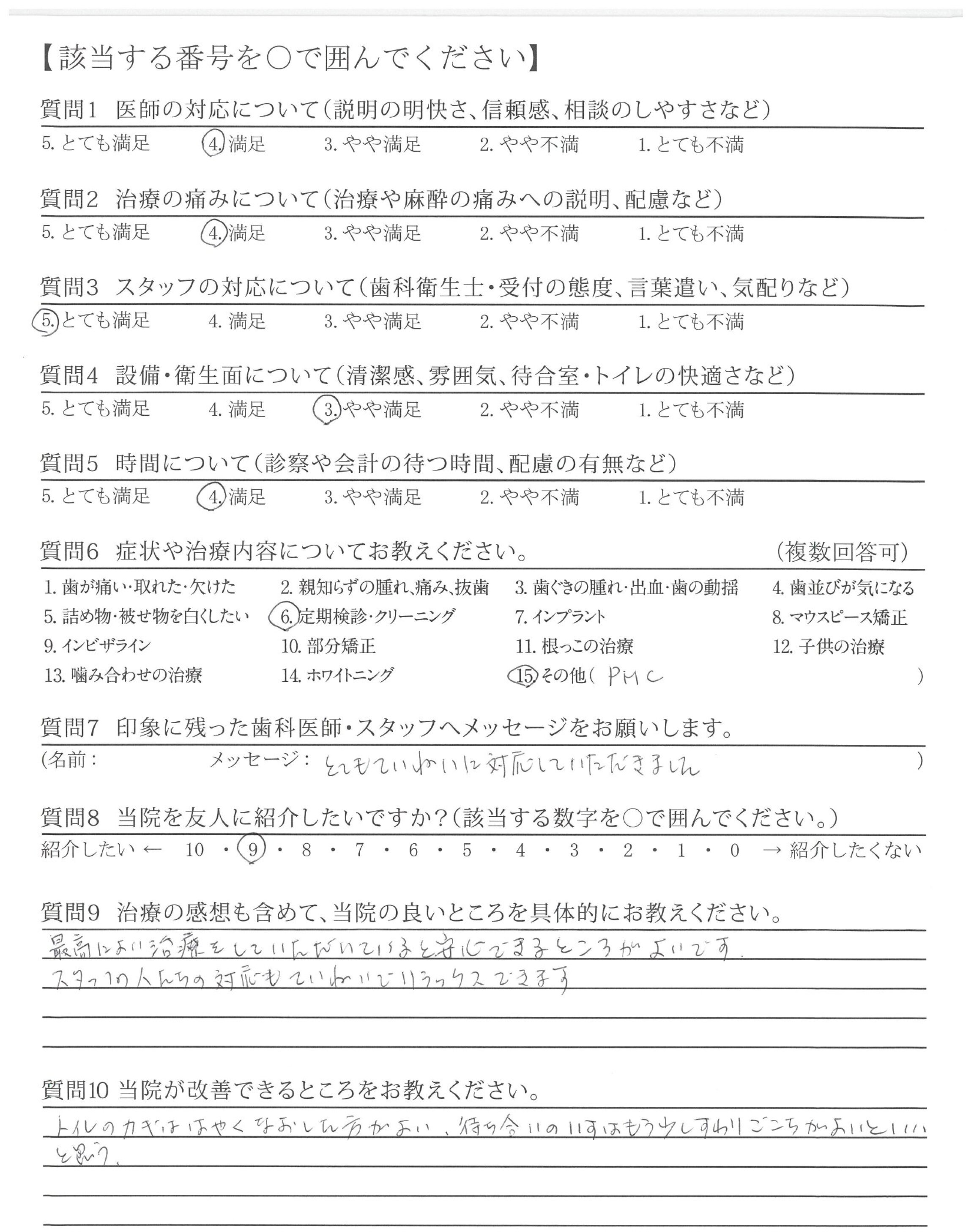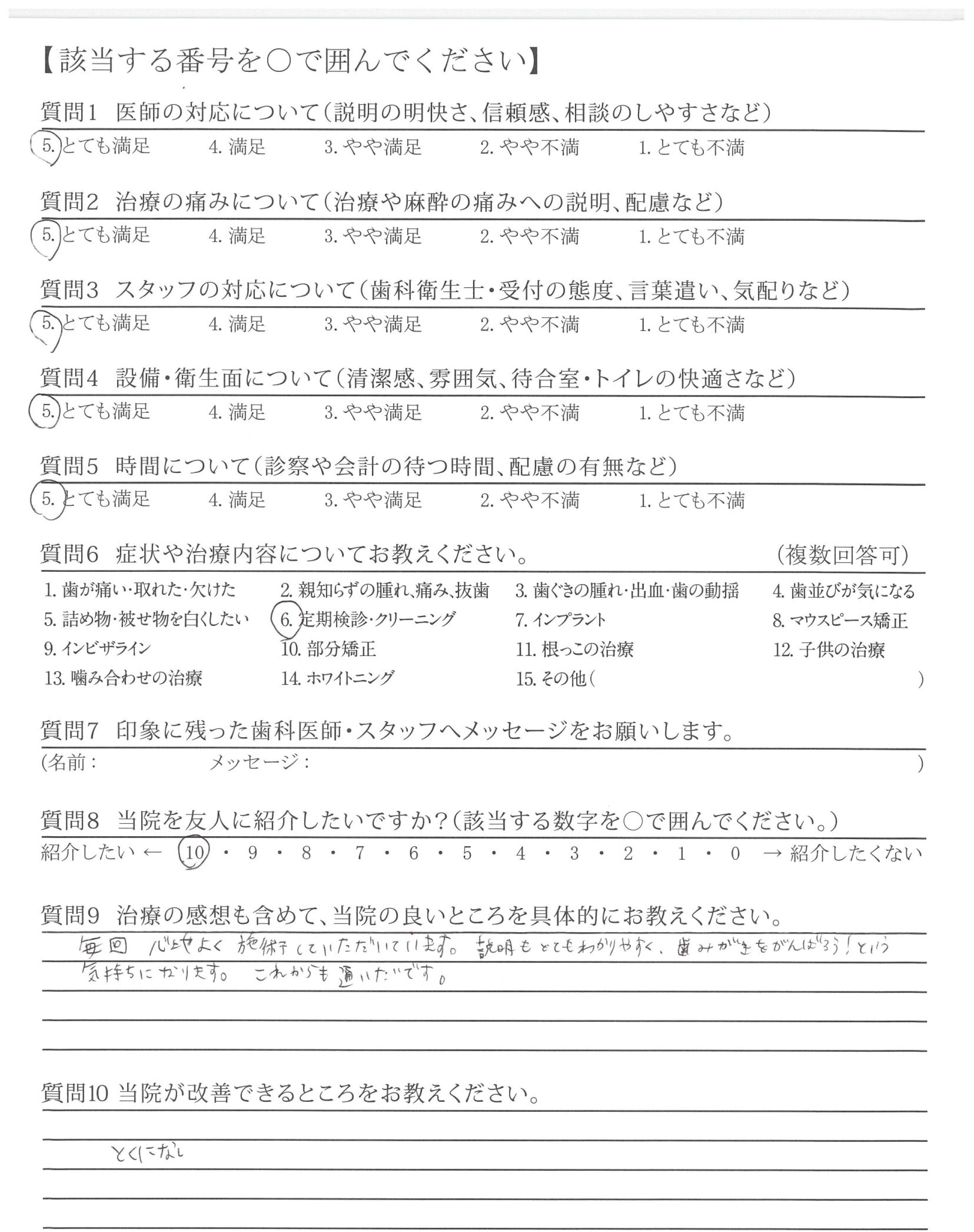 みがき残しチェックについて、夕方の予約だと職場でみがいた後となり、自分がどれだけしっかりみがけているのか分からないので、施術の前に歯みがき時間などあったらうれしい。(歯医者に来ている意味ないですが・・・)