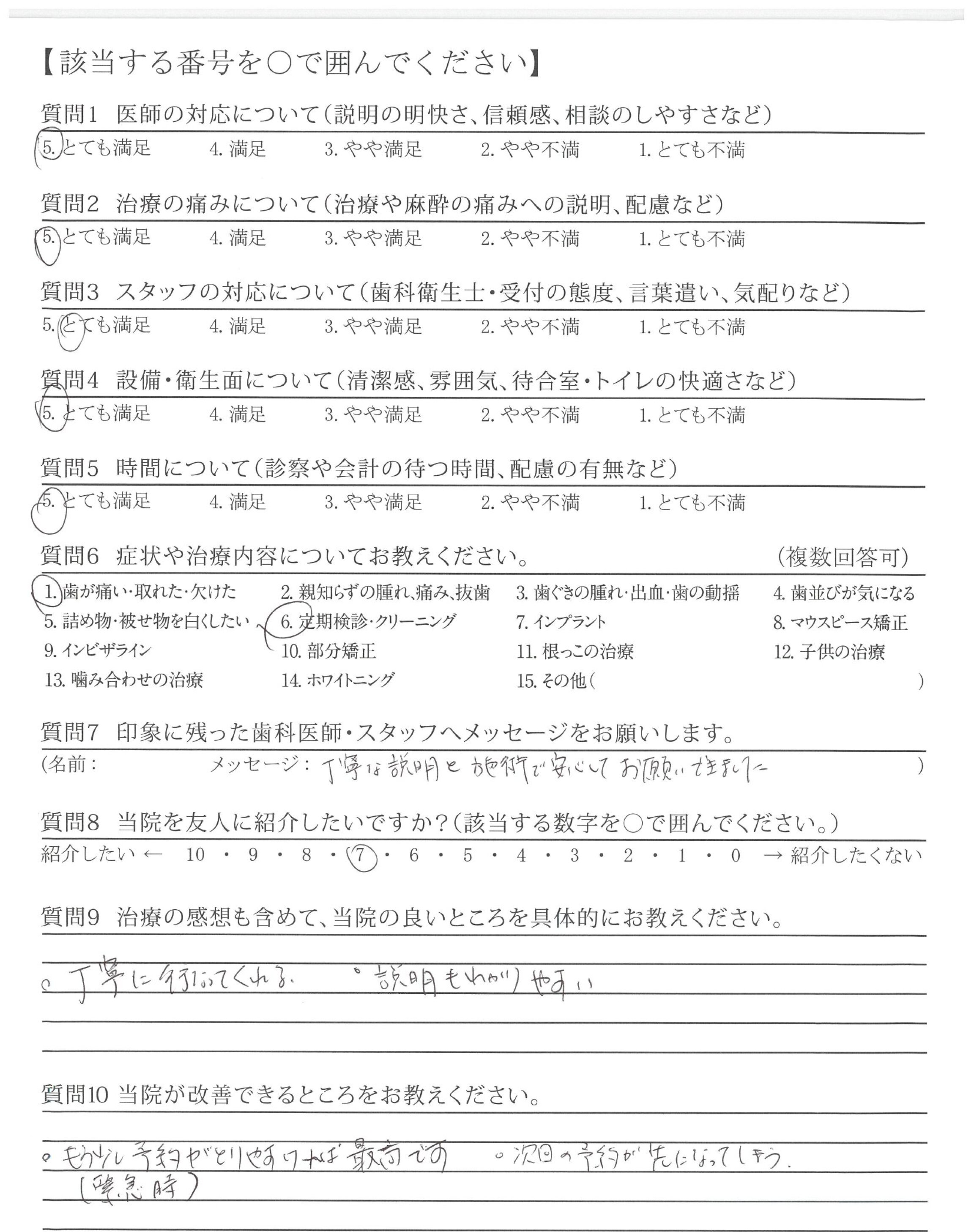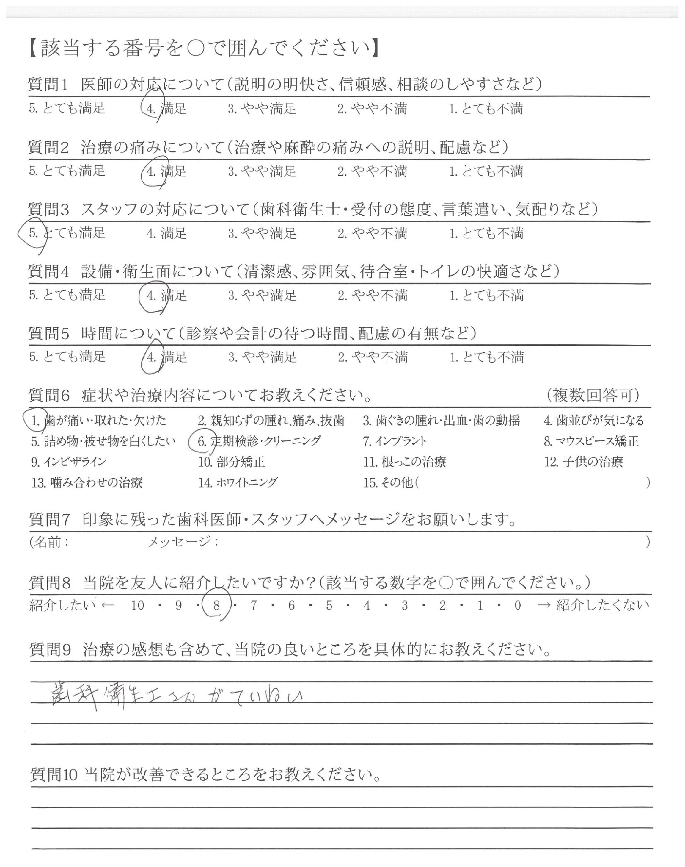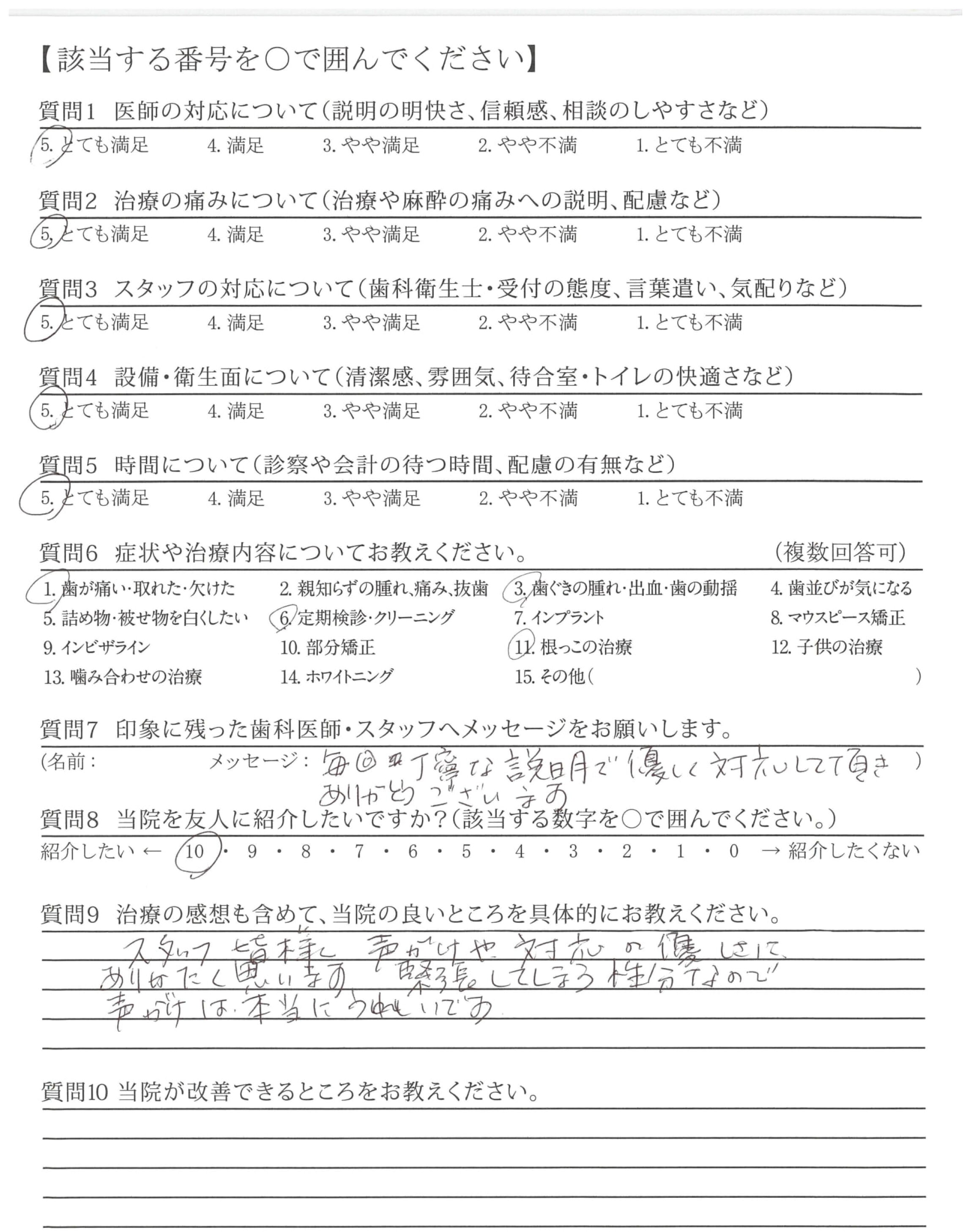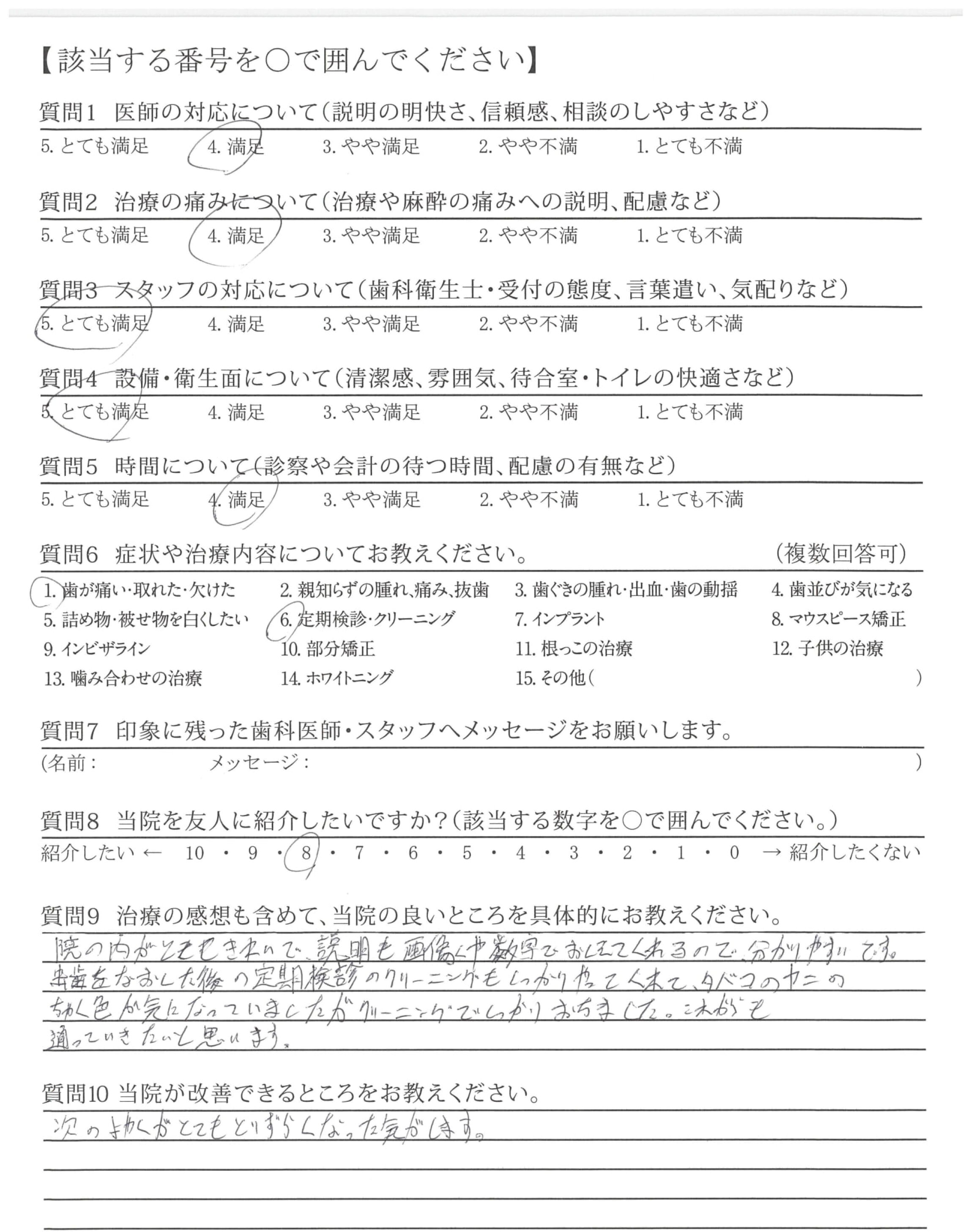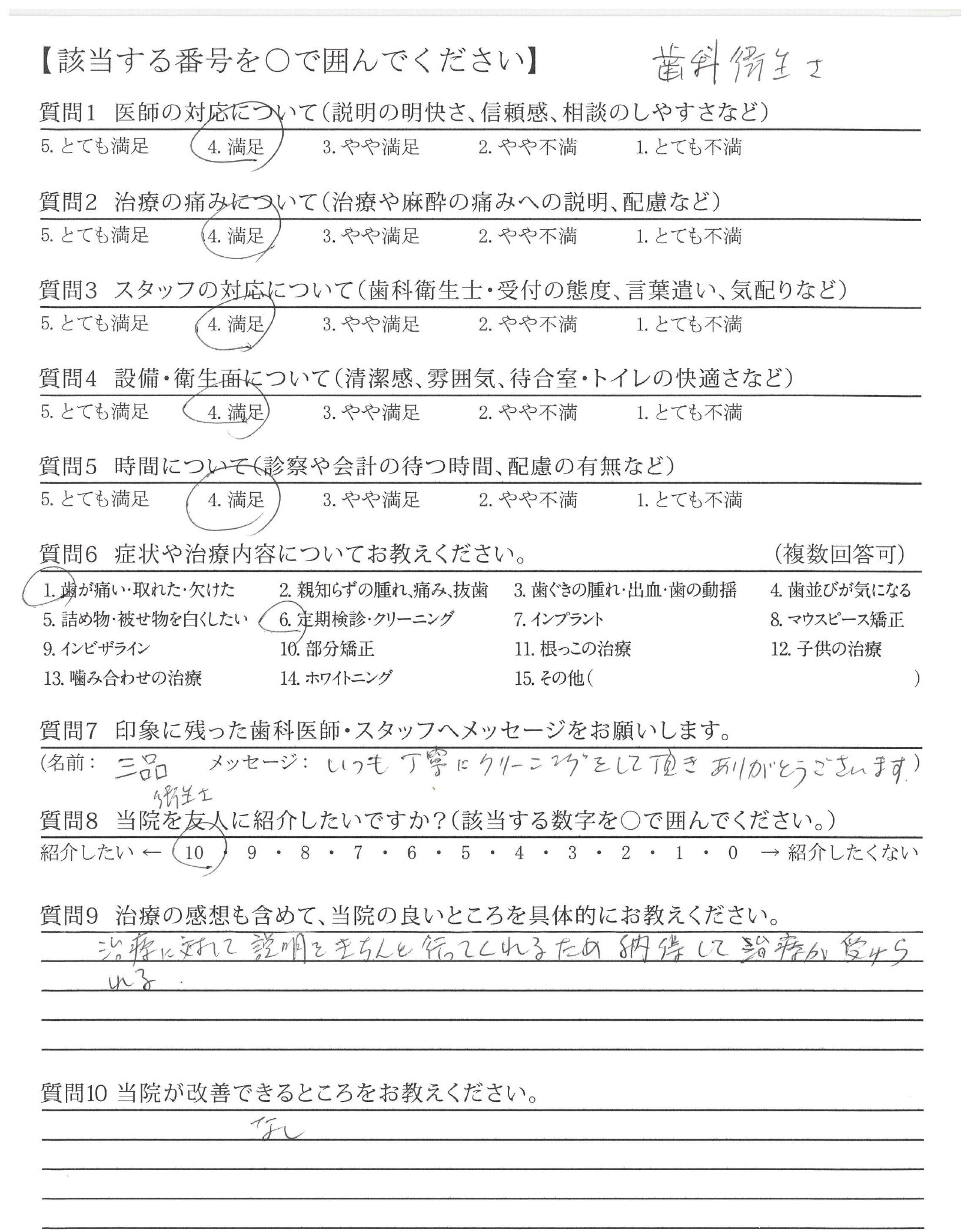 ・歯みがき指導が丁寧で、自分のみがき方の改善が出来、歯も歯ぐきも良くなった。