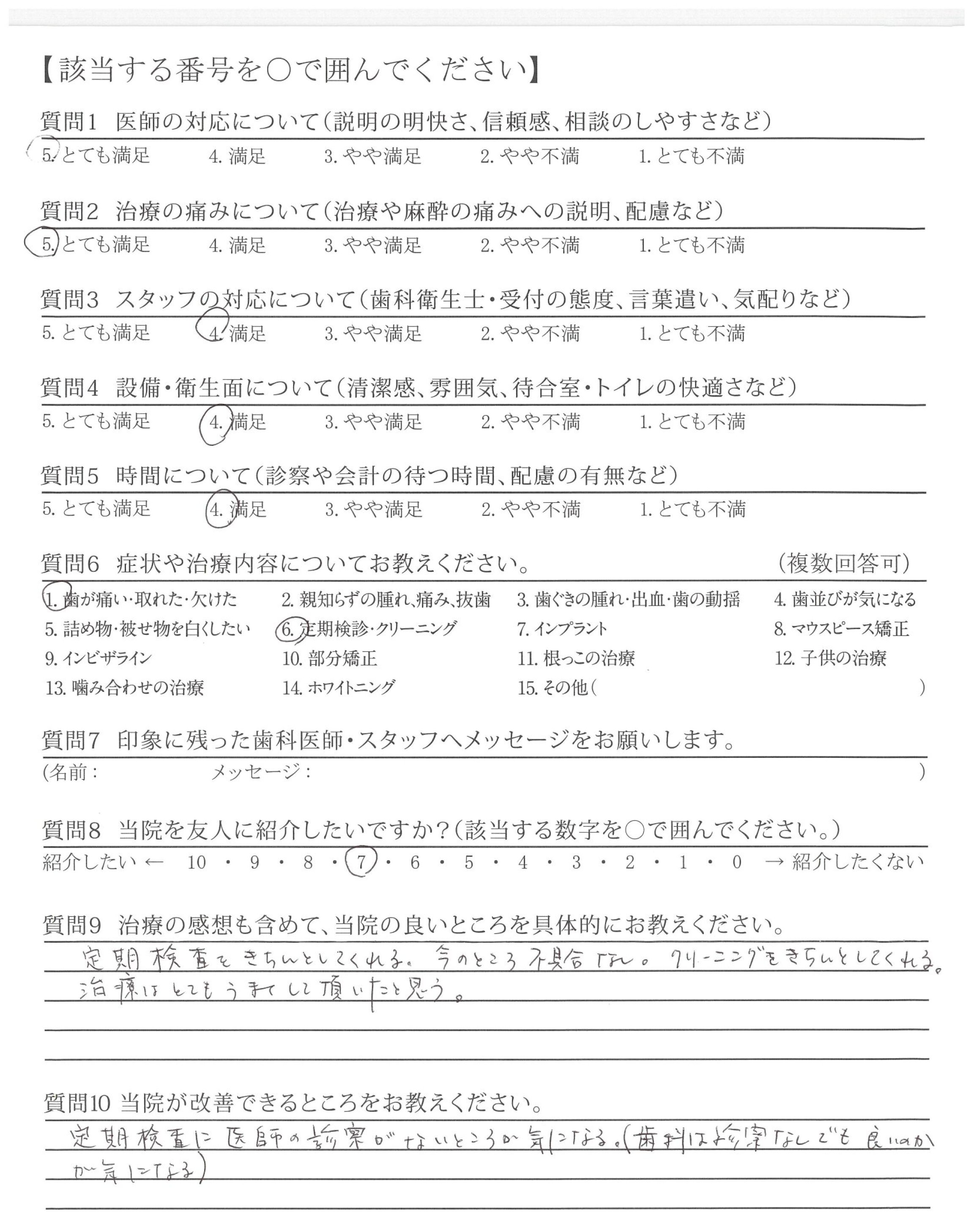 定期検査に医師の診察がないところが気になる。(歯科は診察なしでも良いのかが気になる)