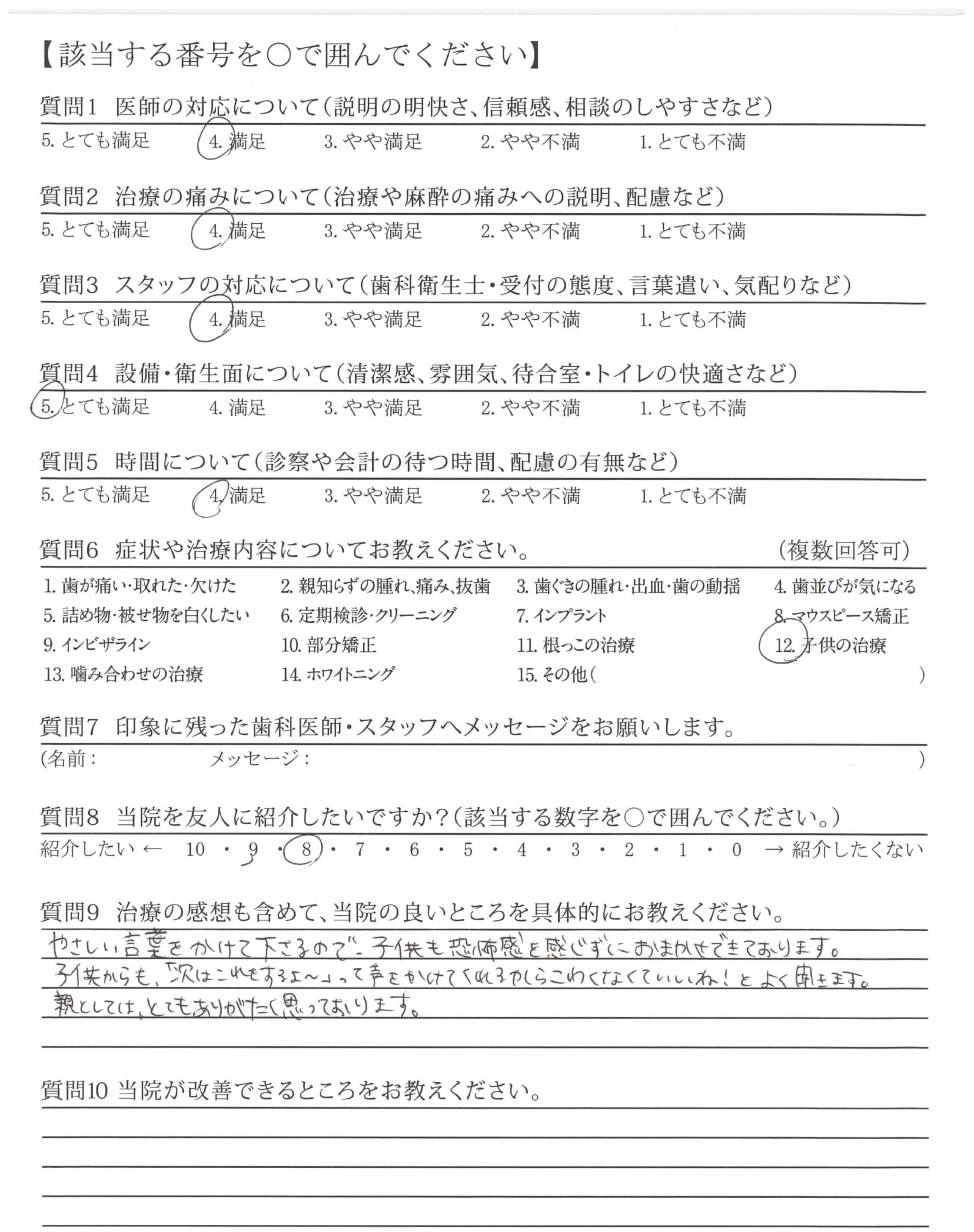 やさしい言葉をかけて下さるので、子供も恐怖感を感じずにおまかせできております。