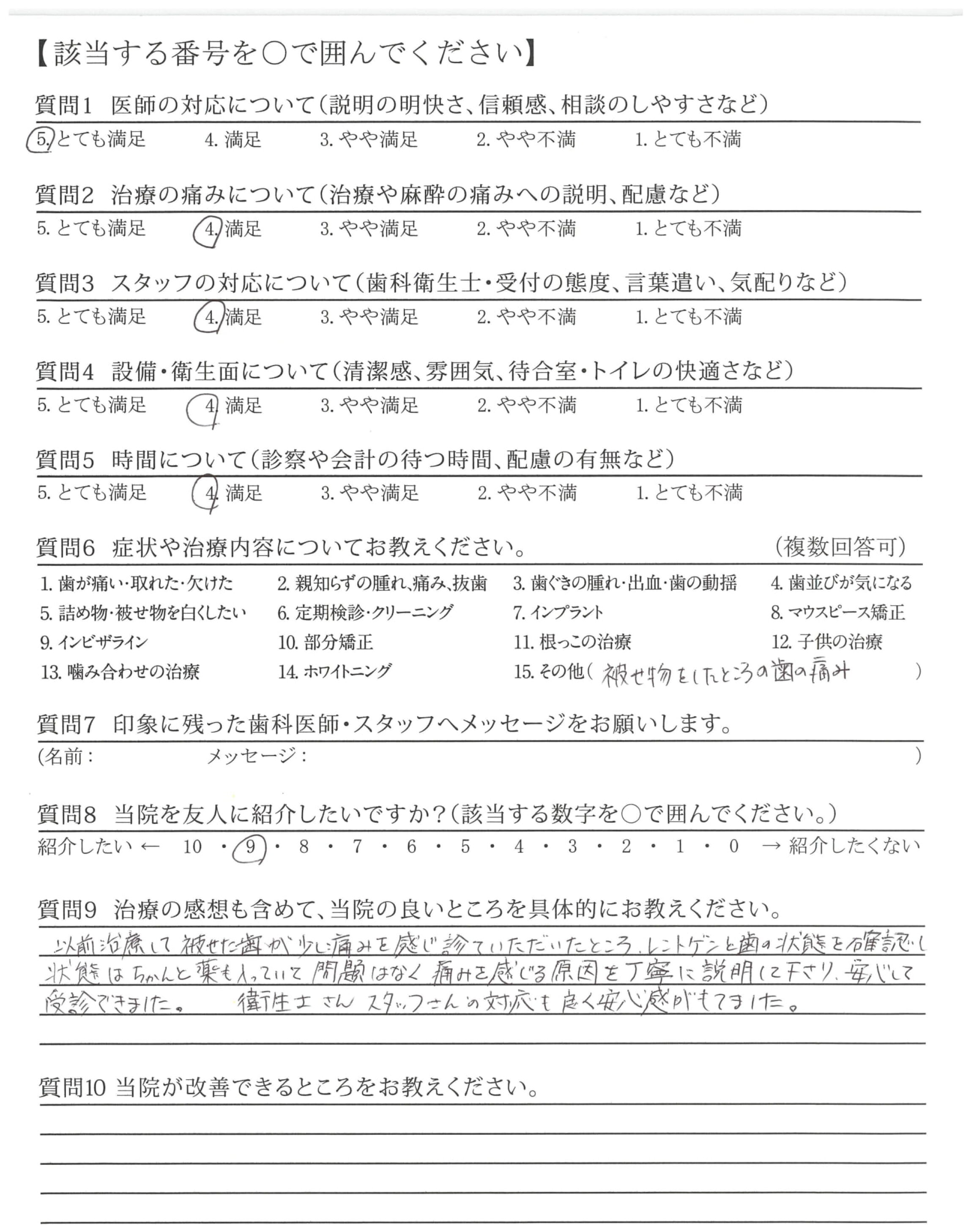 以前治療して被せた歯が少し痛みを感じ診ていただいたところ、レントゲンと歯の状態を確認し状態はちゃんと薬も入っていて問題はなく痛みを感じる原因を丁寧に説明して下さり、安心して受診できました。