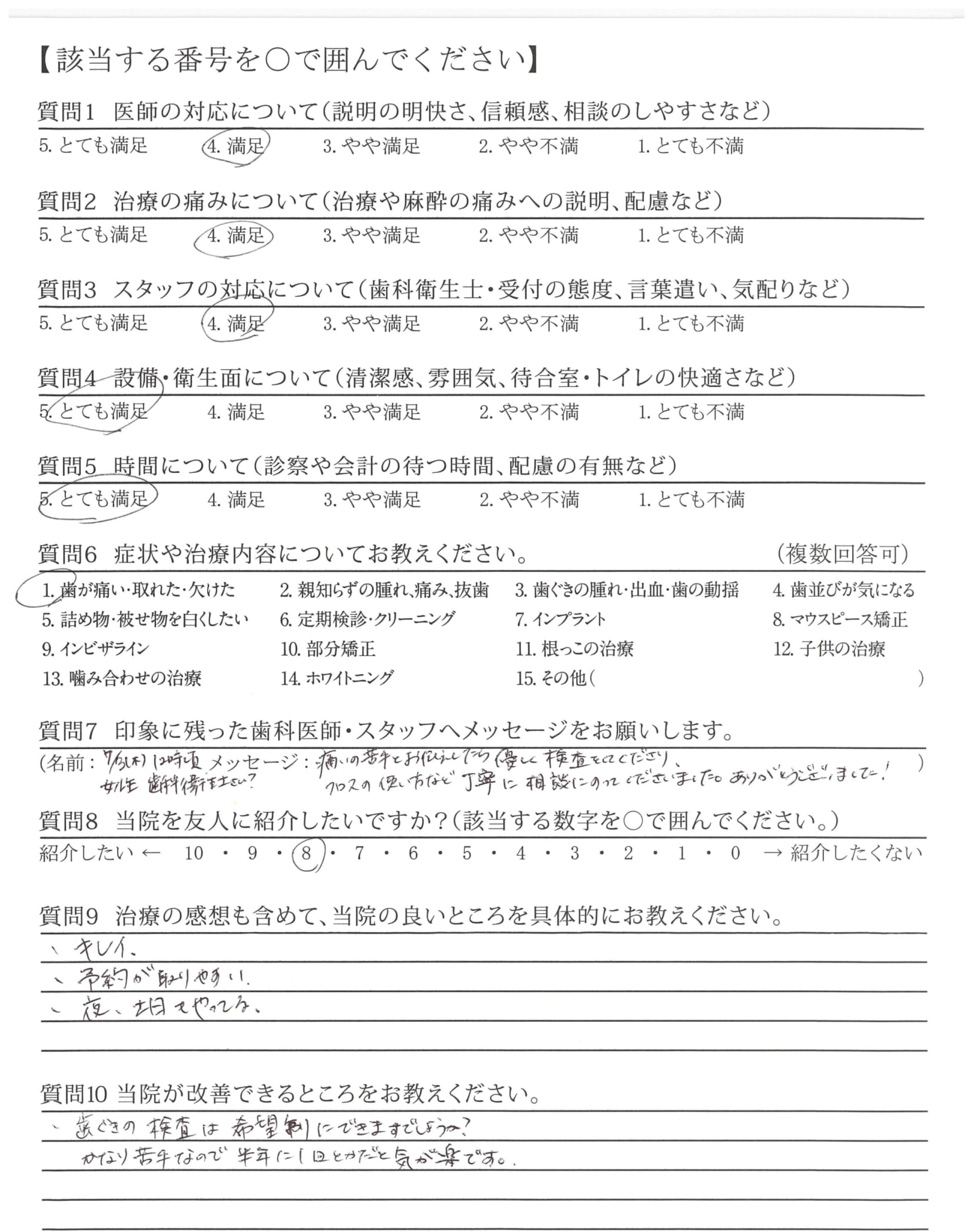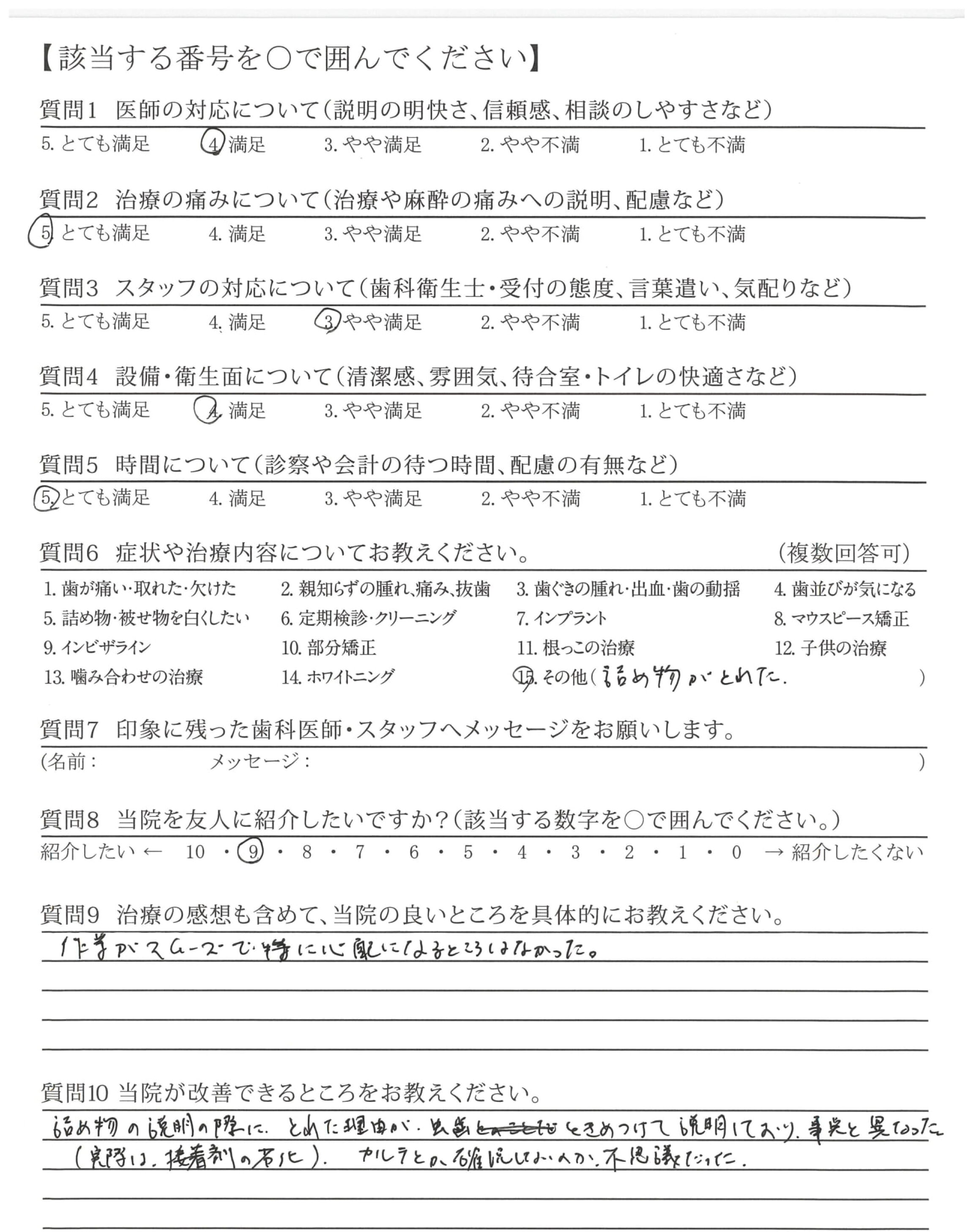 詰め物の説明の際に、とれた理由が、虫歯ときめつけて説明しており、事実と異なった。(実際は接着剤の劣化)カルテとか確認しないのか、不思議だった。