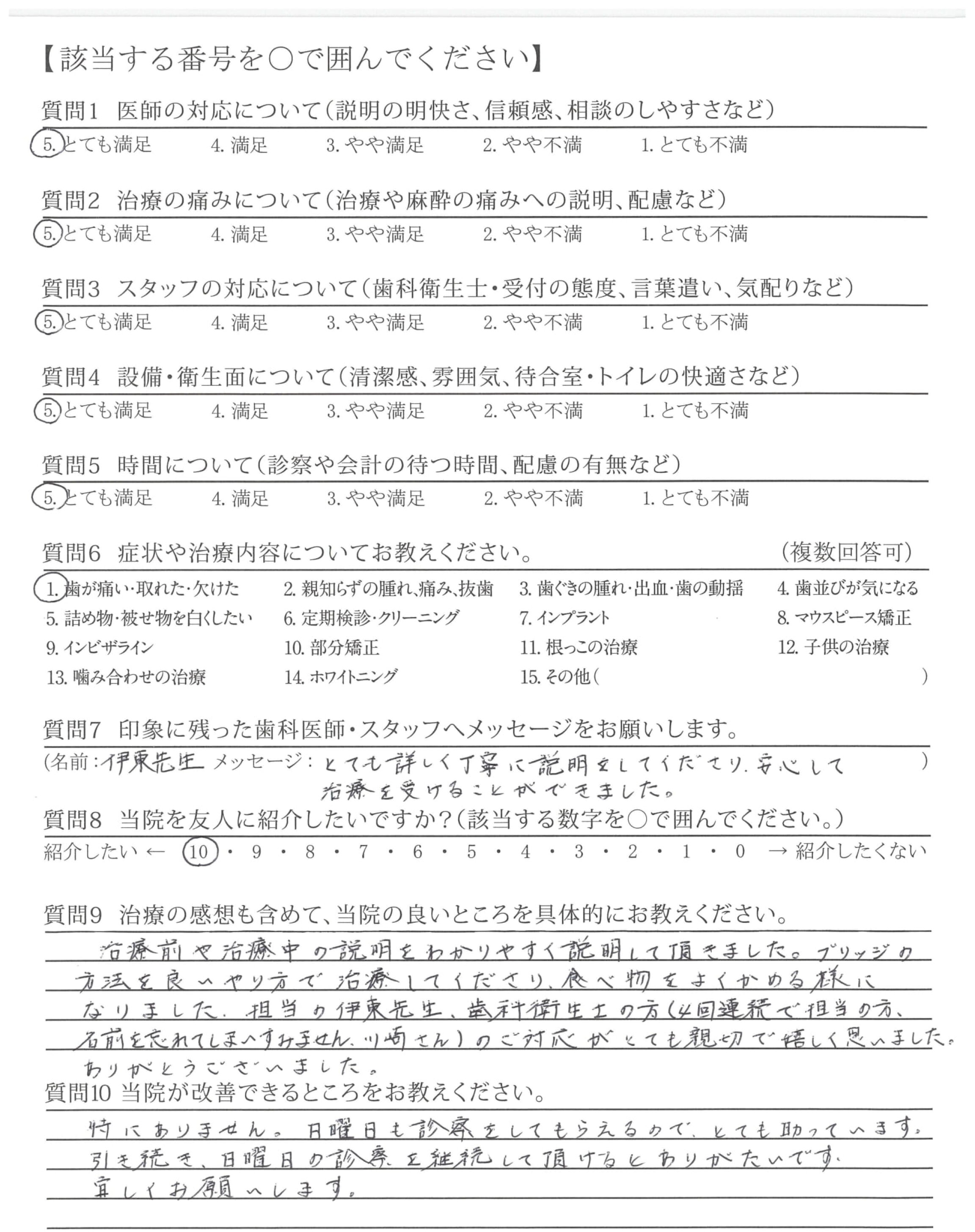 ブリッジの方法を良いやり方で治療してくださり、食べ物をよくかめる様になりました。