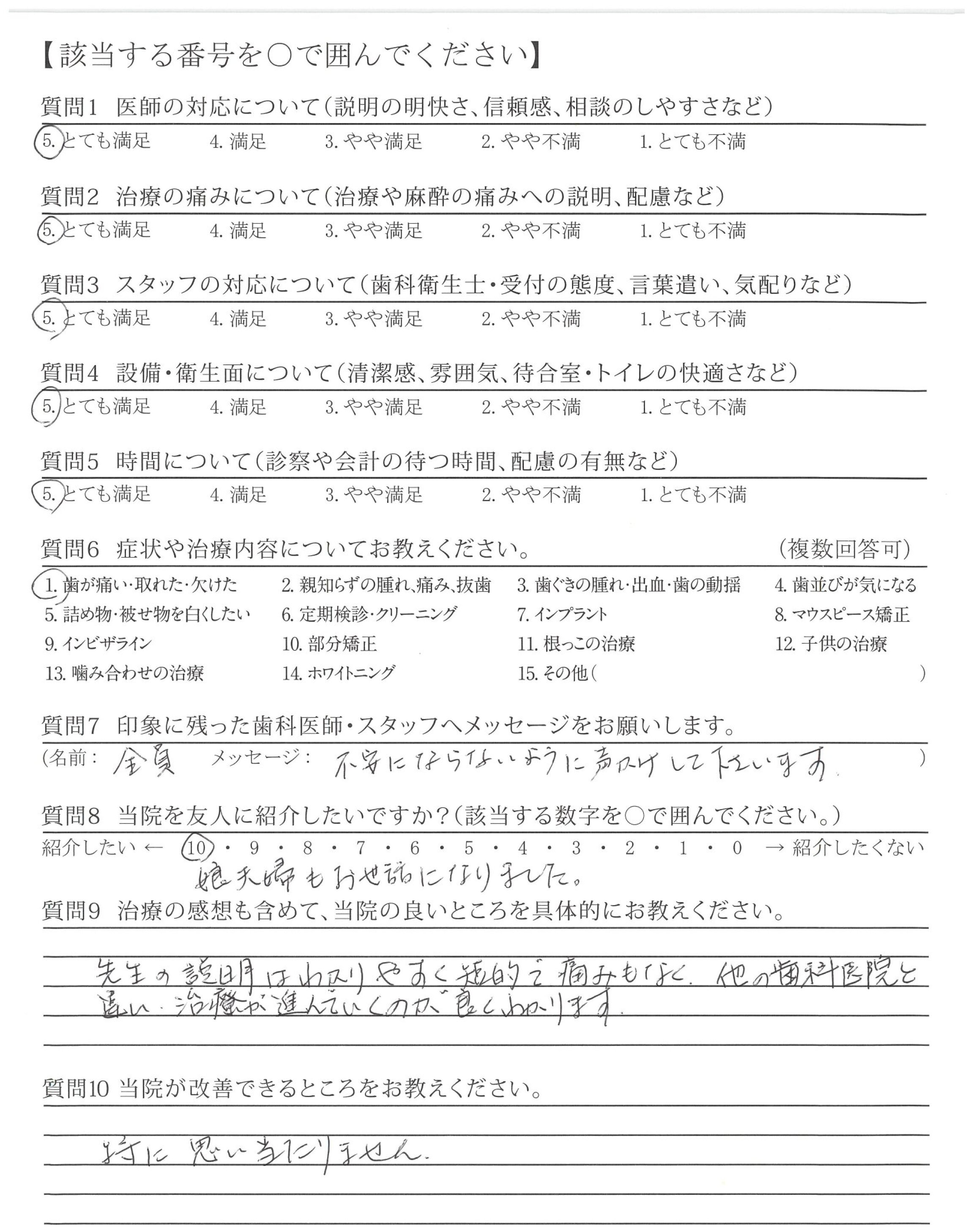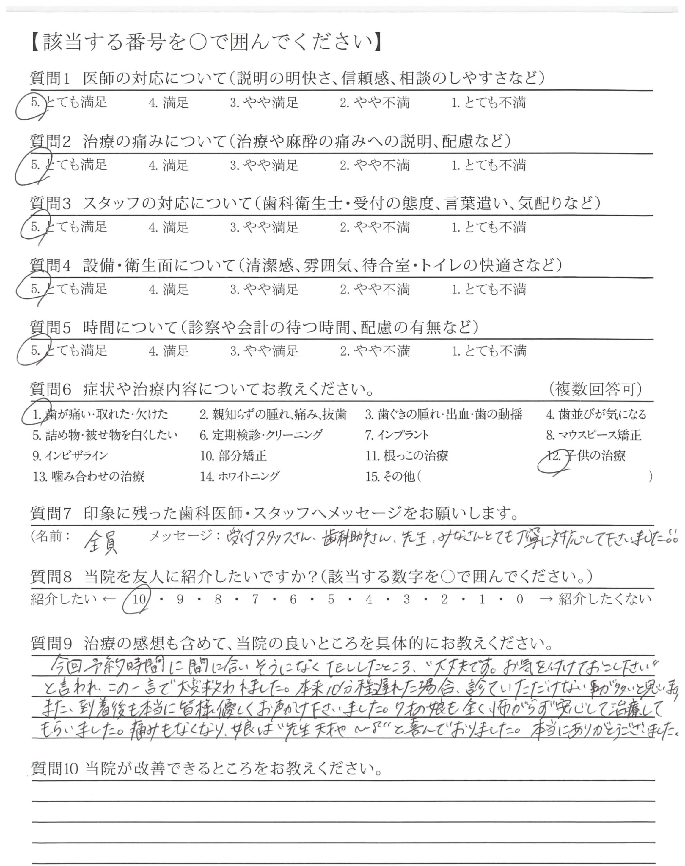7才の娘も全く怖がらず安心して治療してもらいました。痛みもなくなり、娘は"先生天才や~"と喜んでおりました。本当にありがとうございました。
