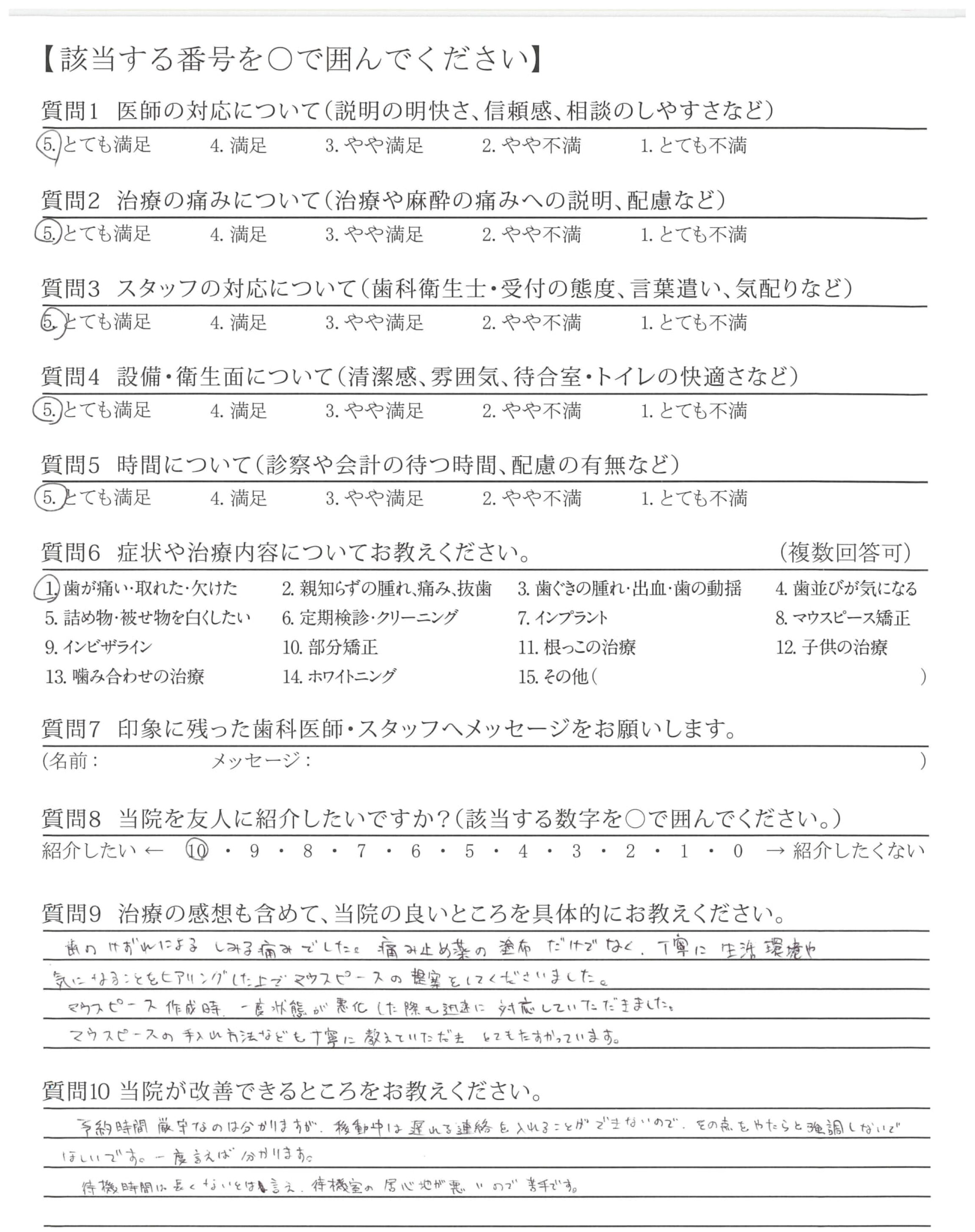 歯のけずれによるしみる痛みでした。痛み止め薬の塗布だけでなく、丁寧に生活環境や気になることをヒアリングした上でマウスピースの提案をしてくだりました。マウスピース作成時、一度状態が悪化した際も迅速に対応していただきました。