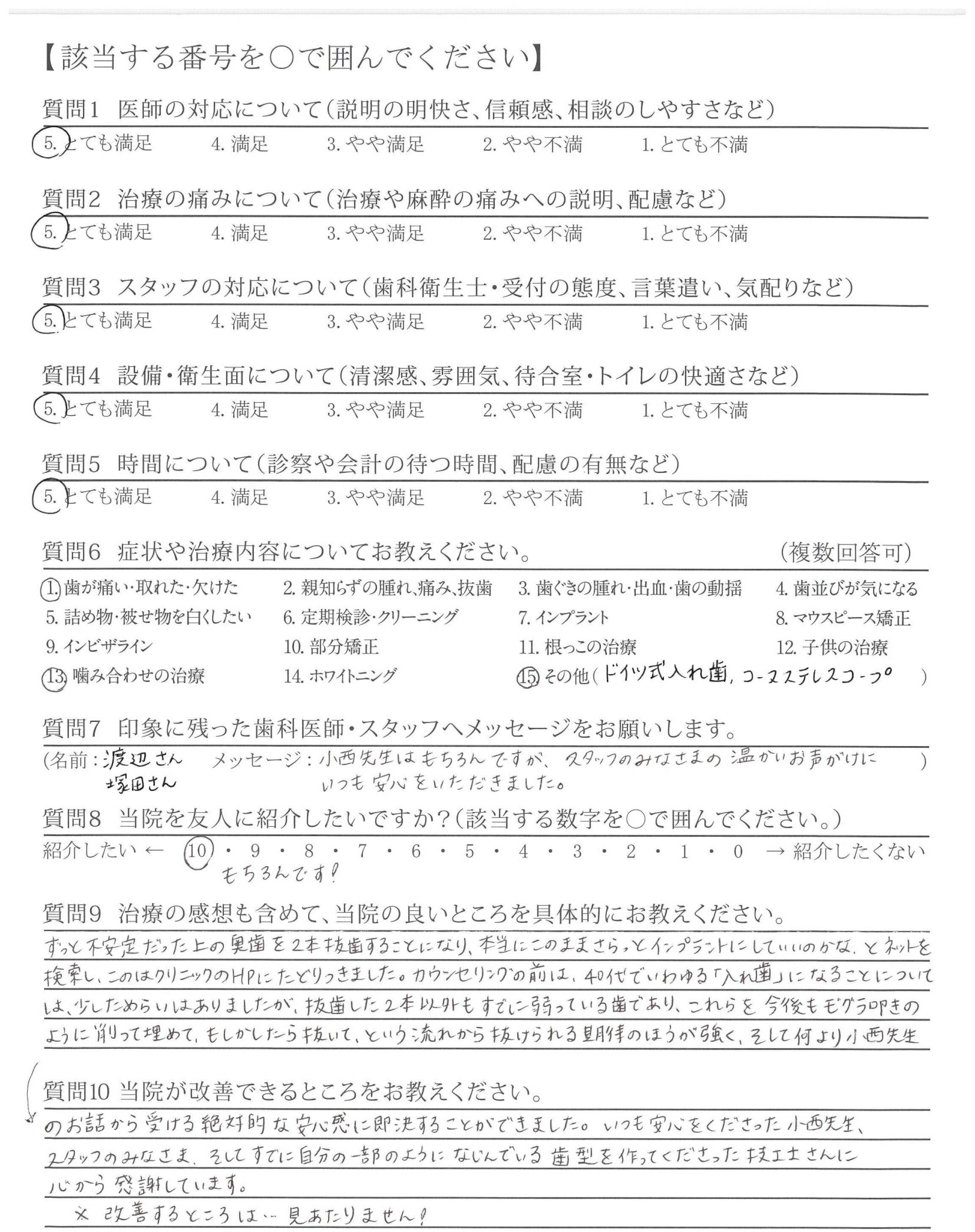 先生の技術力の高さ、誠実なお人柄と歯科衛生士の皆さんの心配り等、素晴らしいでインプラントとドイツ式義歯は何のトラブルもなく、1年半前には想像できないくら快適で、長年の悩みや心配がなくなりました。本当に感謝しております。