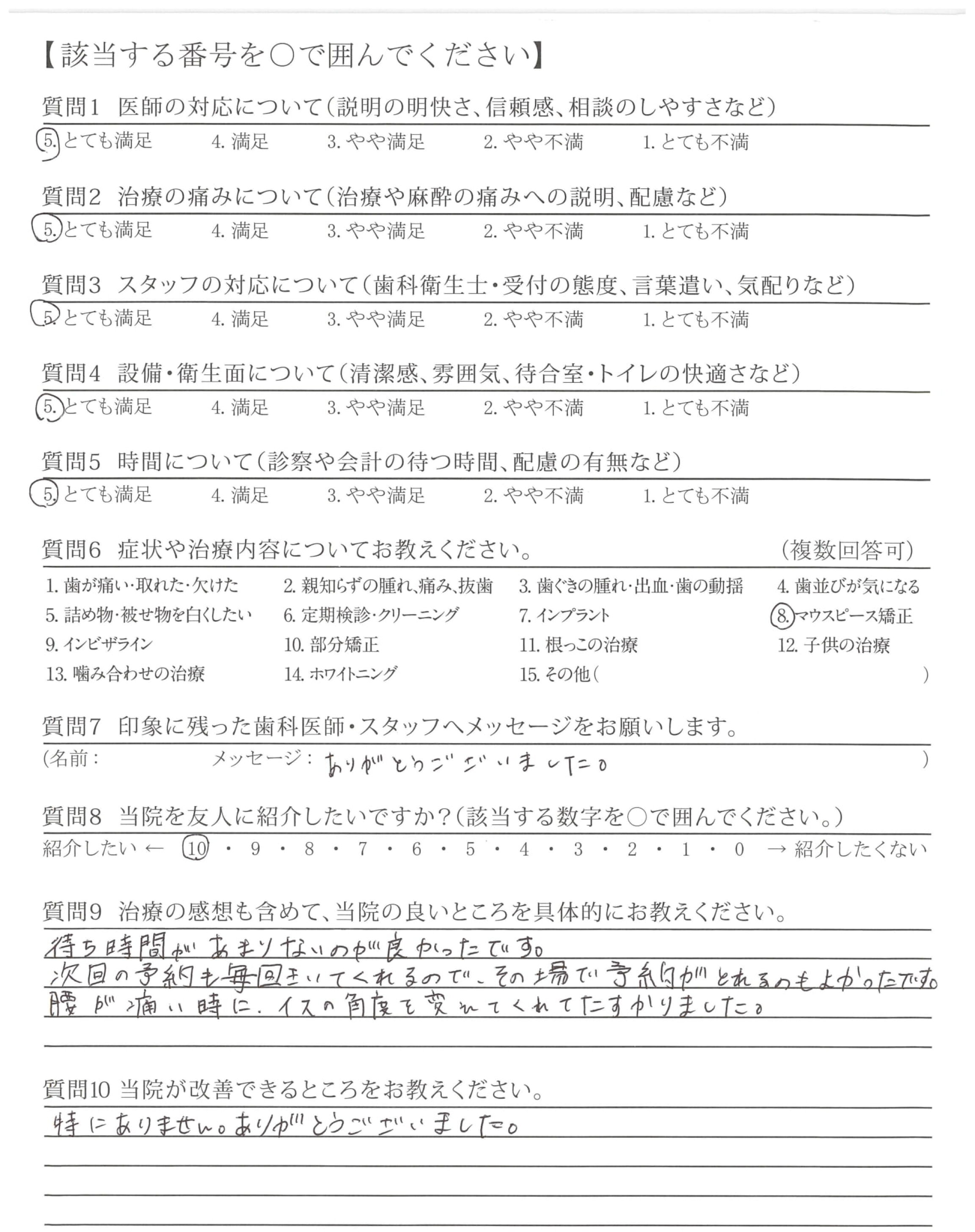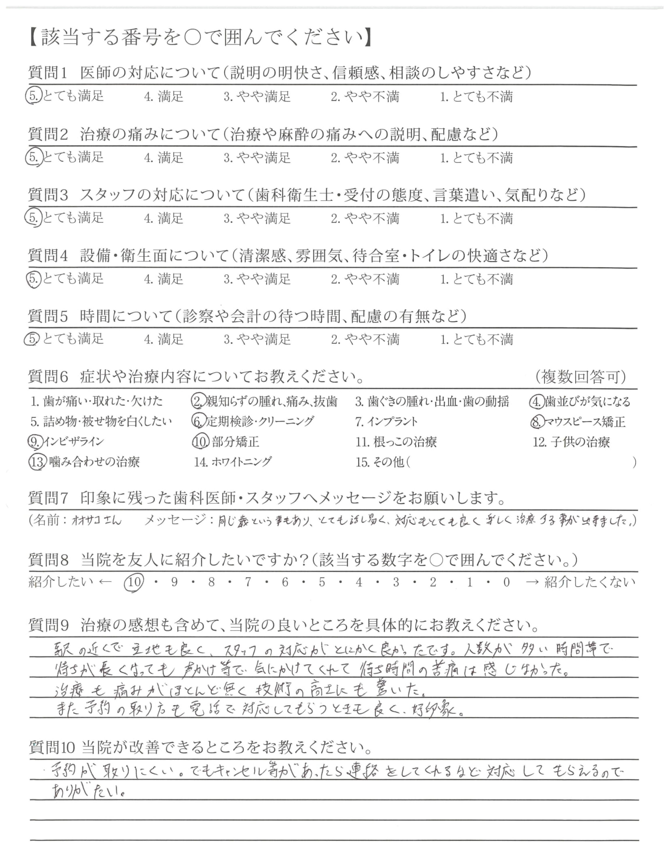 同じ歳という事もあり、とても話し易く、対応もとても良く楽しく治療する事が出来ました。