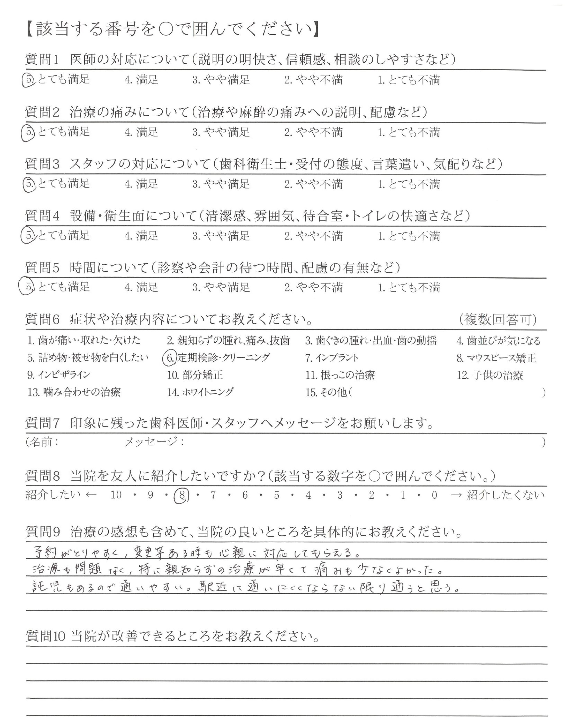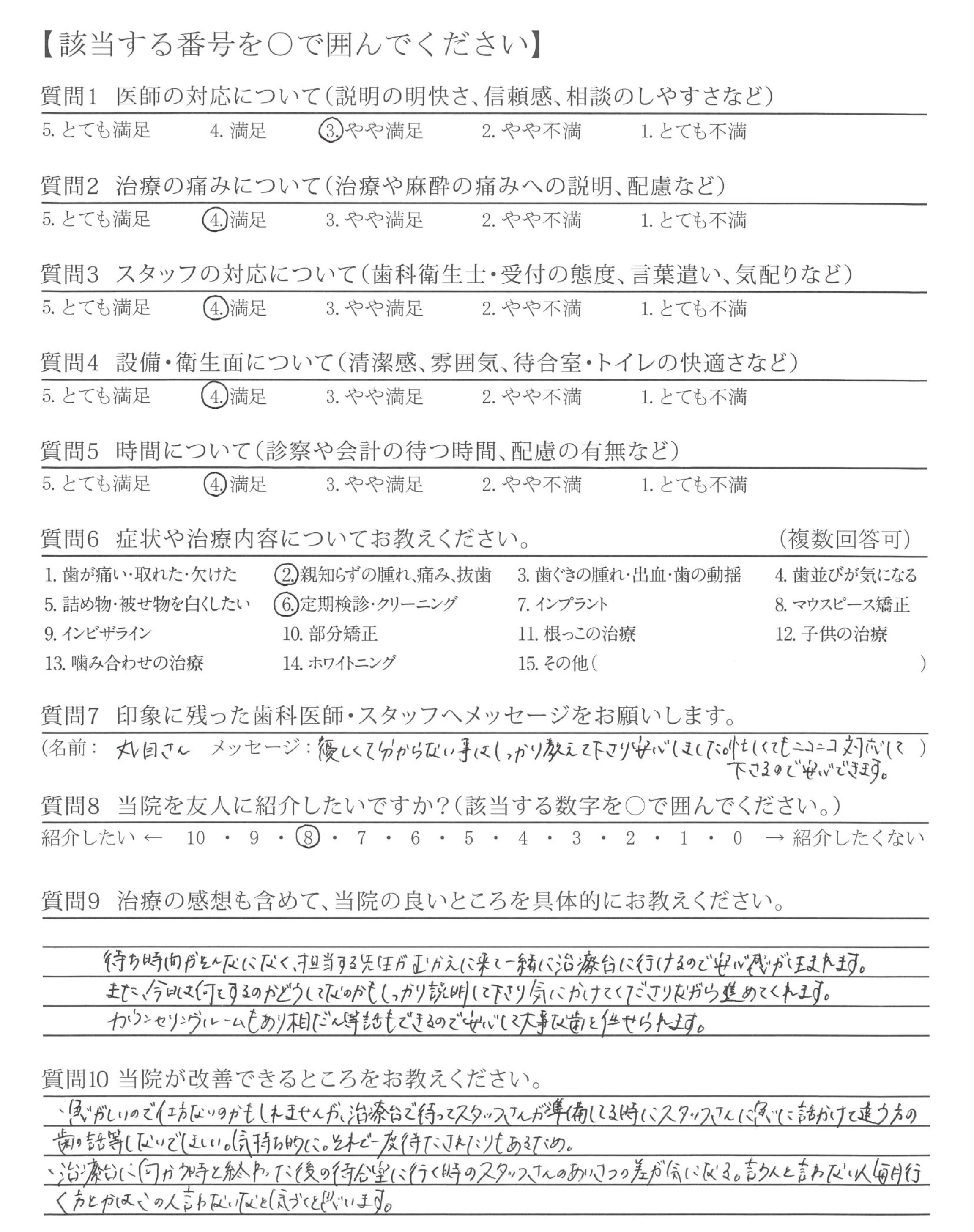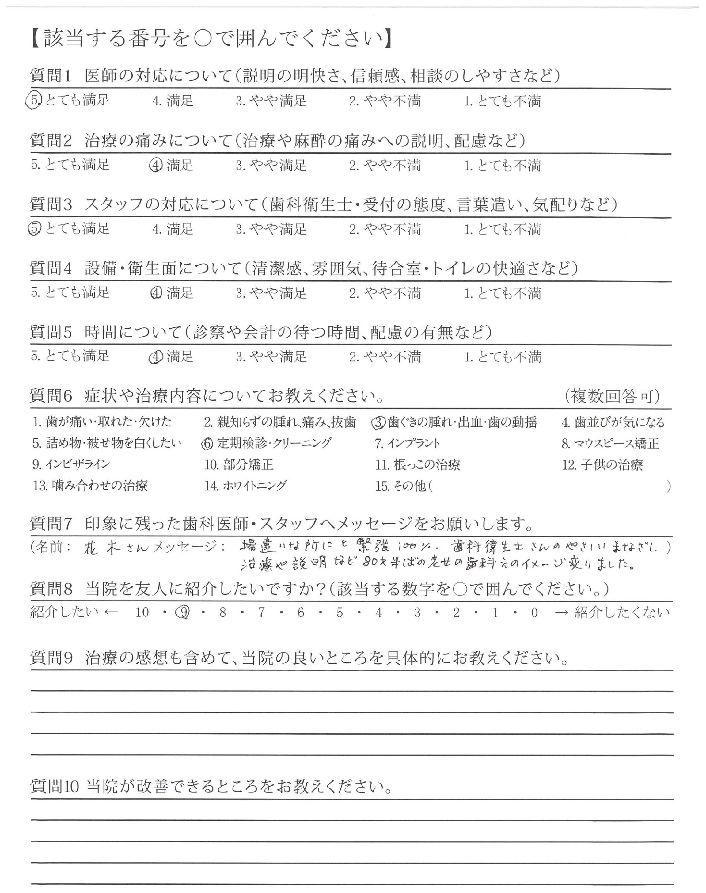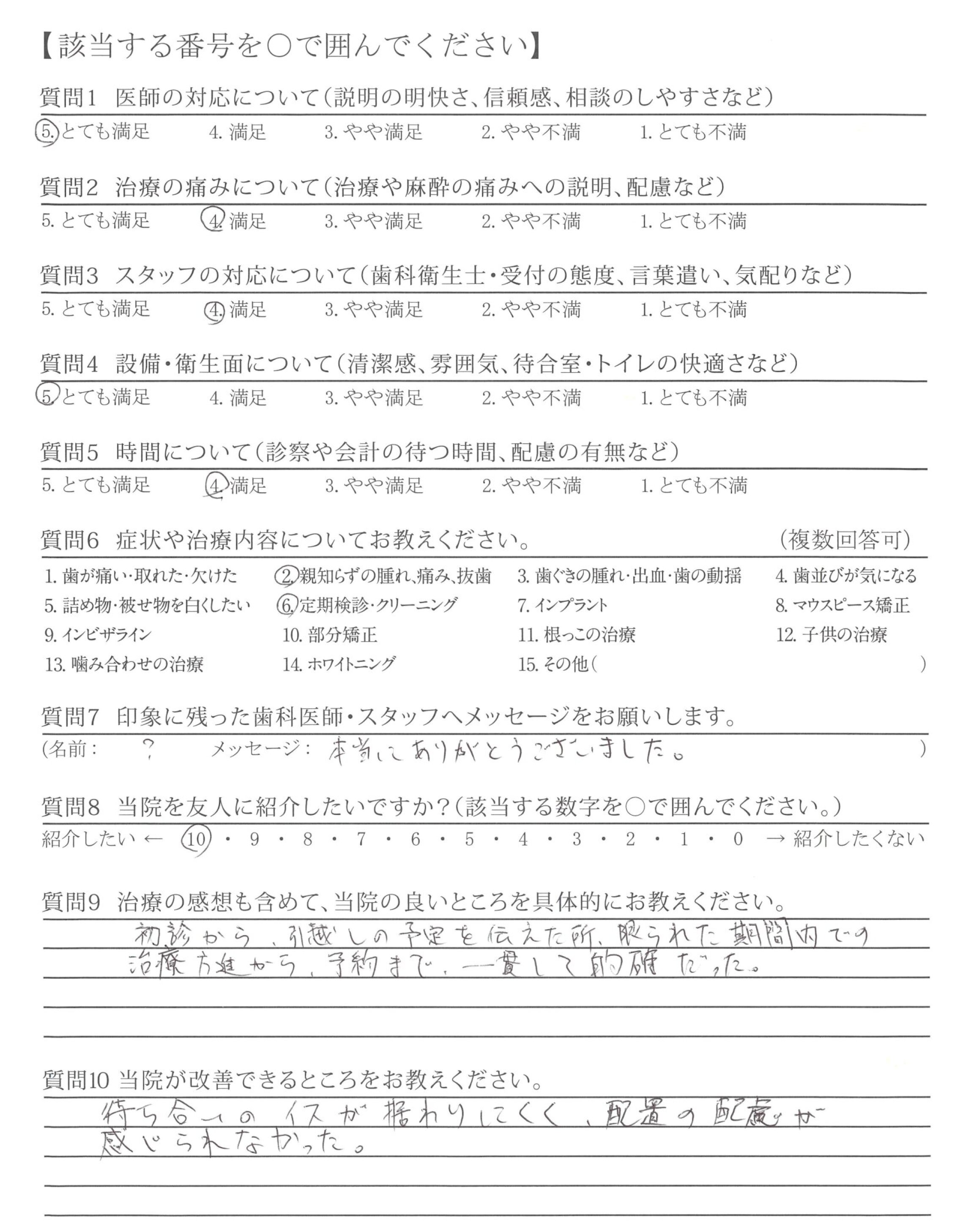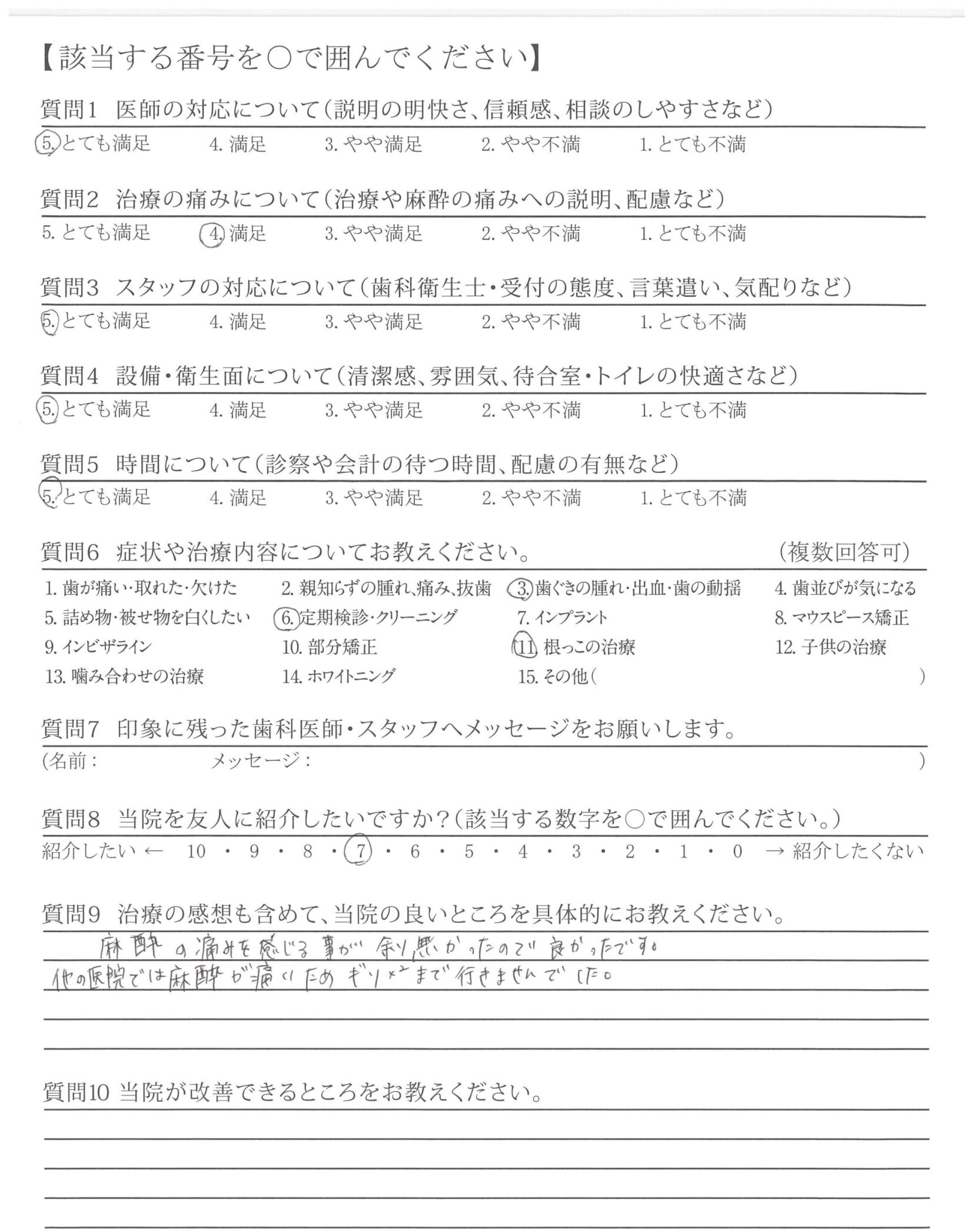 ずいぶん昔にインプラントを他院で入れたことがありますが、貴院では全く痛みは感じられず、いつのまにかインプラントの土台を入れてもらった印象があります。いつもありがとうございます。