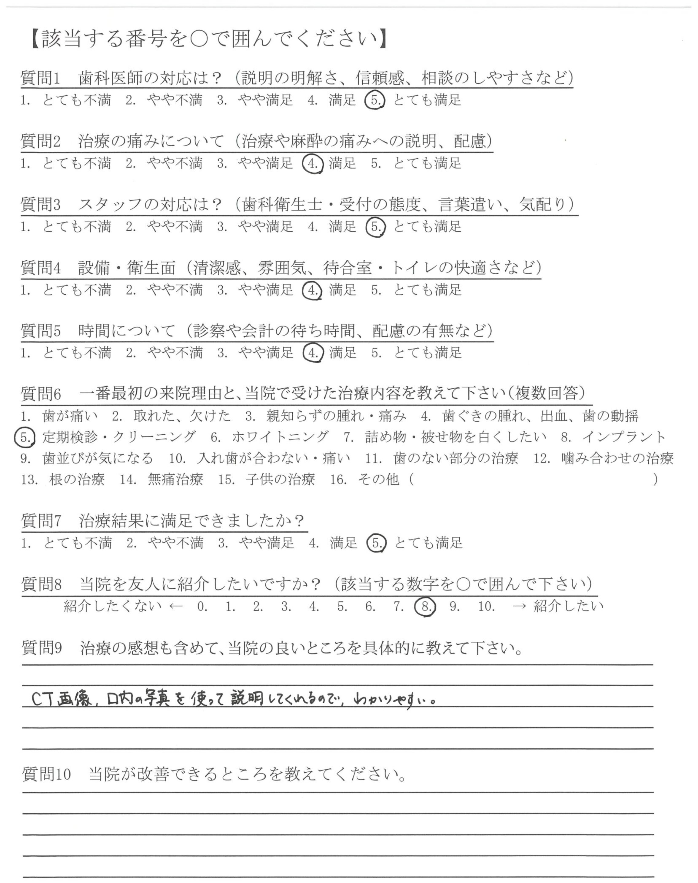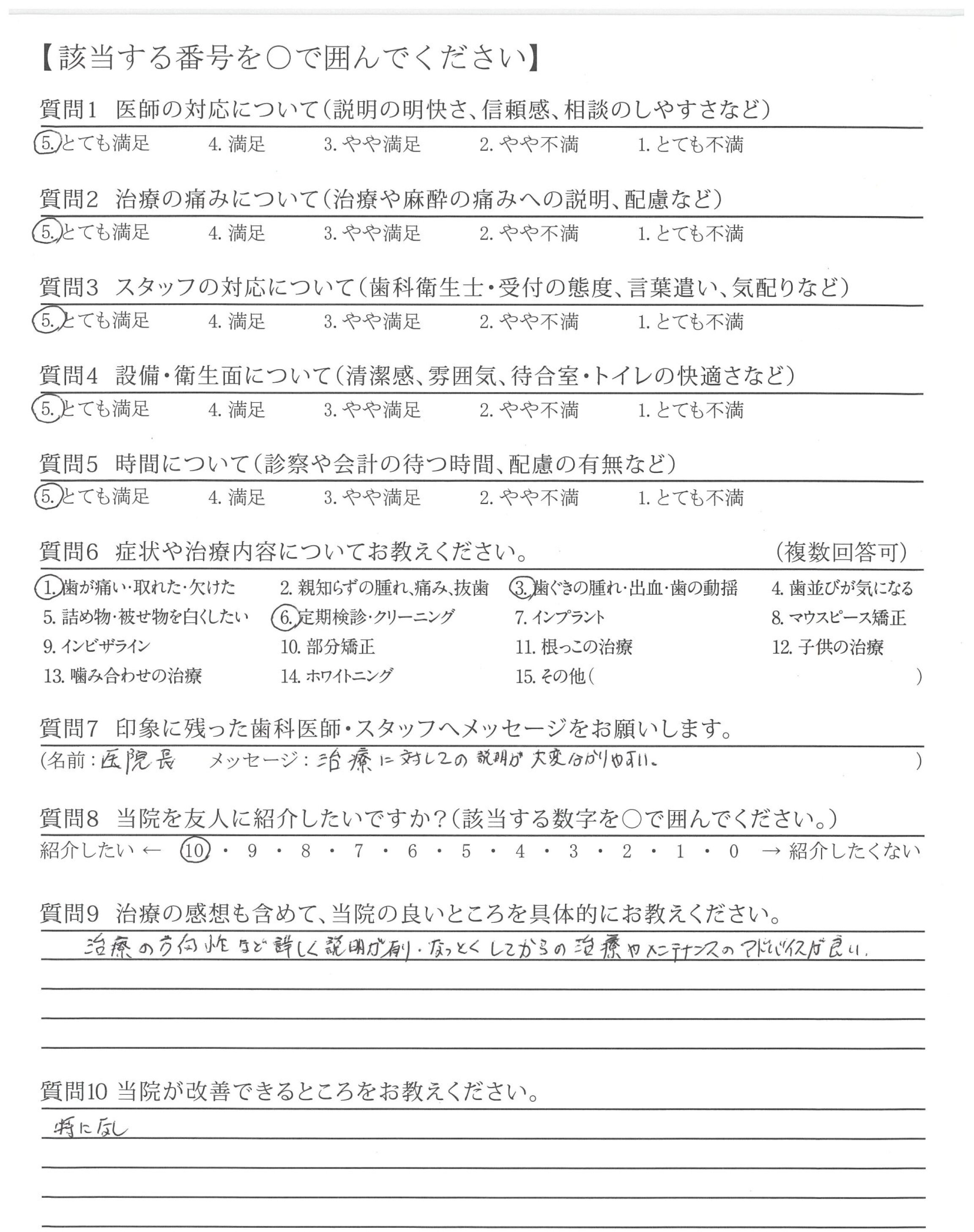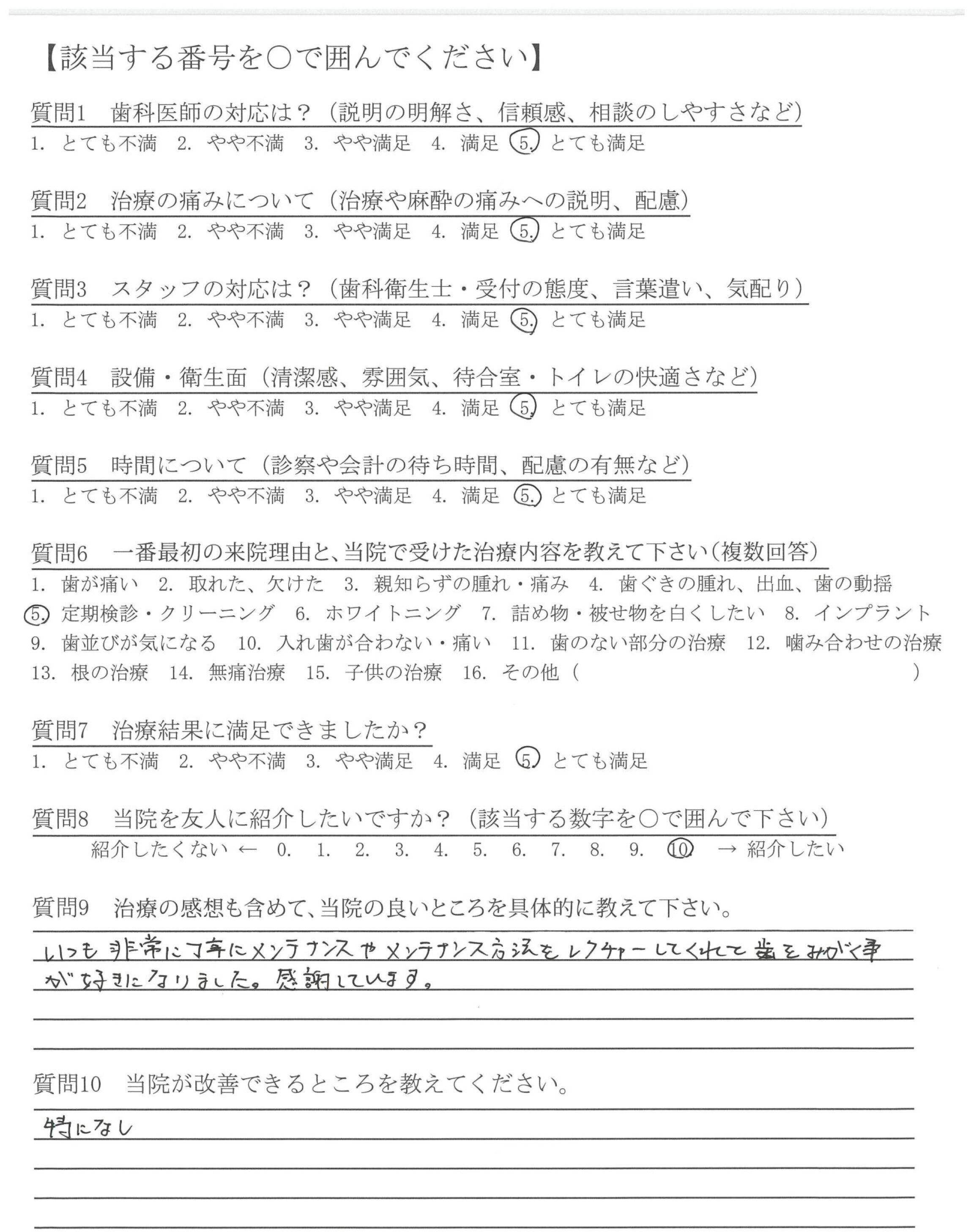 いつも非常に丁寧にメンテナンスやメンテナンス方法をレクチャーしてくれて歯をみがく事が好きになりました。感謝しています。